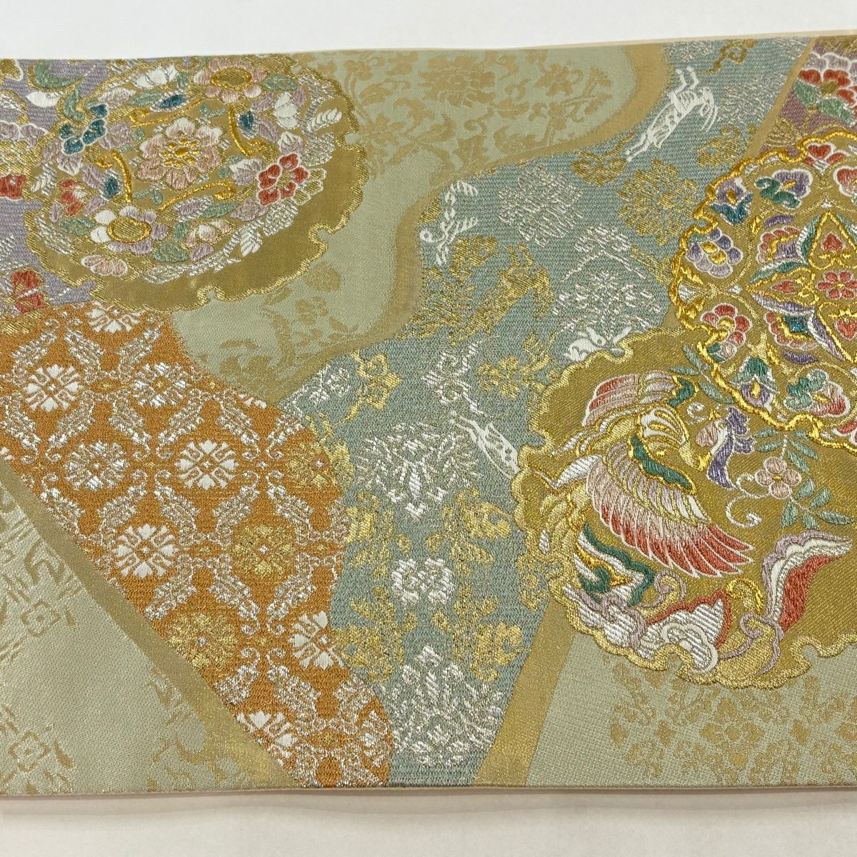 【美品】 袋帯 秀品 雪輪 花鳥 金銀糸 箔 薄緑 六通 正絹