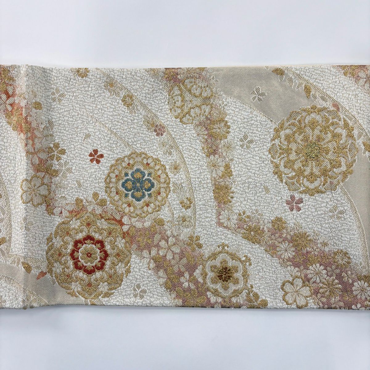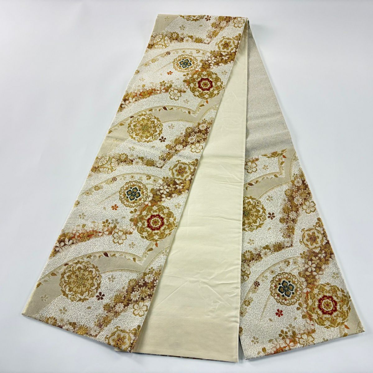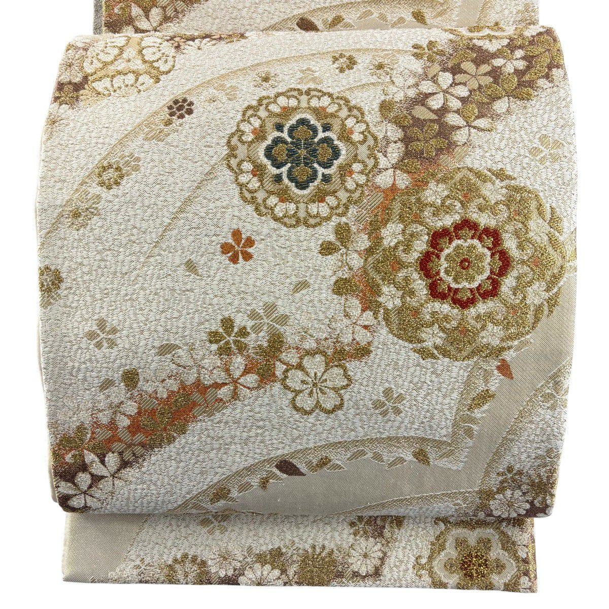 【美品】 袋帯 秀品 華文 桜 箔 金糸 クリーム 六通 正絹