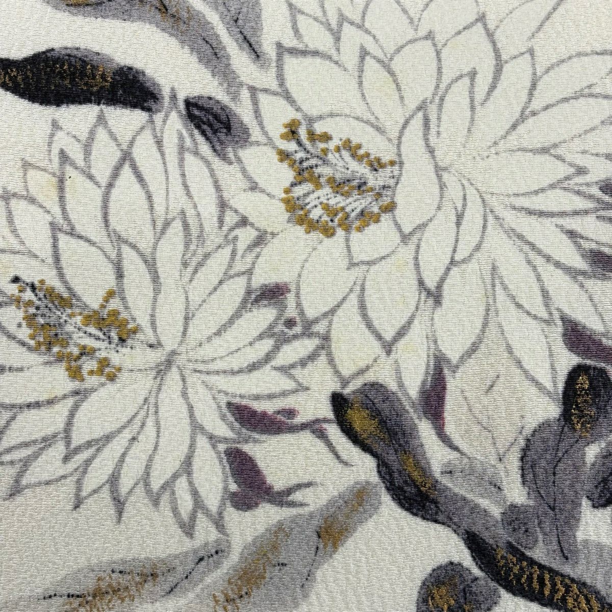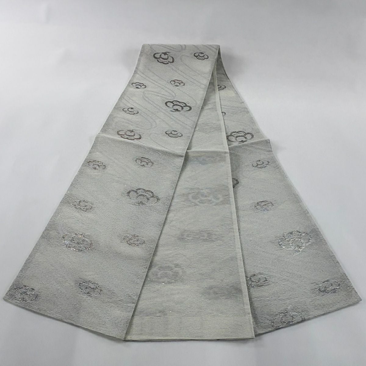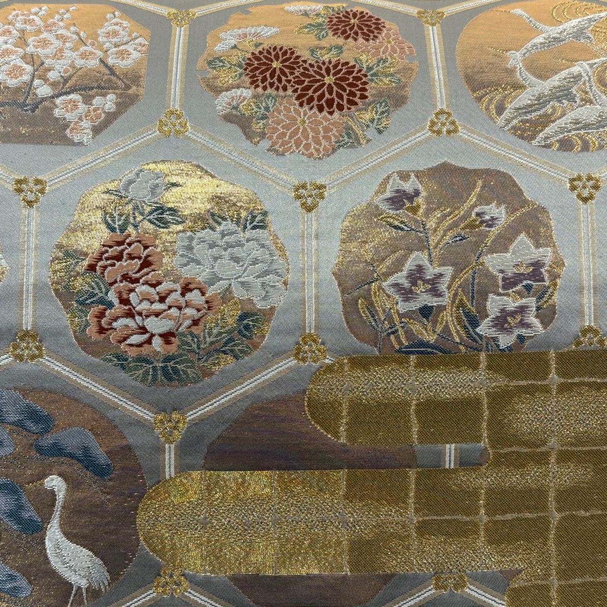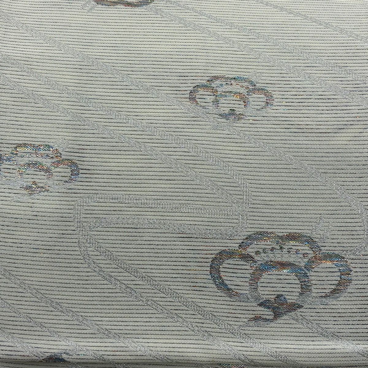 【美品】 名古屋帯 秀品 雪輪 草花 刺繍 金銀糸 灰白 正絹