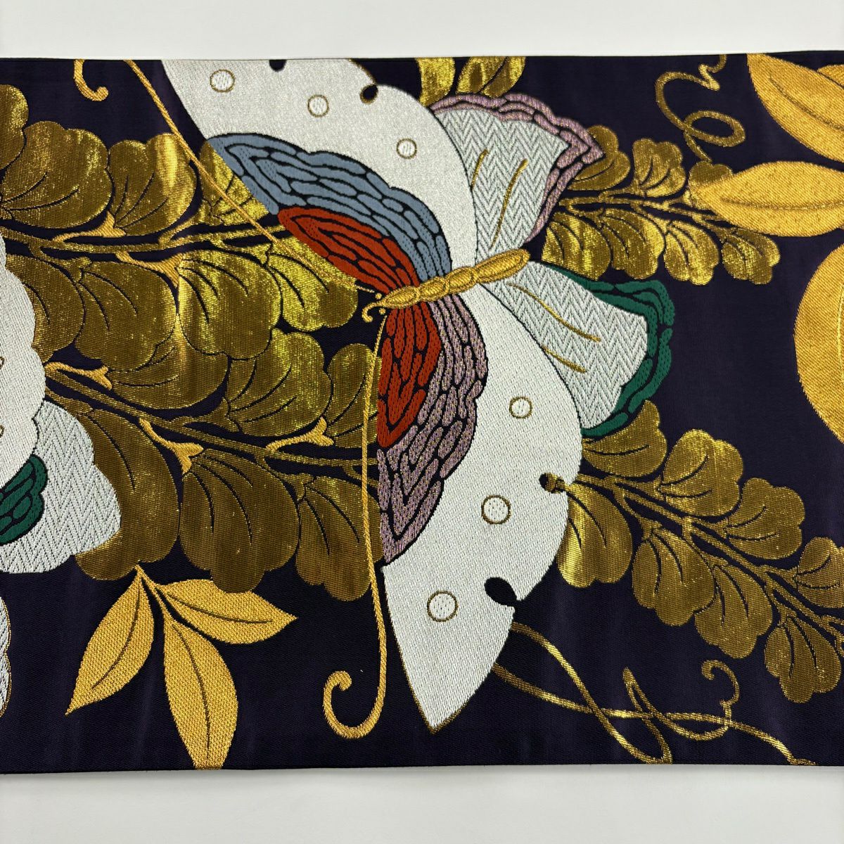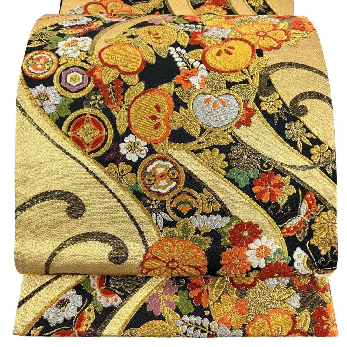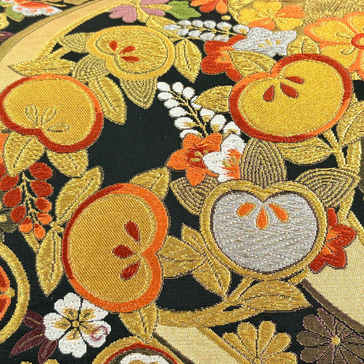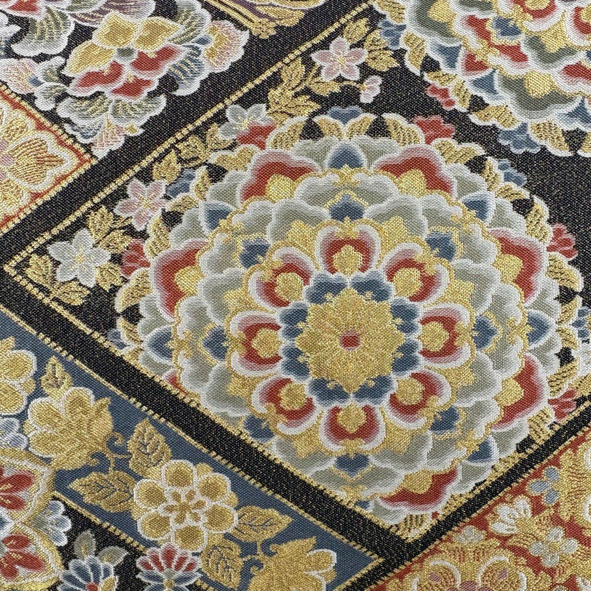 袋帯 秀品 振袖向き 花丸文 花蝶 金銀糸 唐織 黒 六通 正絹