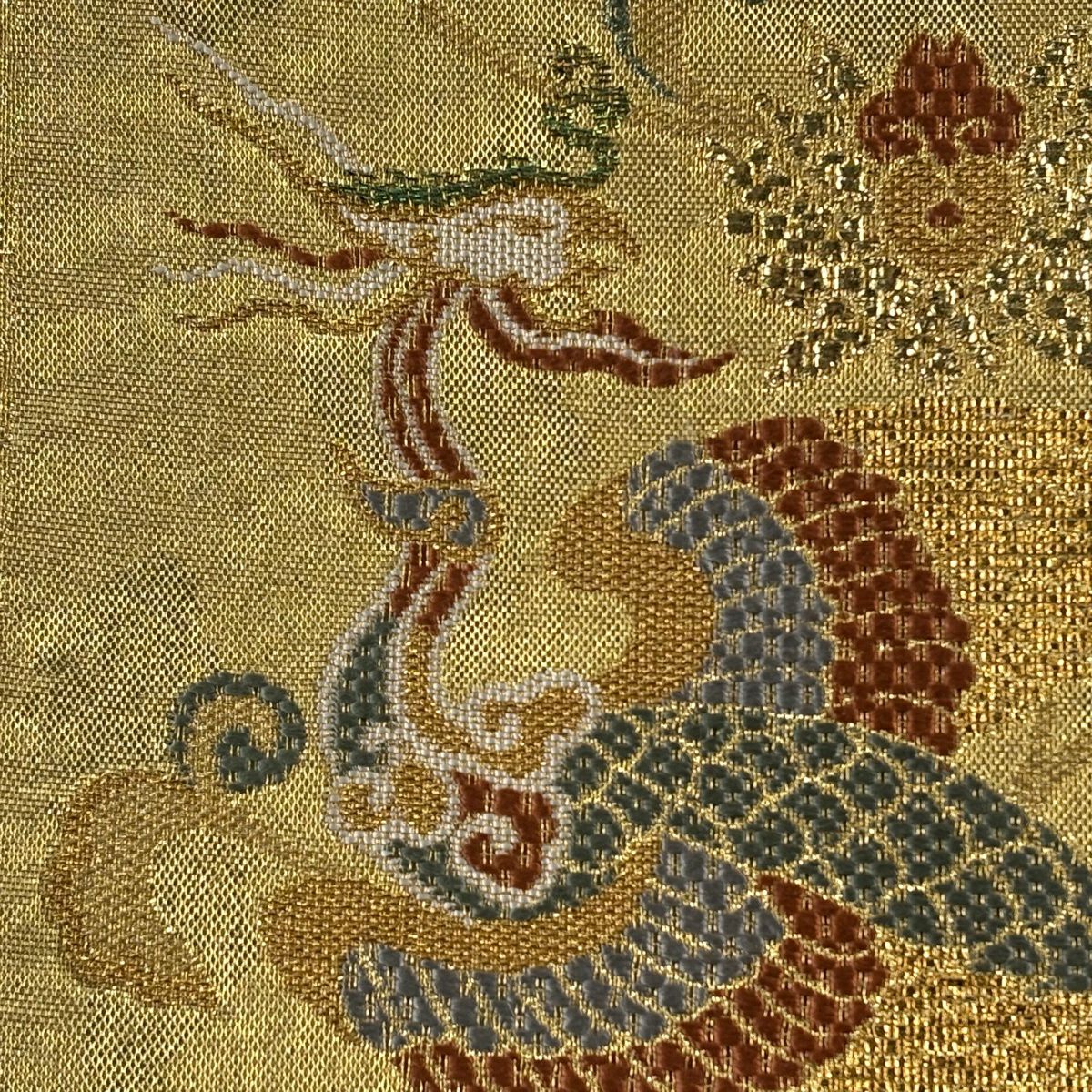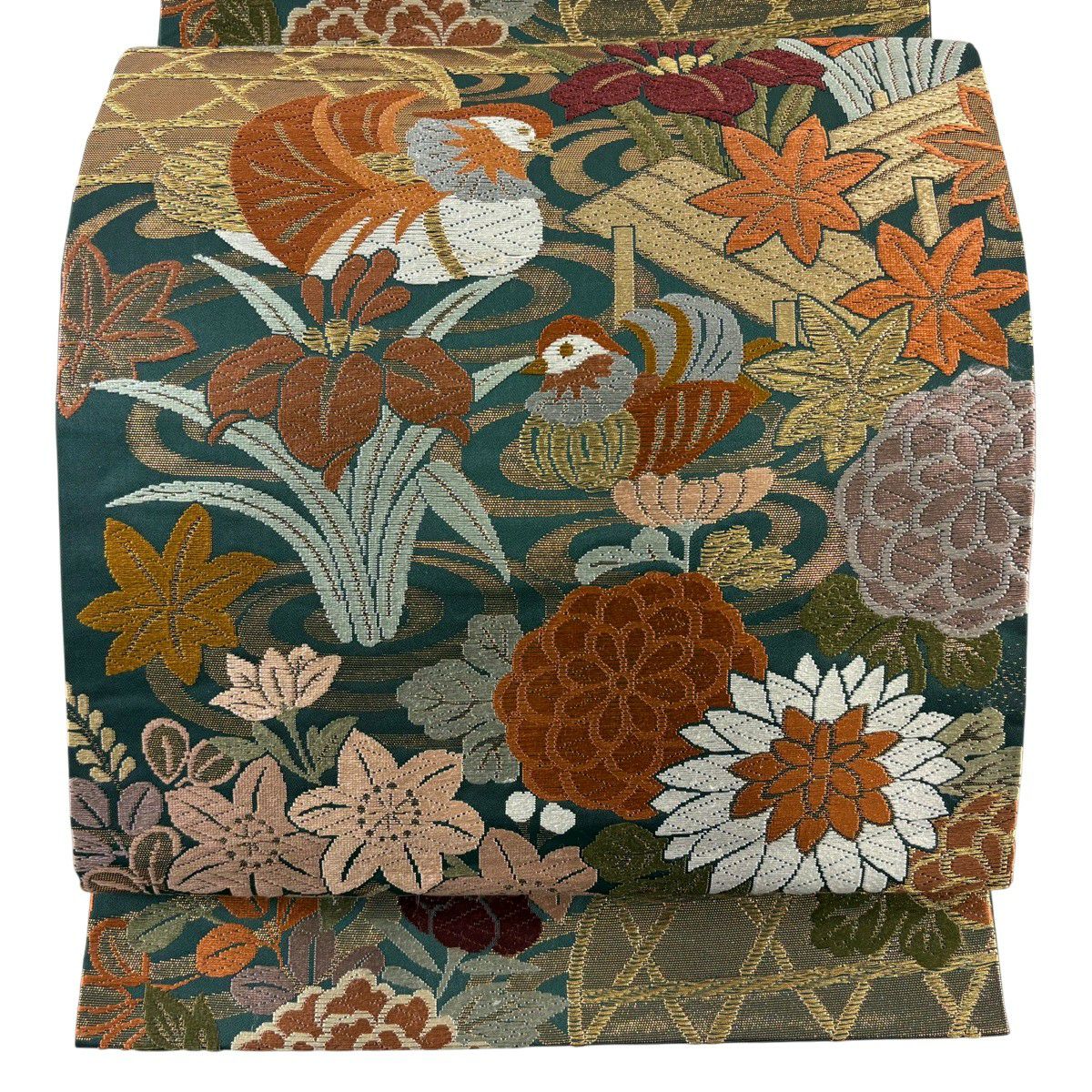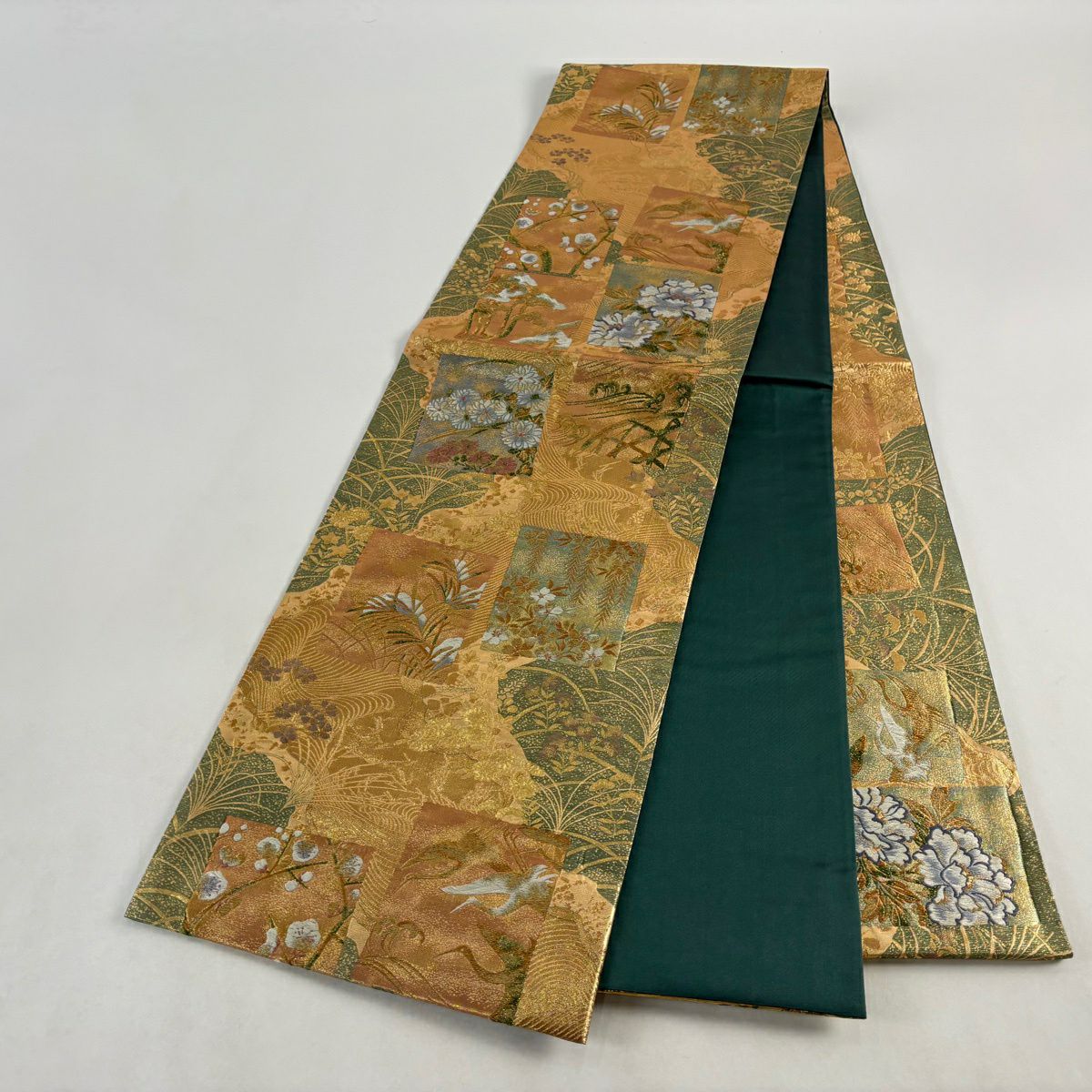 【美品】 袋帯 秀品 宝尽くし 鳥 箔 唐織 青緑 六通 正絹