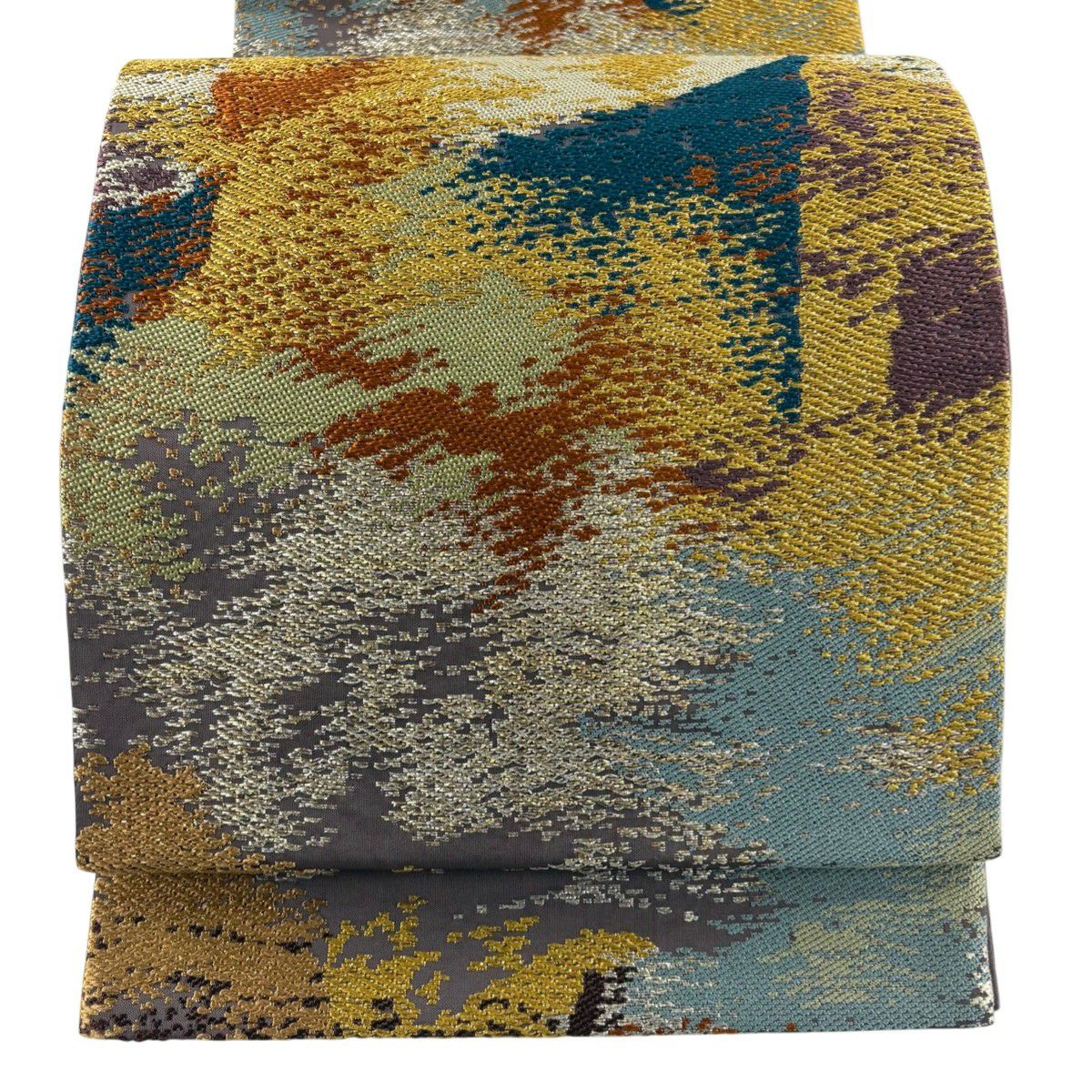 袋帯 秀品 辻が花 纈幡織 草花 雪輪 箔 茶緑色 六通 正絹