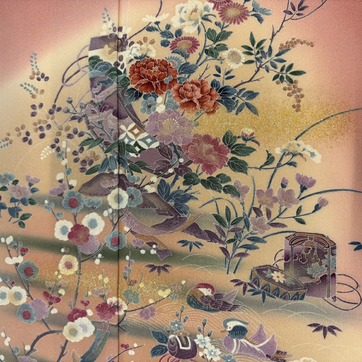 62%OFF 訪問着 身丈161cm 裄丈64cm M 袷 建物 菊 刺繍 金糸 サーモンピンク 正絹 秀品 K50