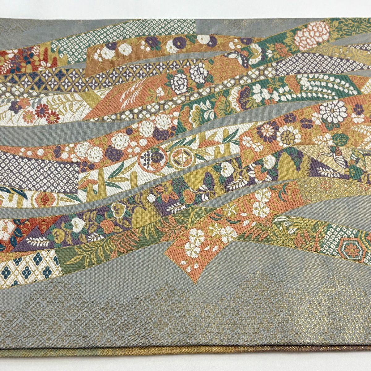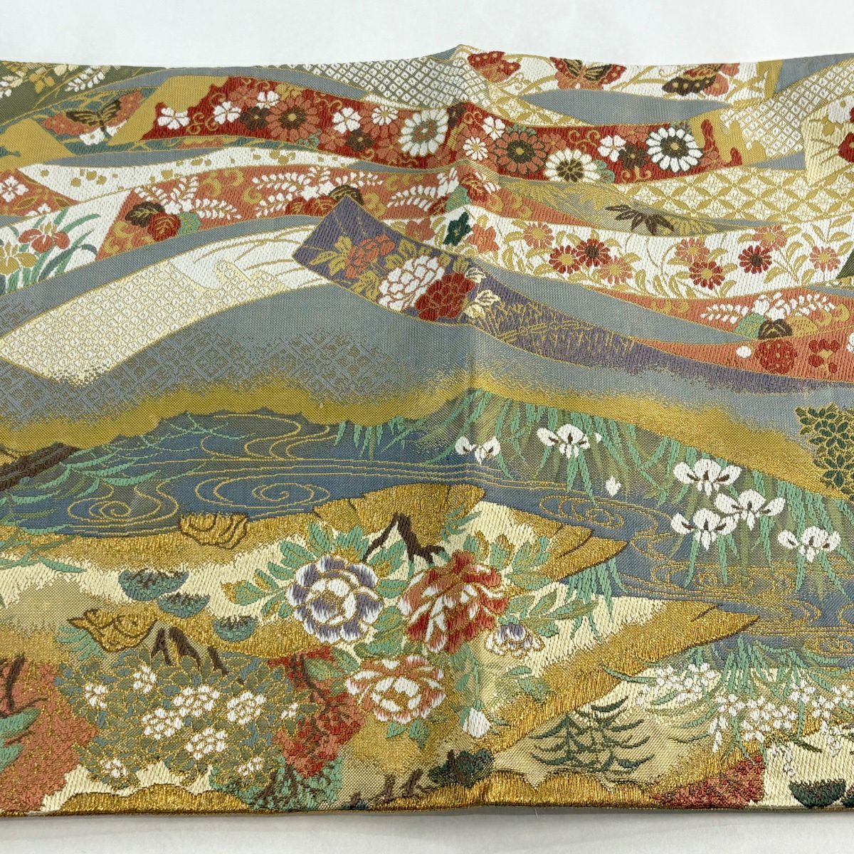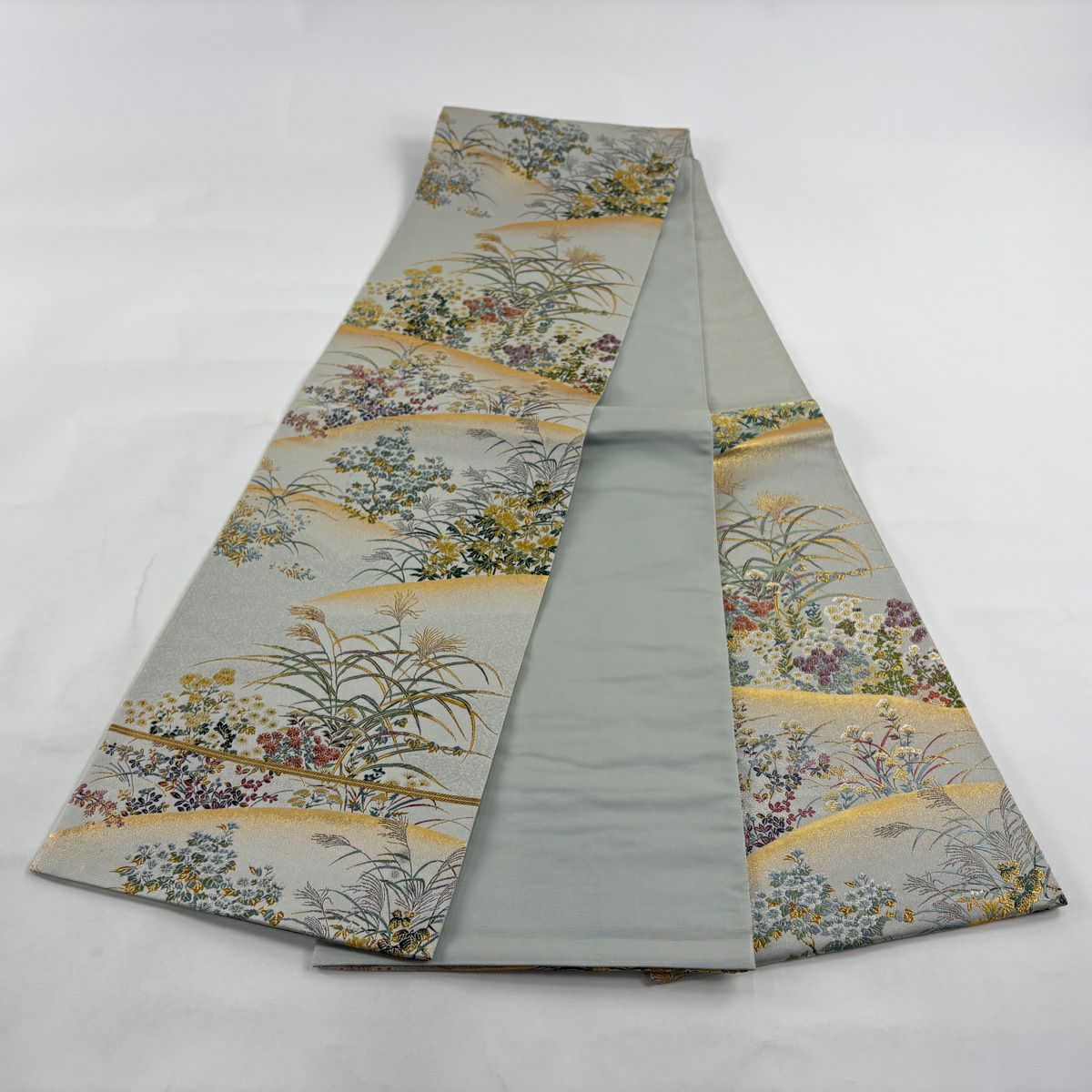 【美品】 袋帯 秀品 秋草 山並み 金糸 箔 灰緑 六通 正絹