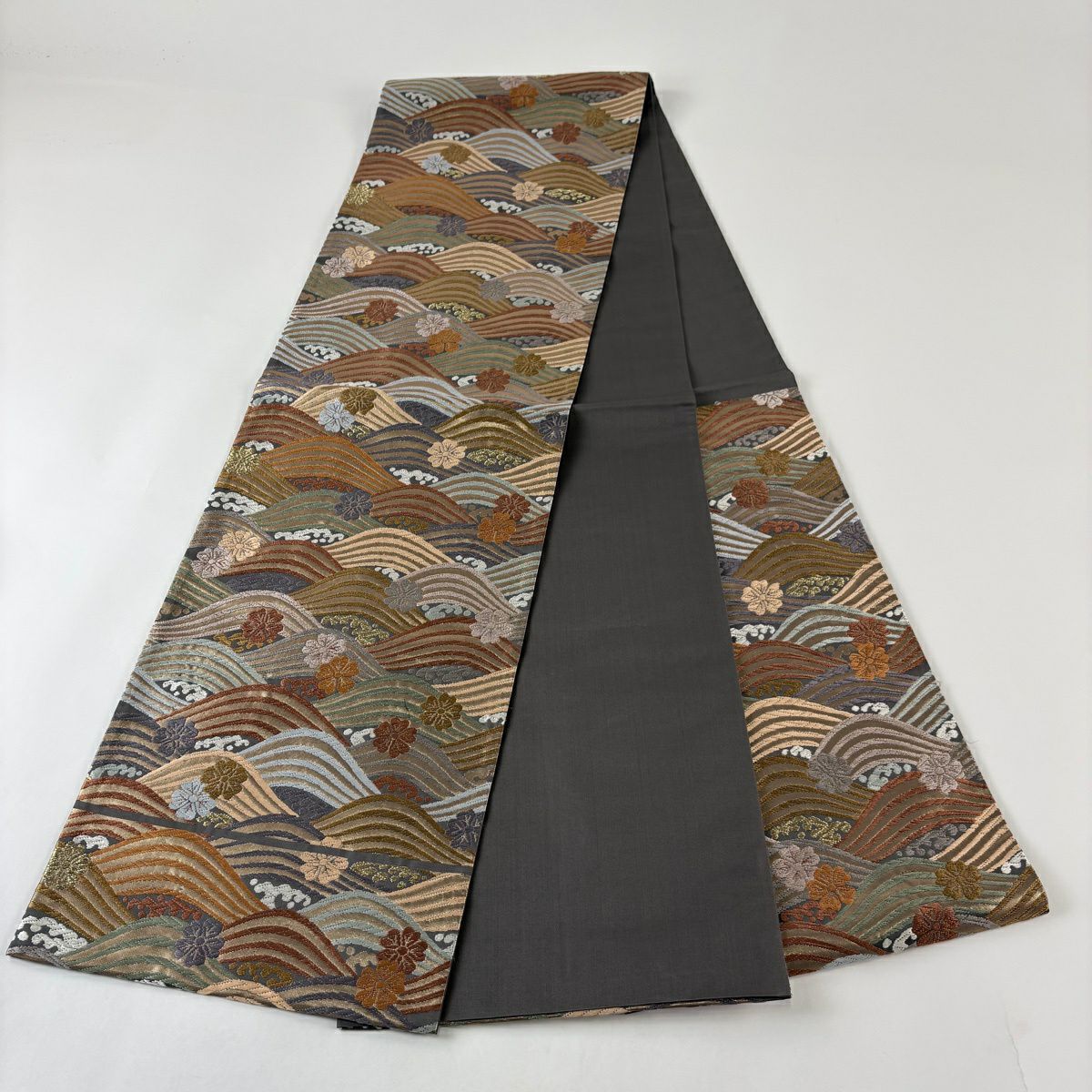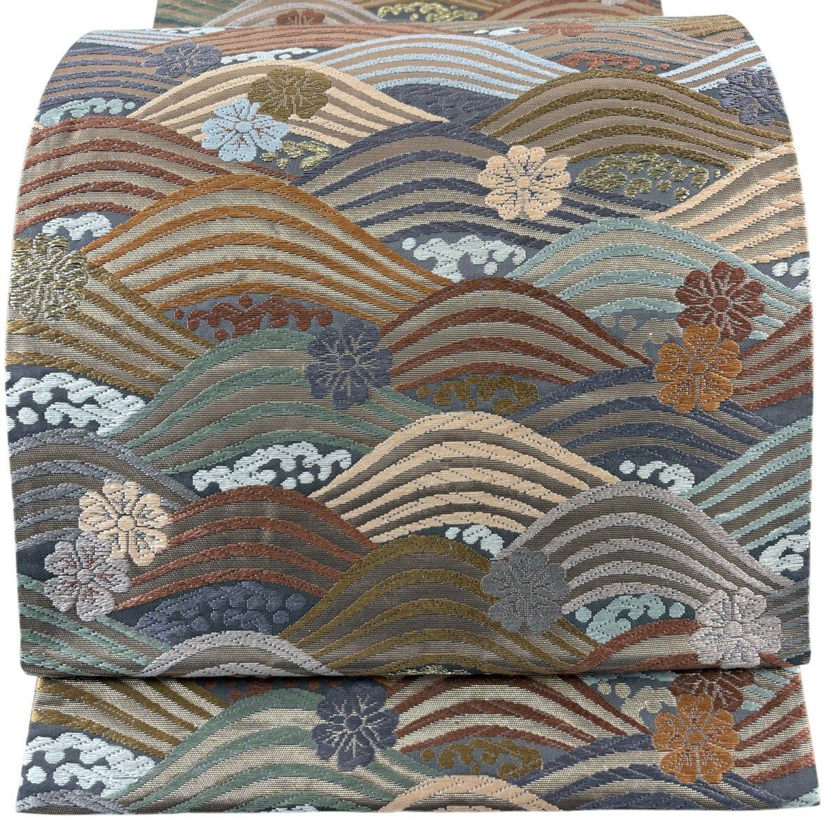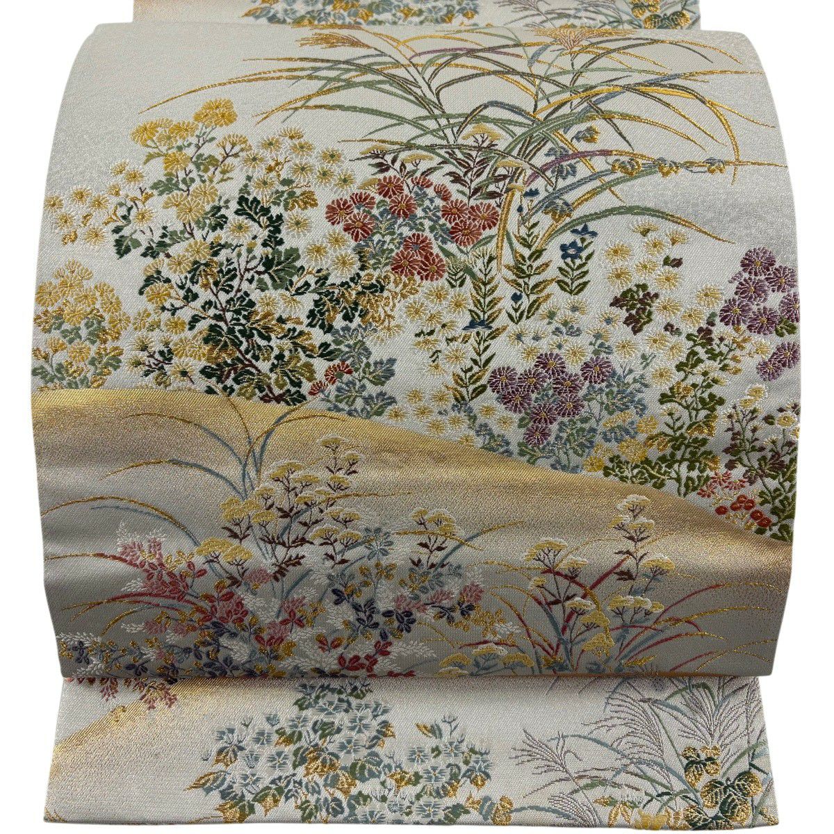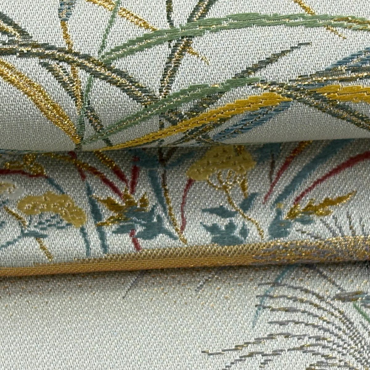 【美品】 袋帯 秀品 秋草 山並み 金糸 箔 灰緑 六通 正絹