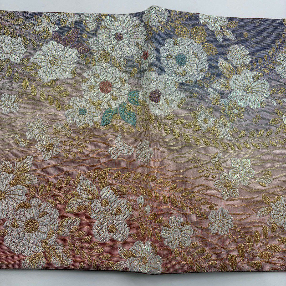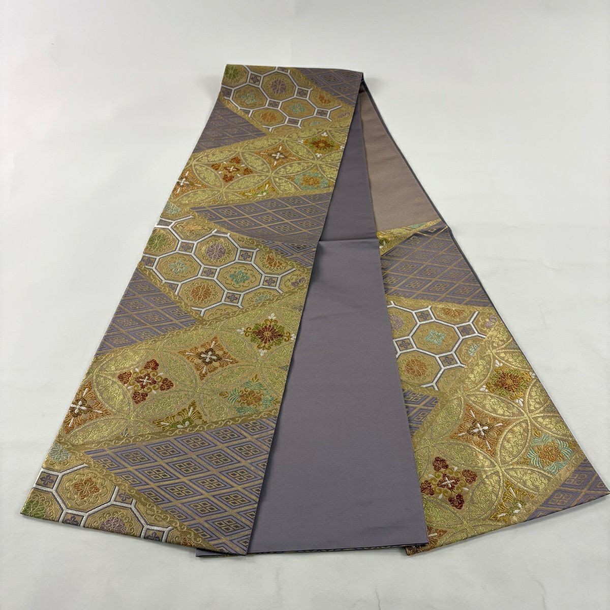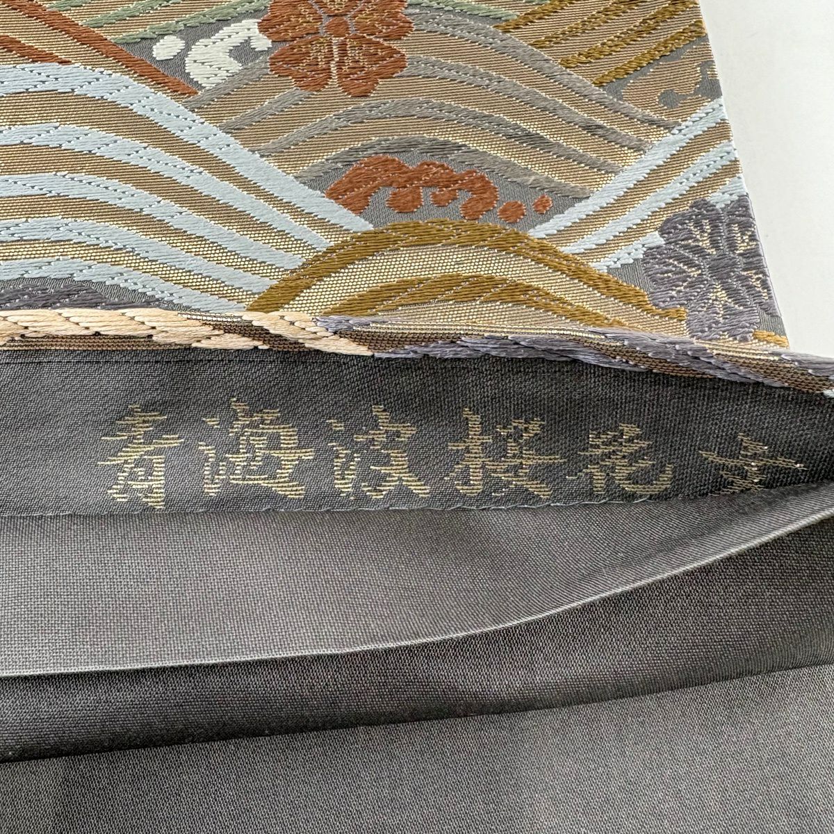 【美品】 袋帯 秀品 青海波桜花文 唐織 箔 灰紫 六通 正絹
