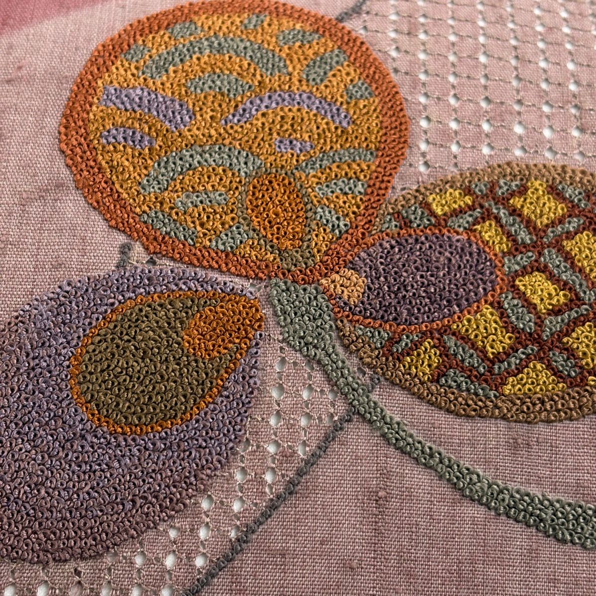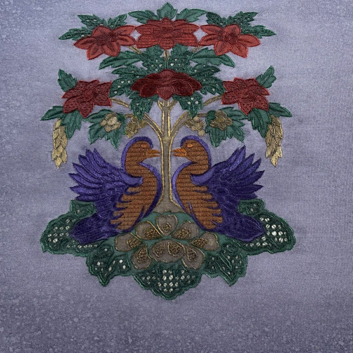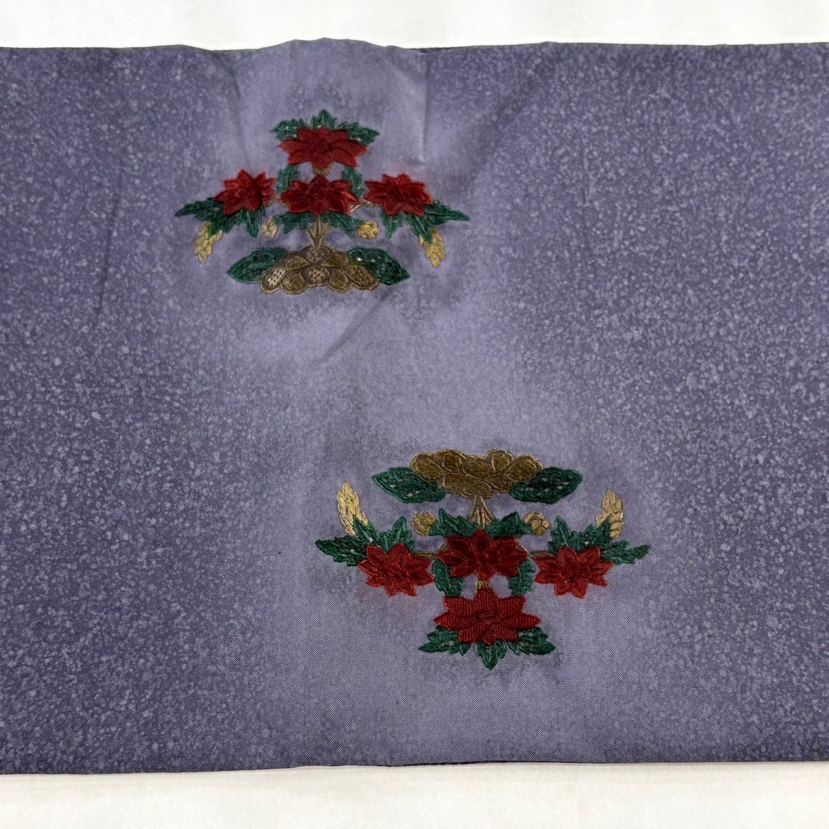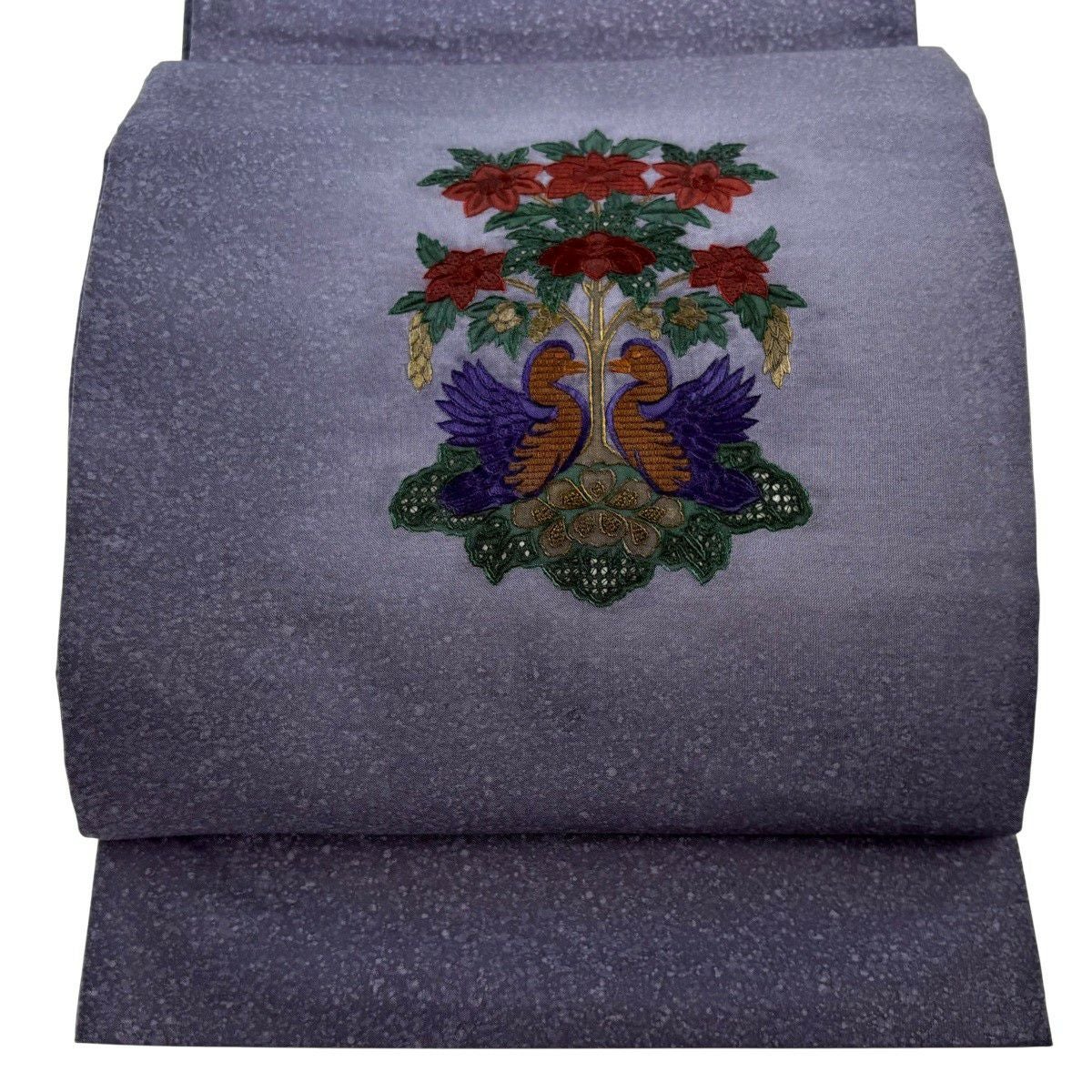 袋帯 秀品 向かい鳥 草花 刺繍 ぼかし 青紫 お太鼓柄 正絹