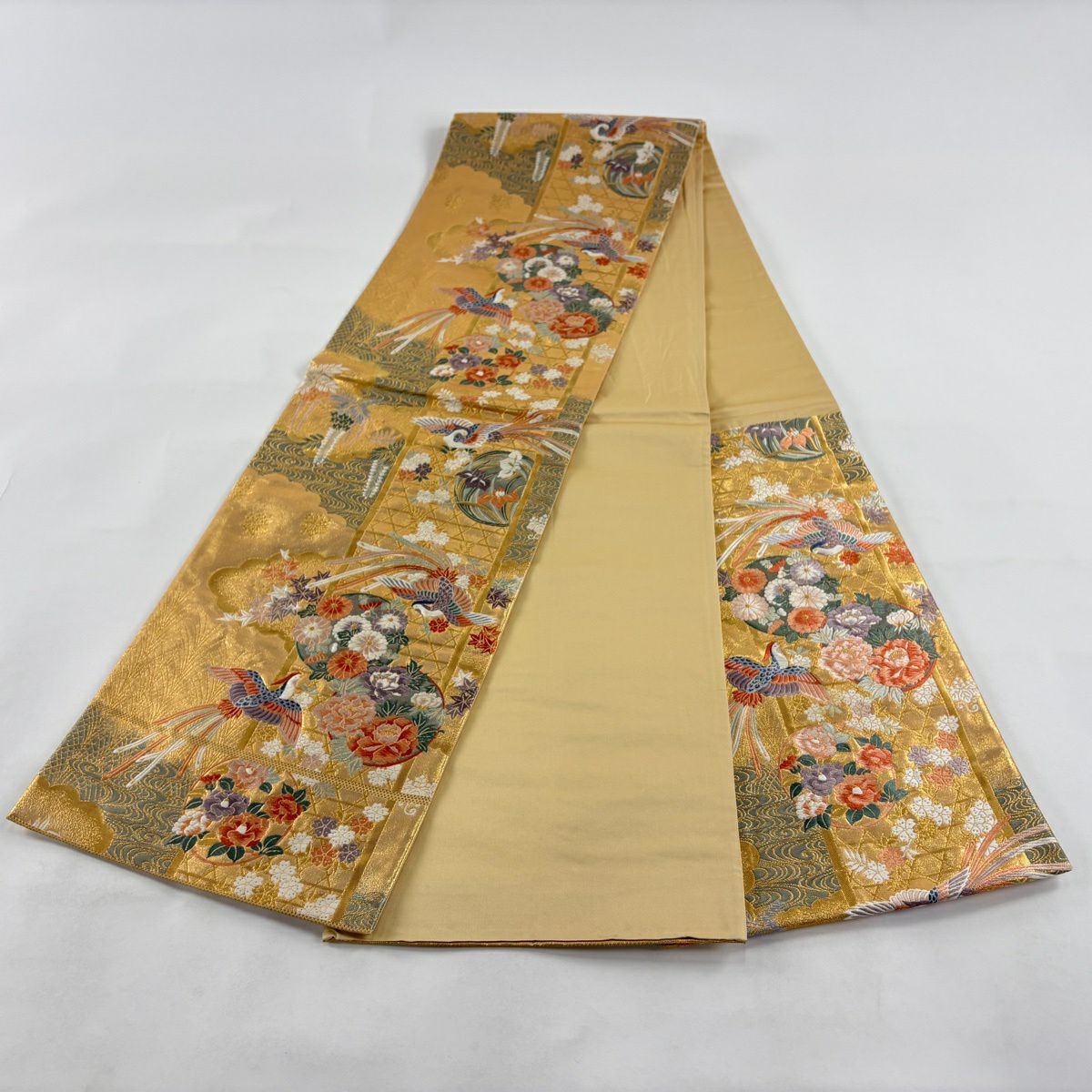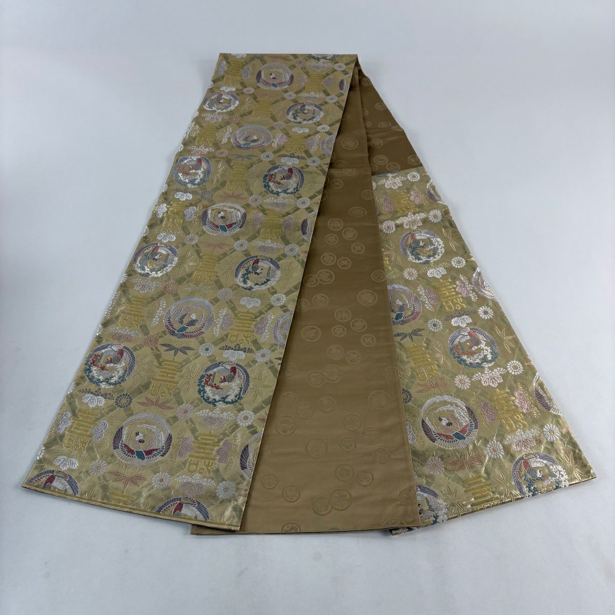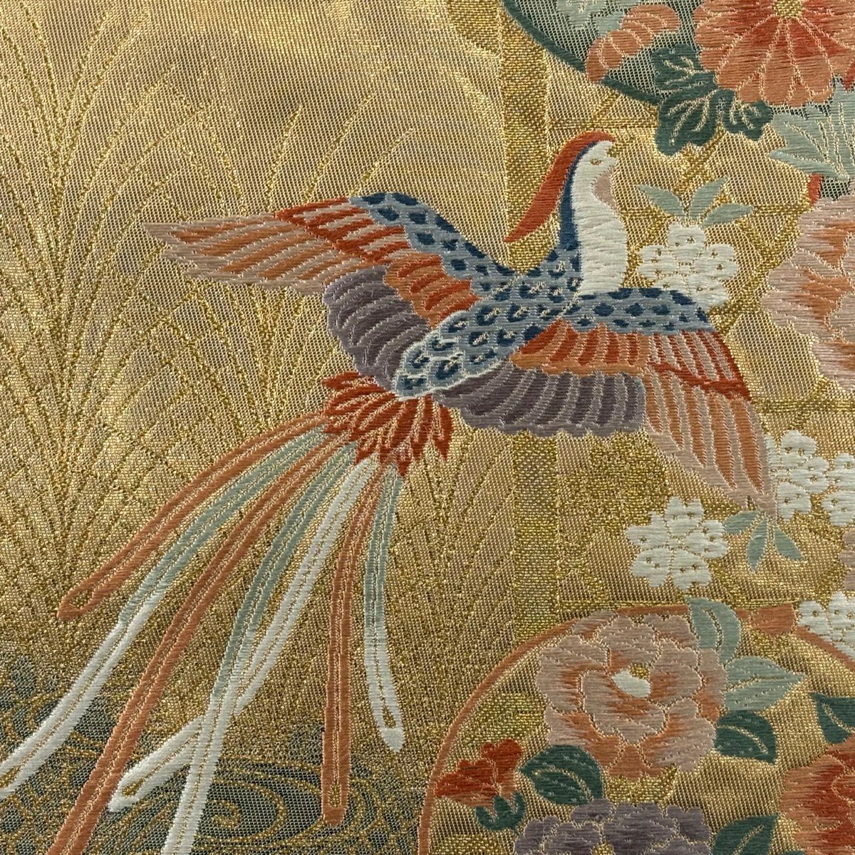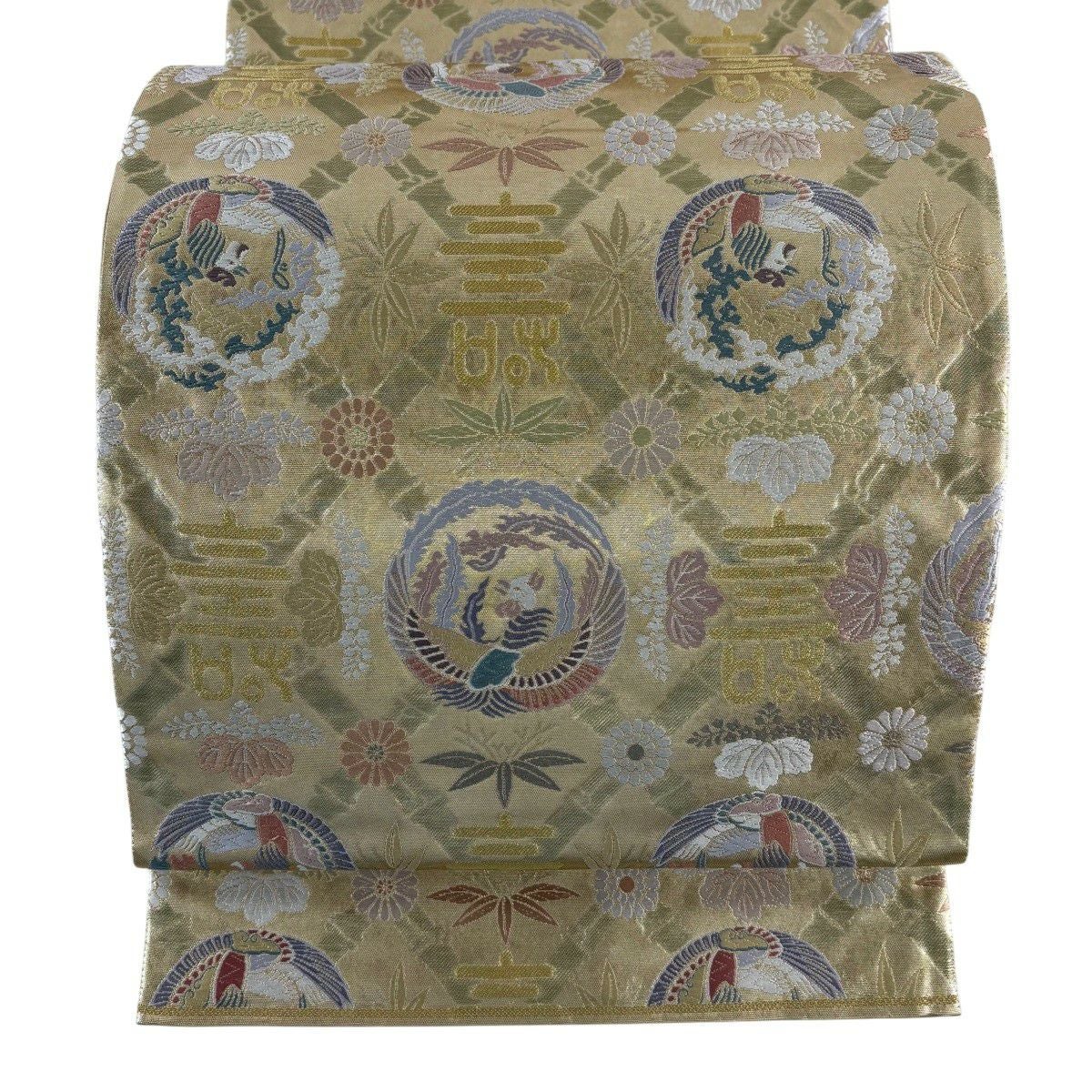 袋帯 秀品 関西仕立て 鳳凰 花丸文 金糸 箔 金色 六通 正絹