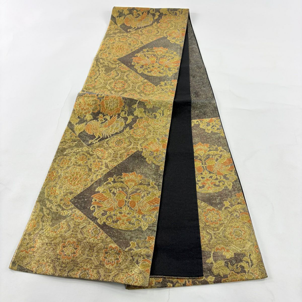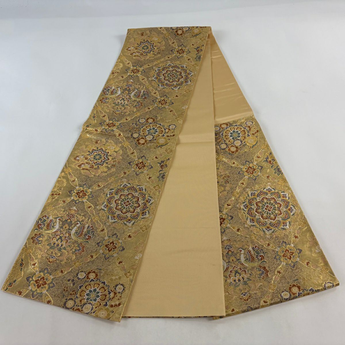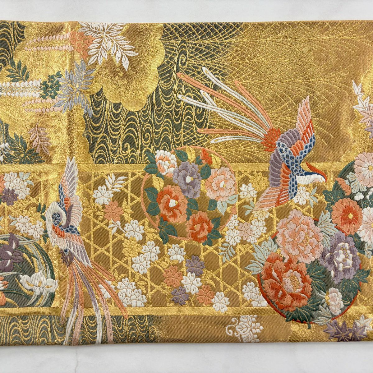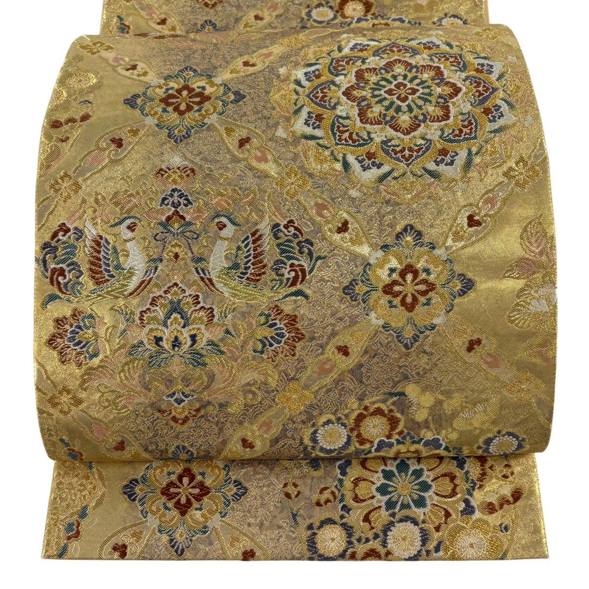 袋帯 秀品 関西仕立て 鳳凰 花丸文 金糸 箔 金色 六通 正絹