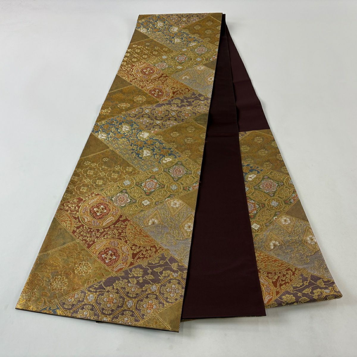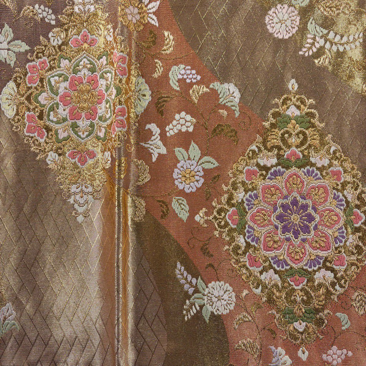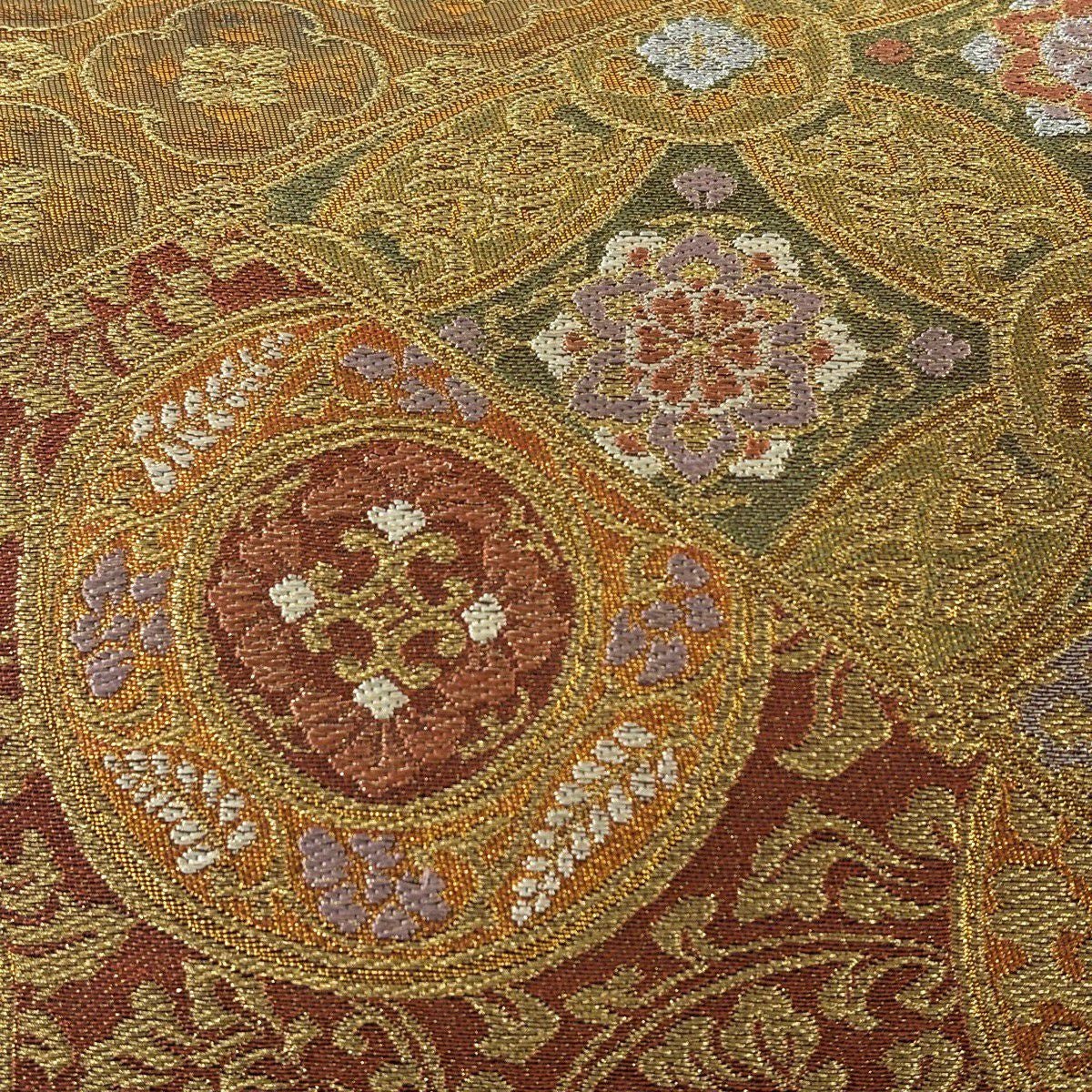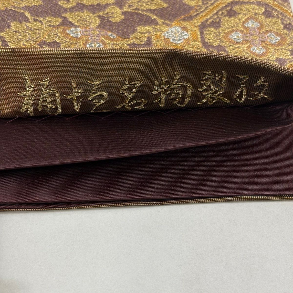 【美品】 袋帯 秀品 華文 草花 箔 金糸 小豆色 六通 正絹