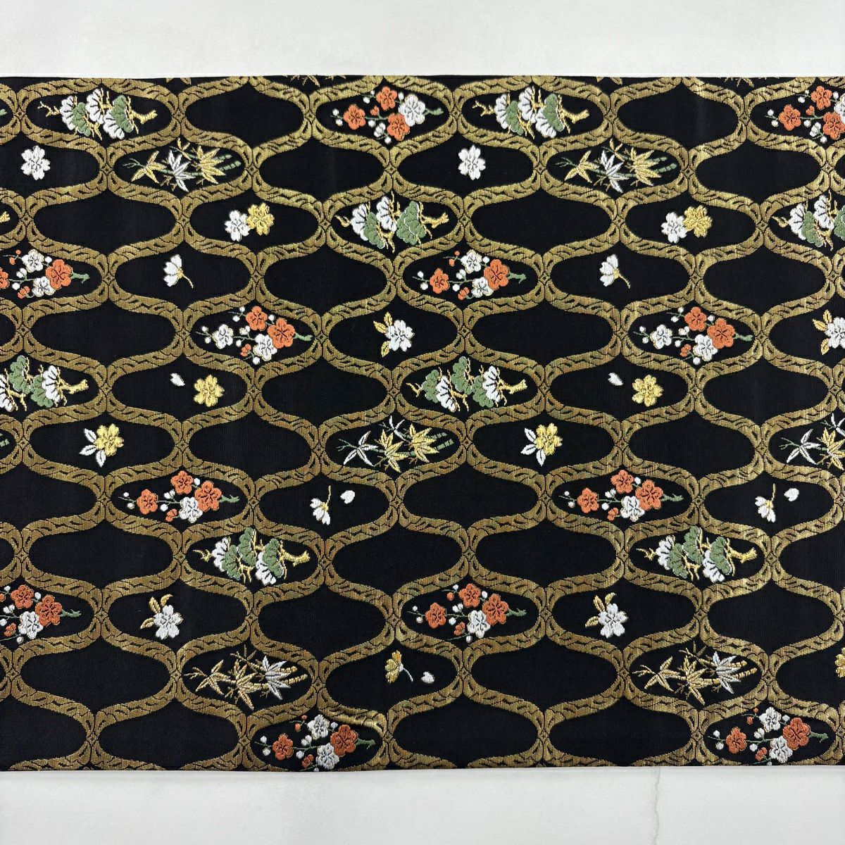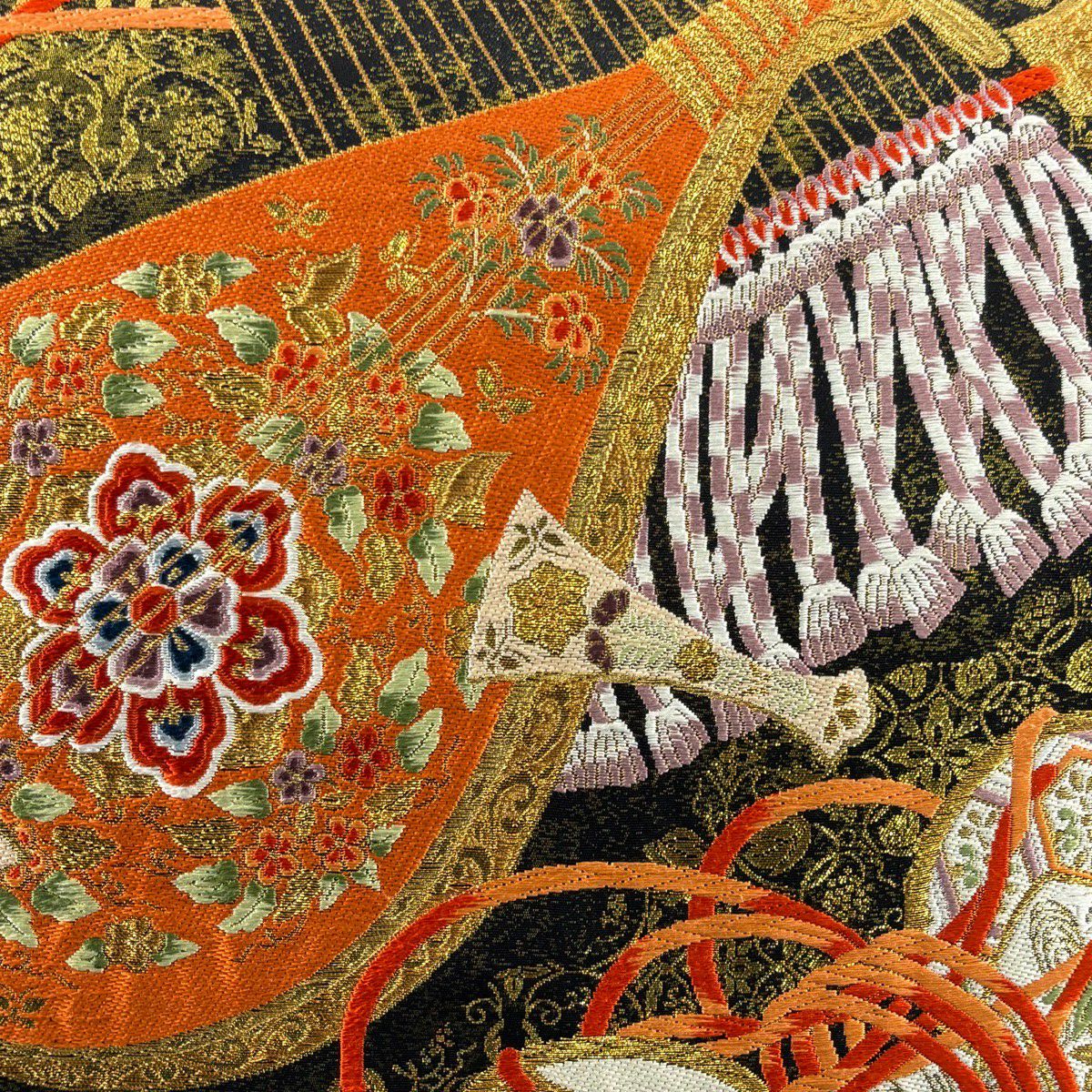【美品】 袋帯 秀品 和楽器 草花 刺繍 金糸 黒 六通 正絹