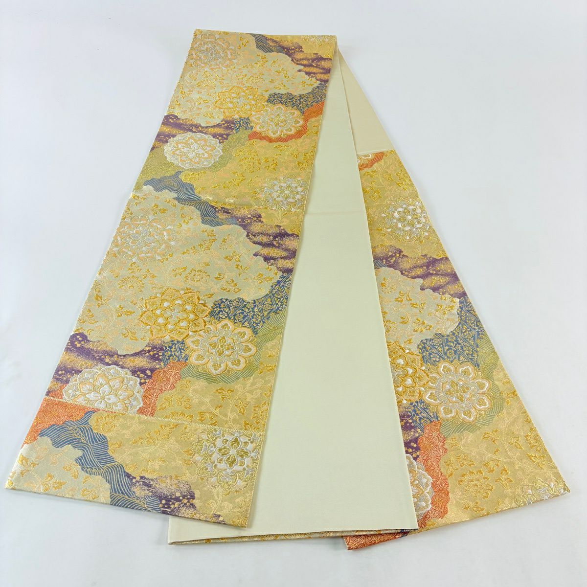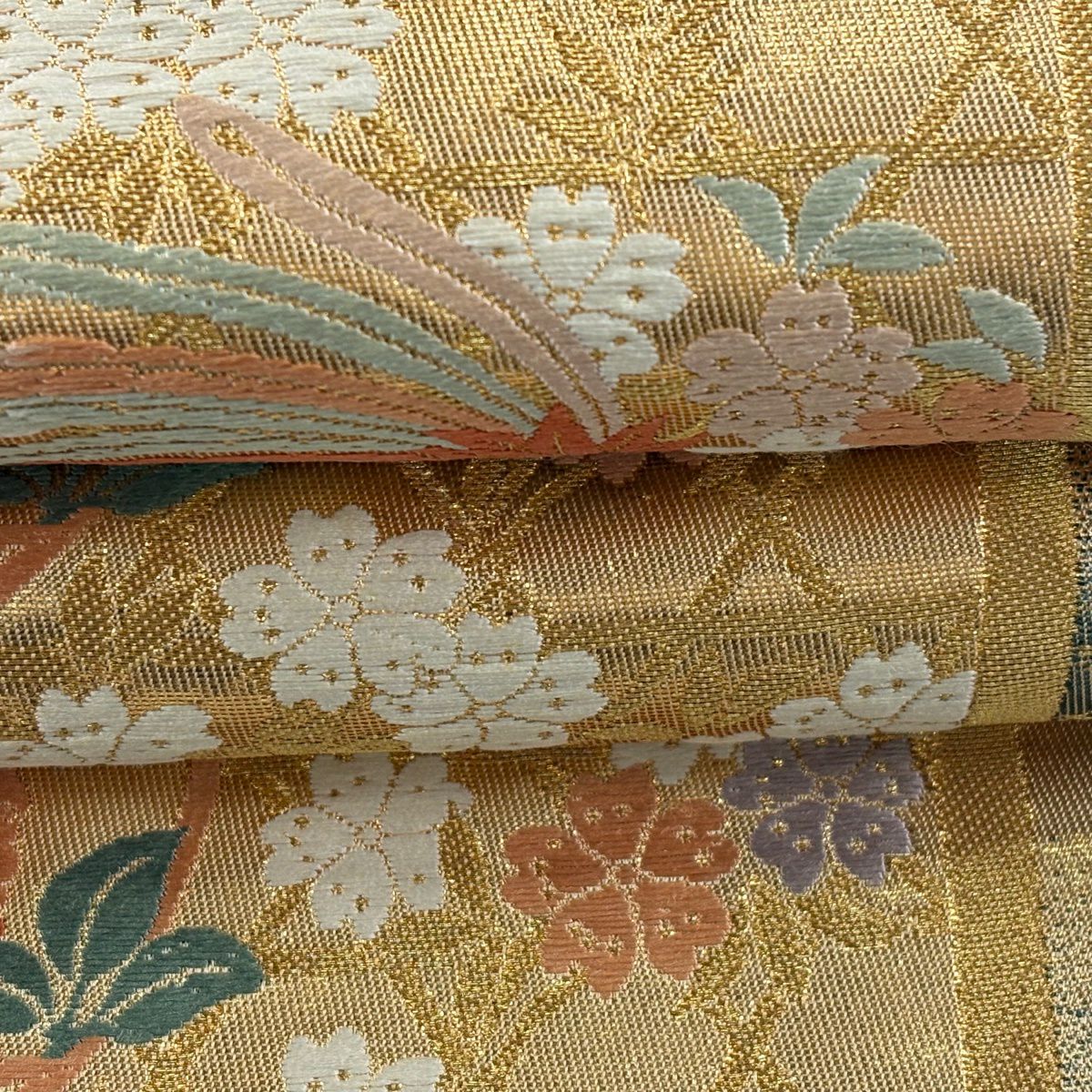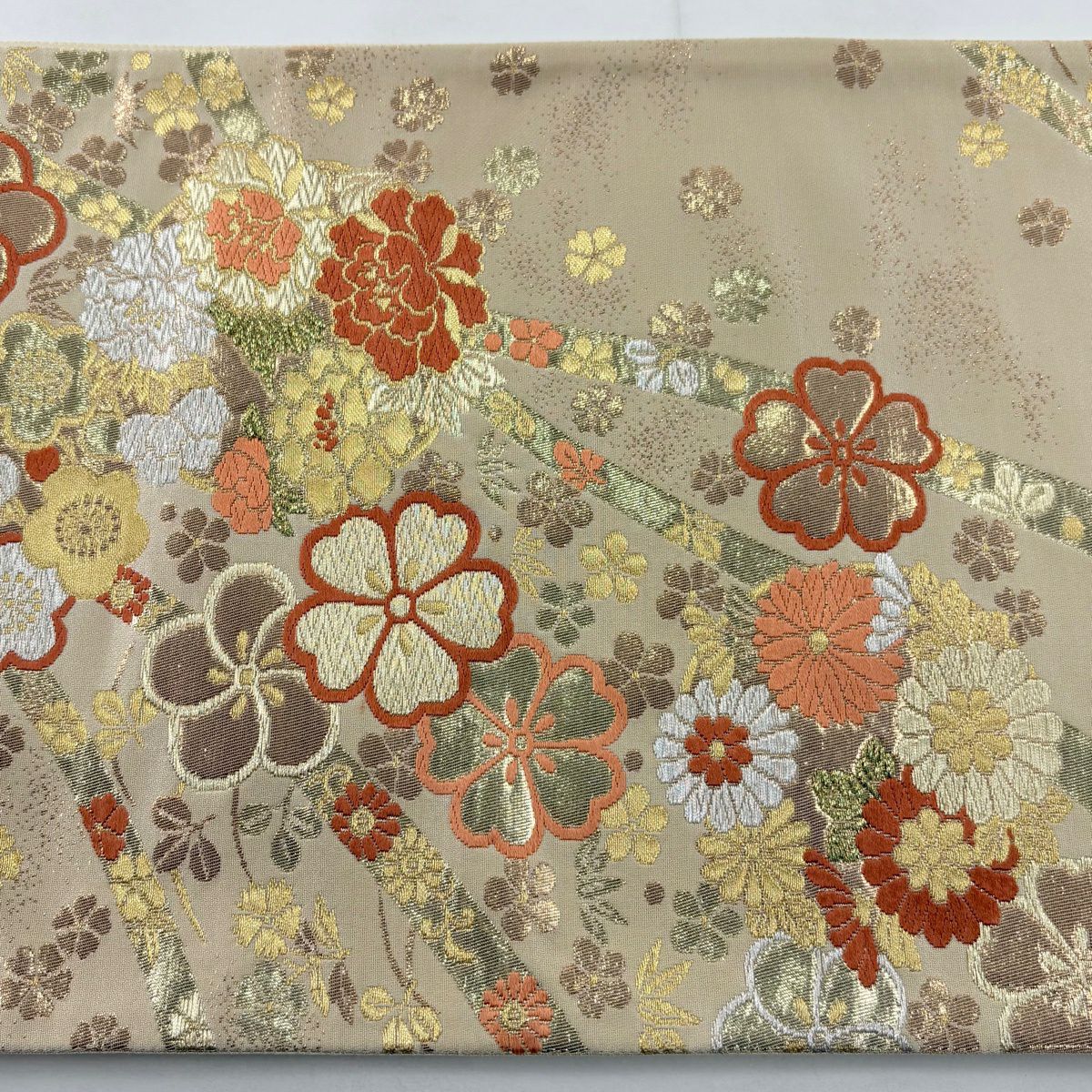 袋帯 秀品 関西仕立て 桜 波 箔 唐織 クリーム 六通 正絹