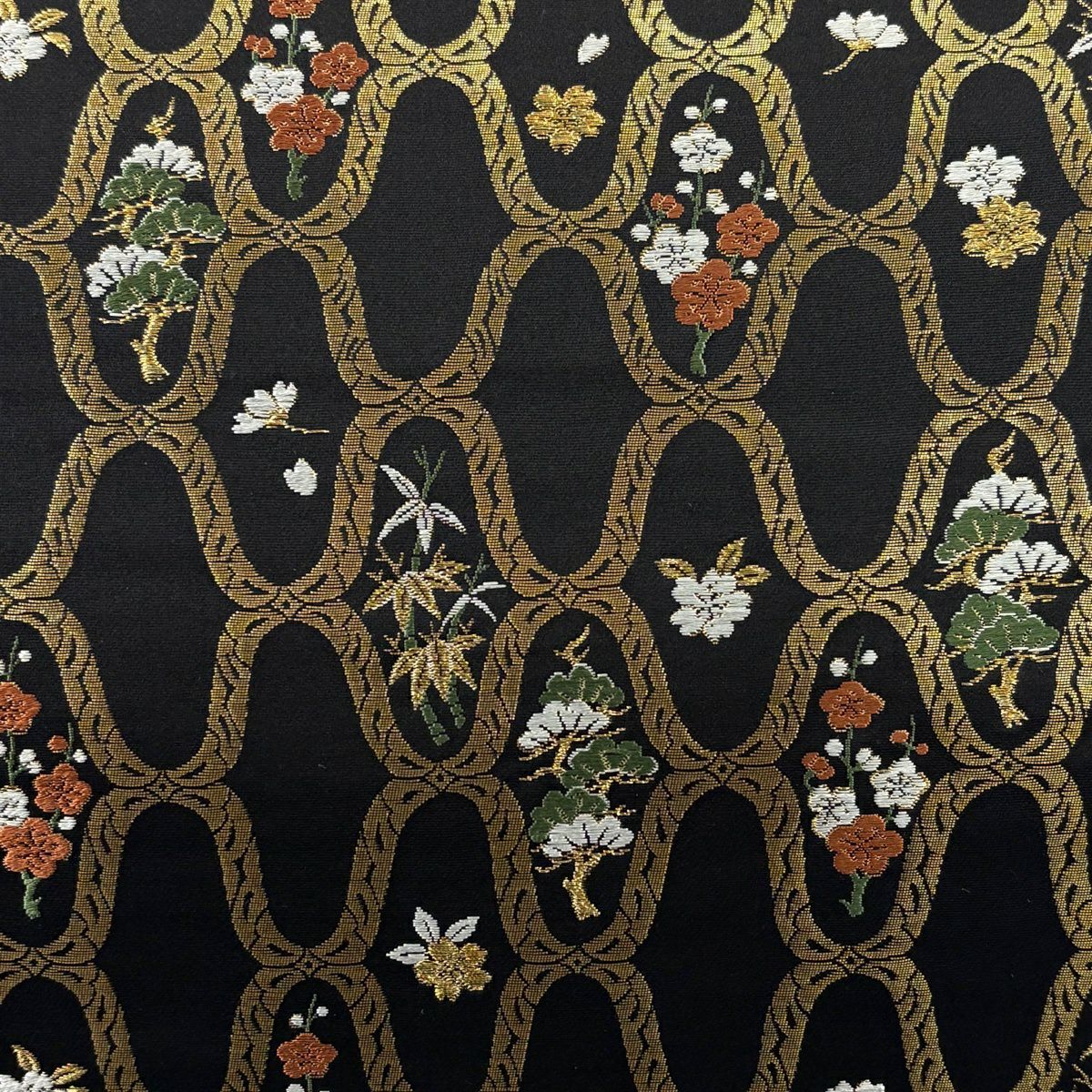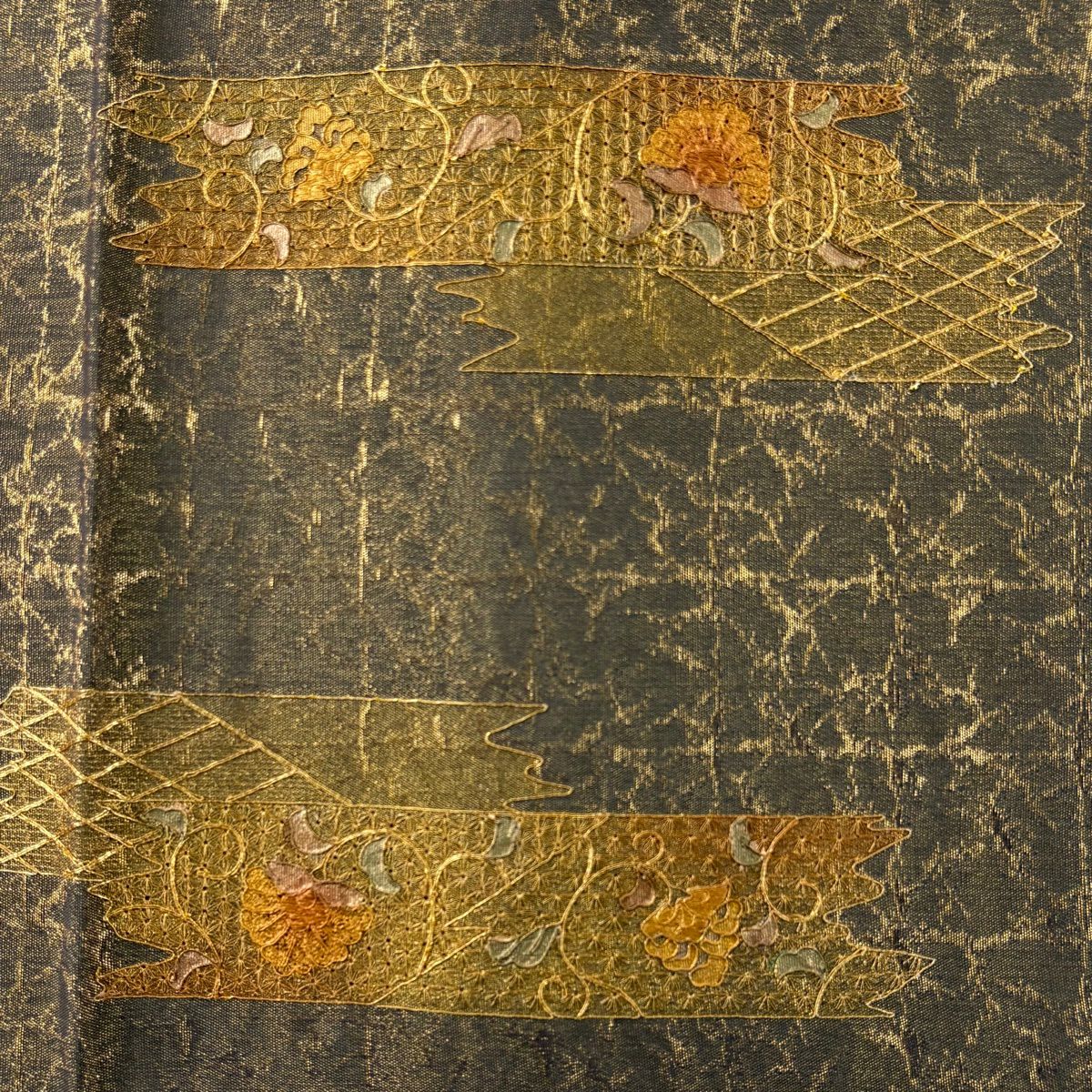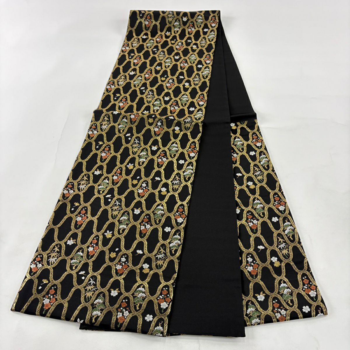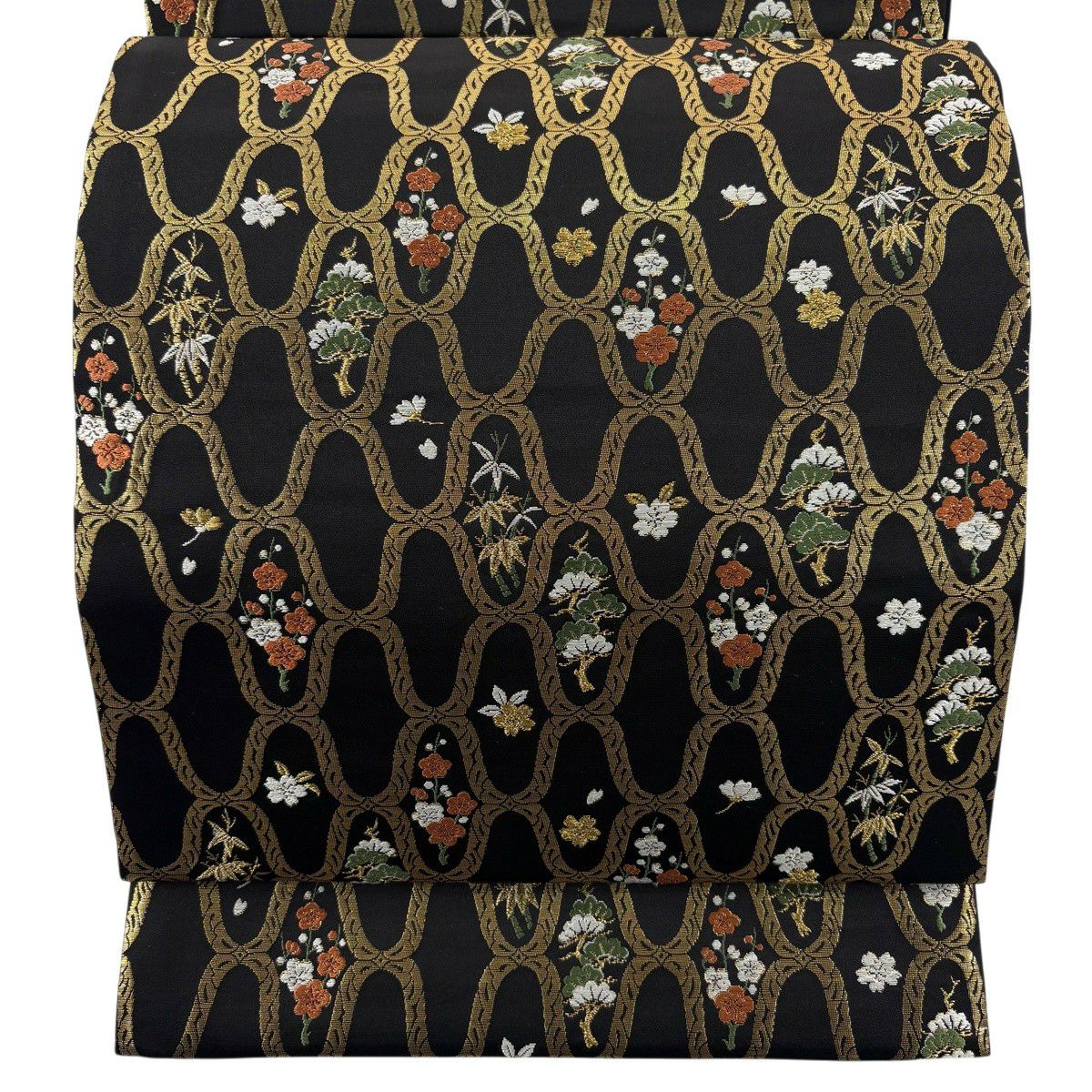 【美品】 袋帯 秀品 松竹梅 幾何学 箔 刺繍 黒 六通 正絹