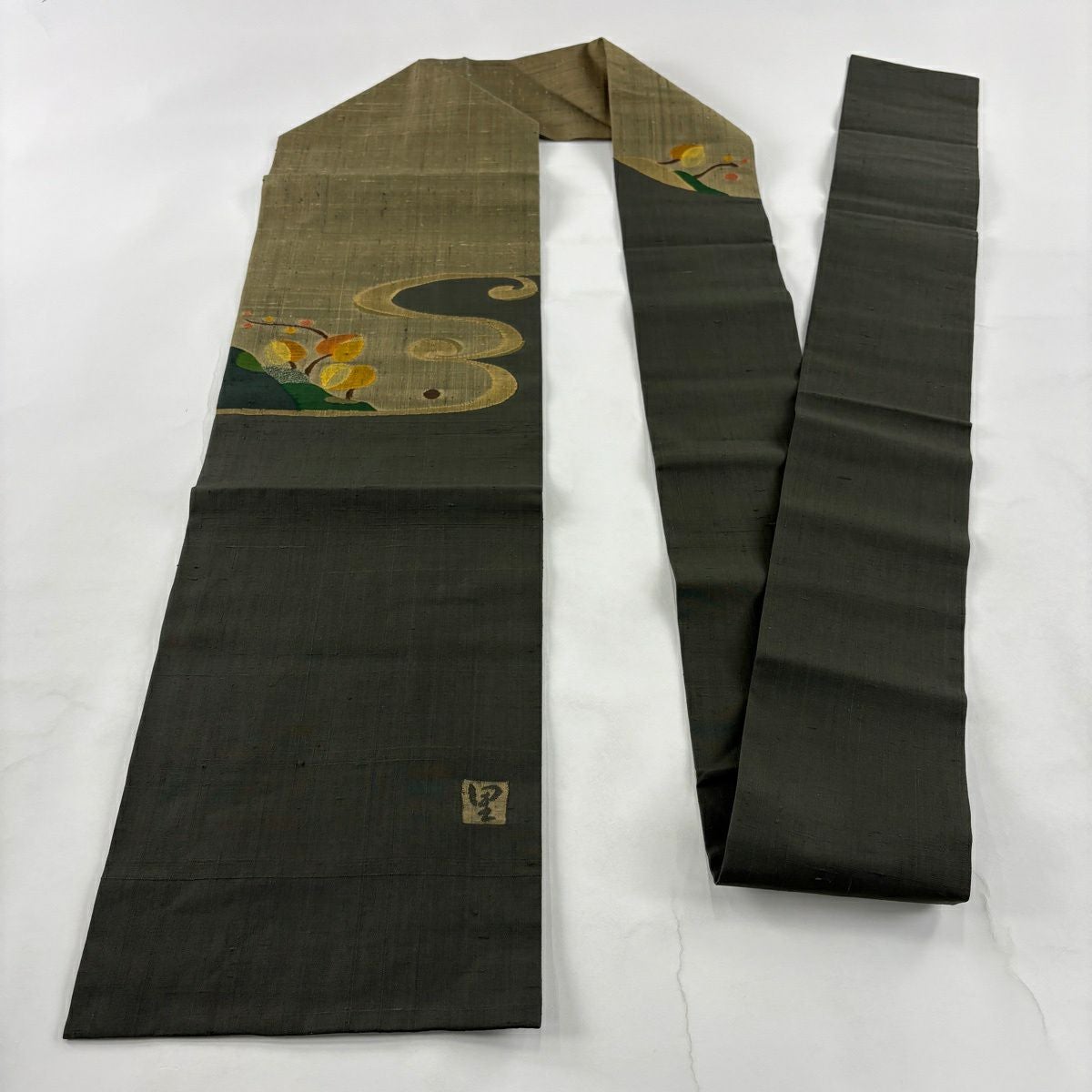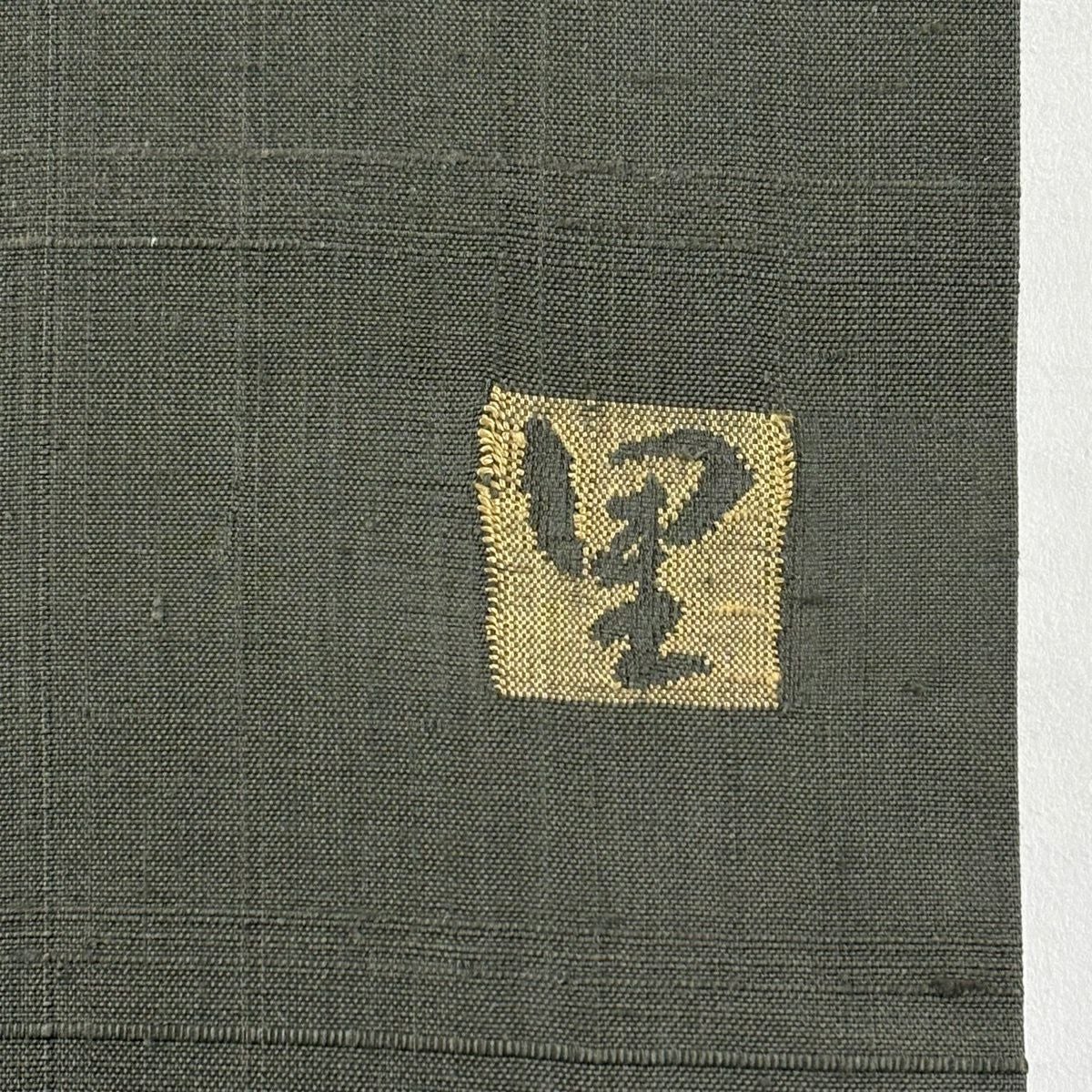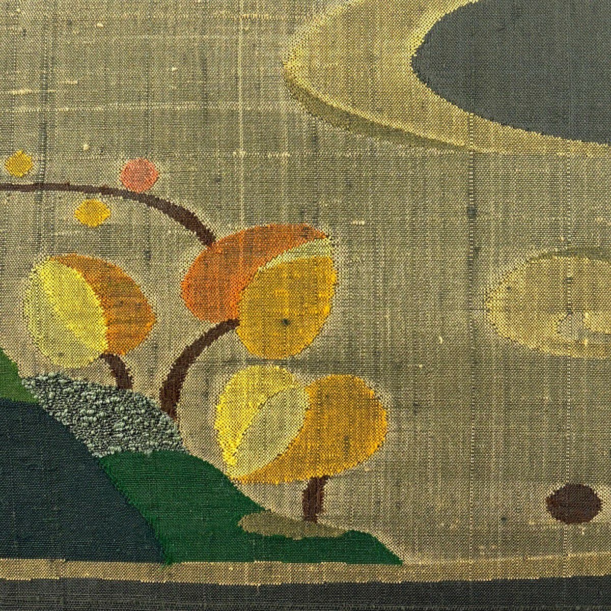 【美品】 名古屋帯 秀品 落款あり 樹木 幾何学 茶緑色 正絹