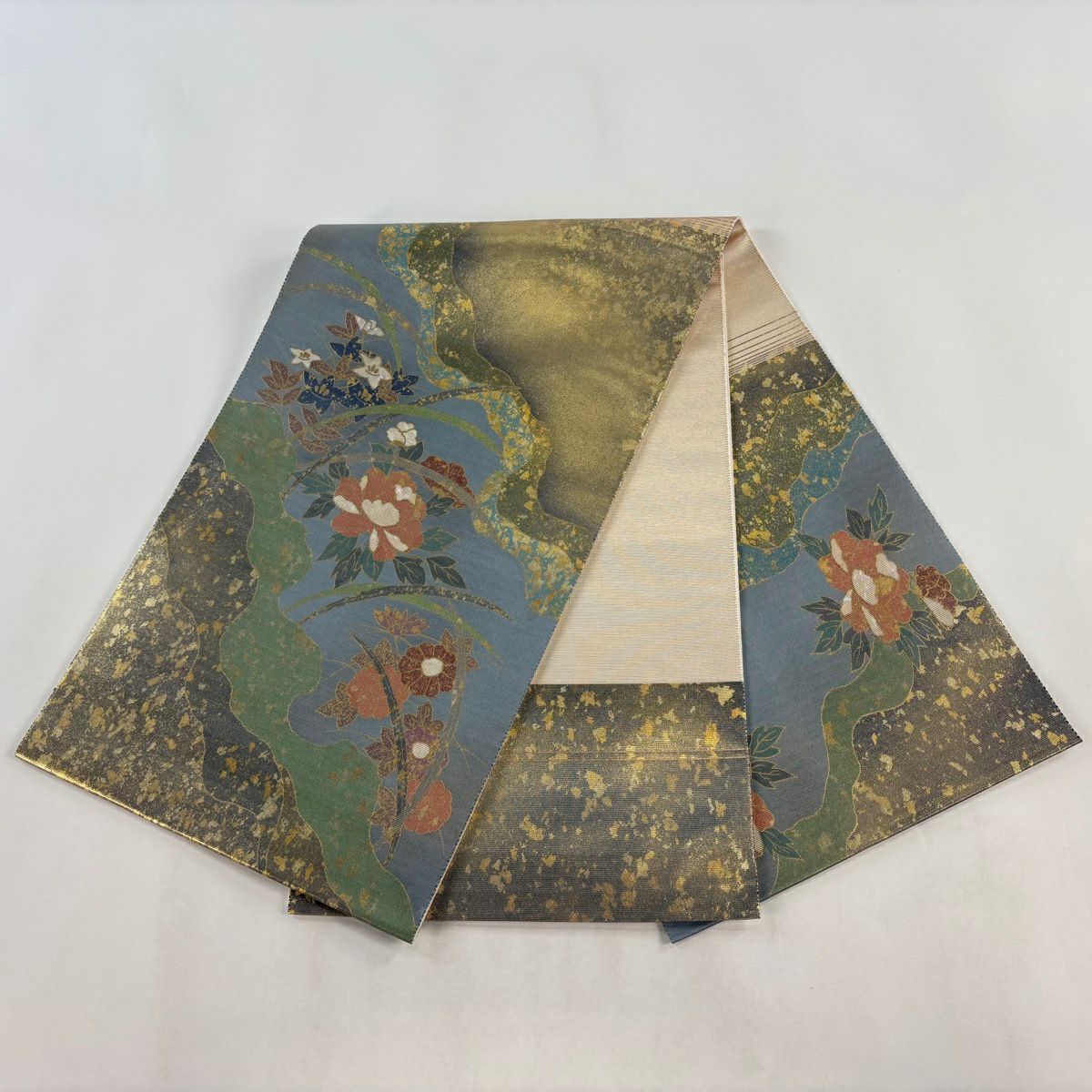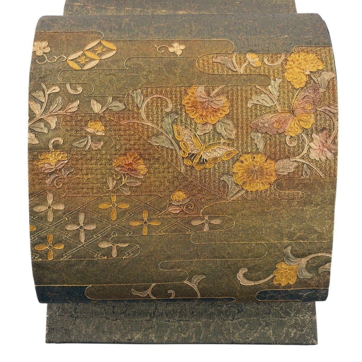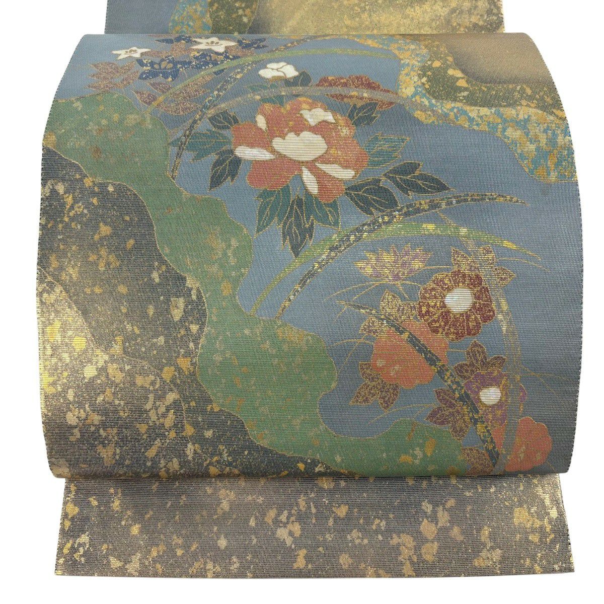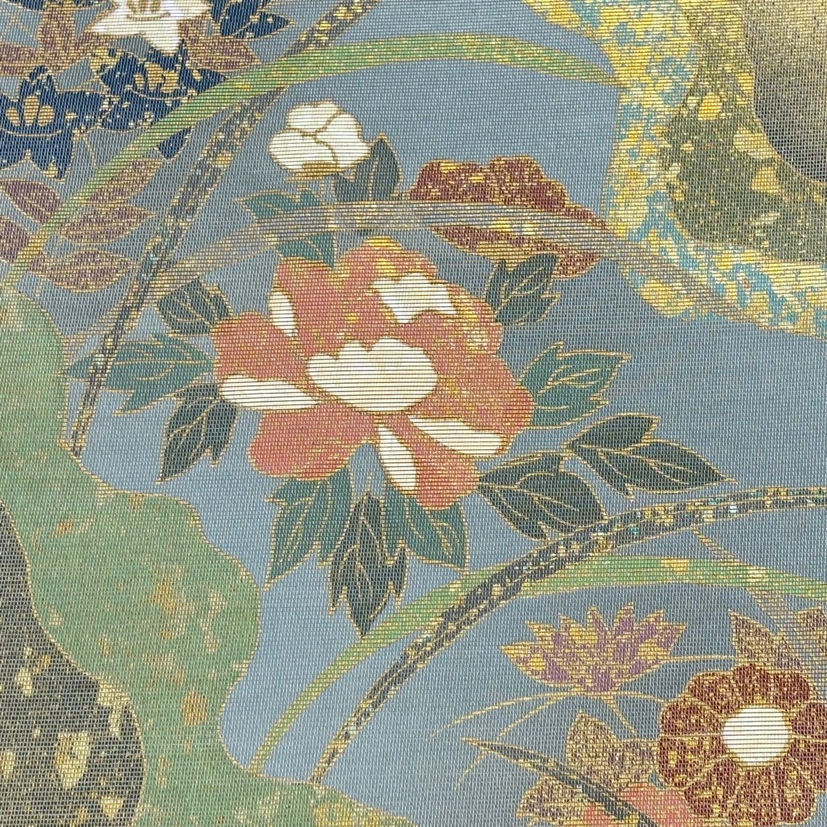 【美品】 袋帯 秀品 牡丹菊唐花文 箔 金糸 灰緑 六通 正絹