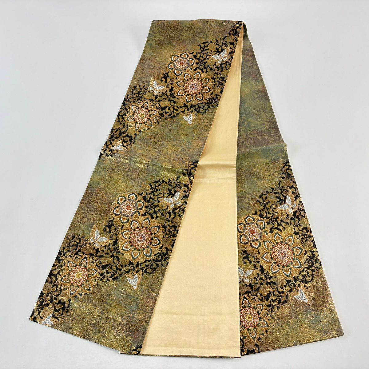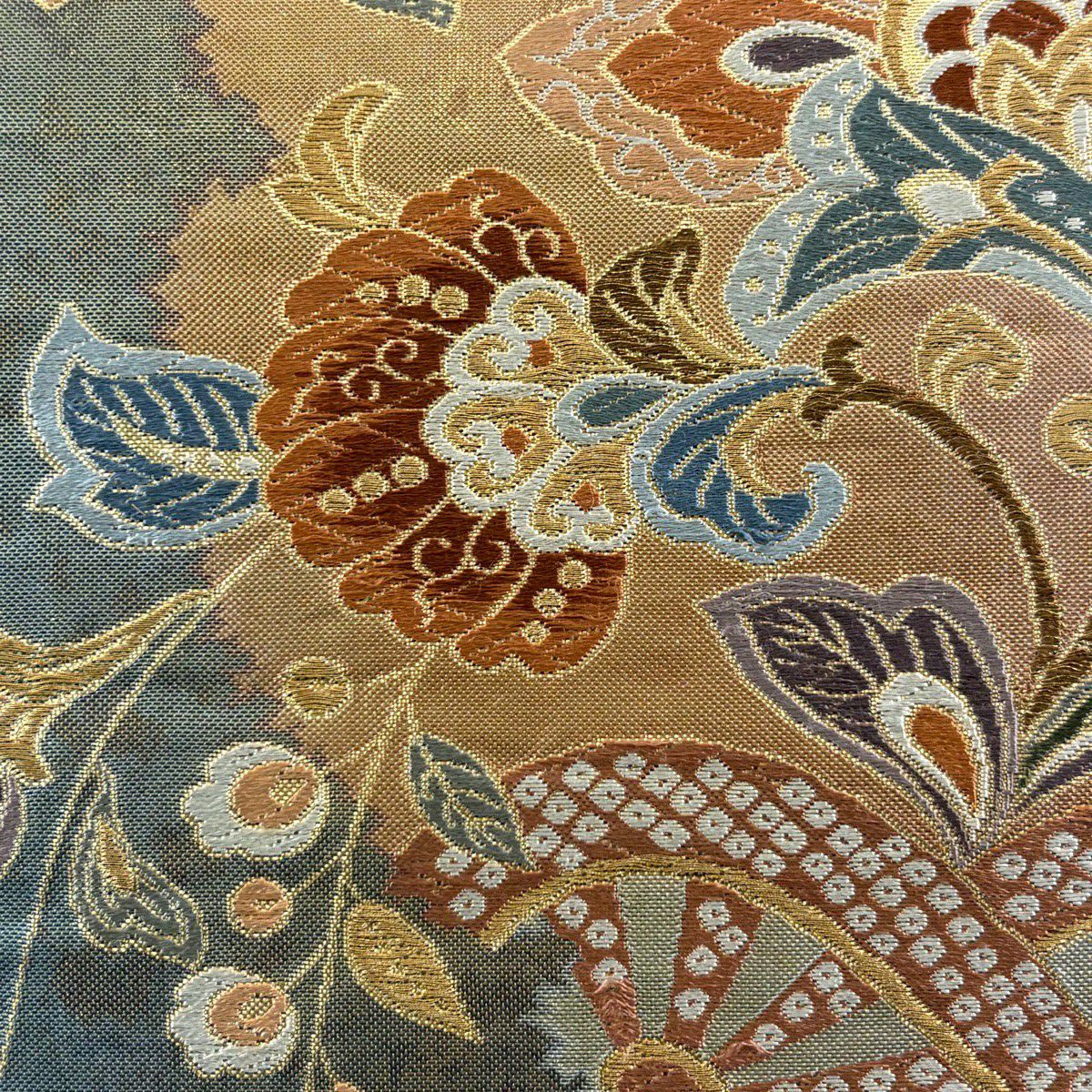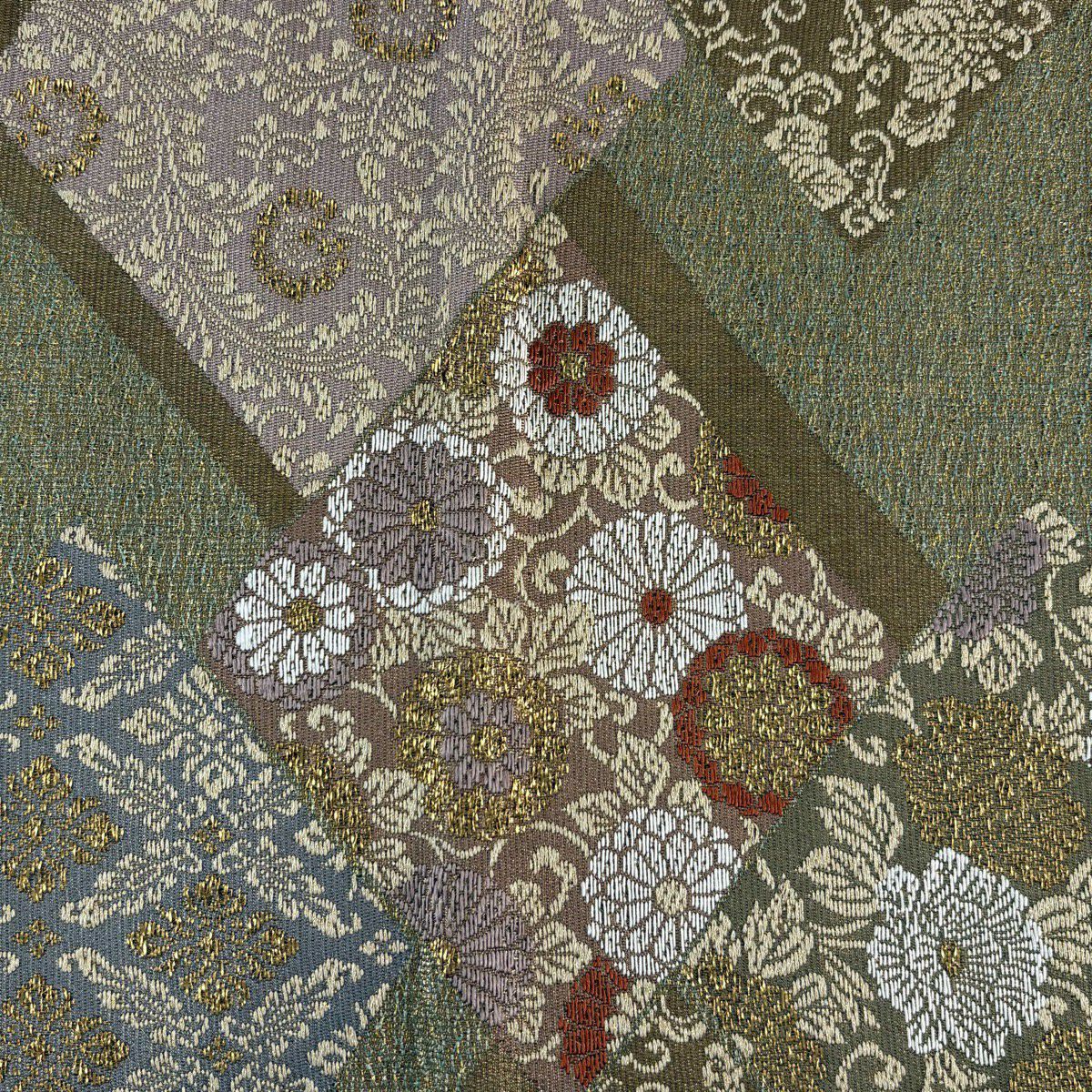 【美品】 袋帯 秀品 牡丹菊唐花文 箔 金糸 灰緑 六通 正絹