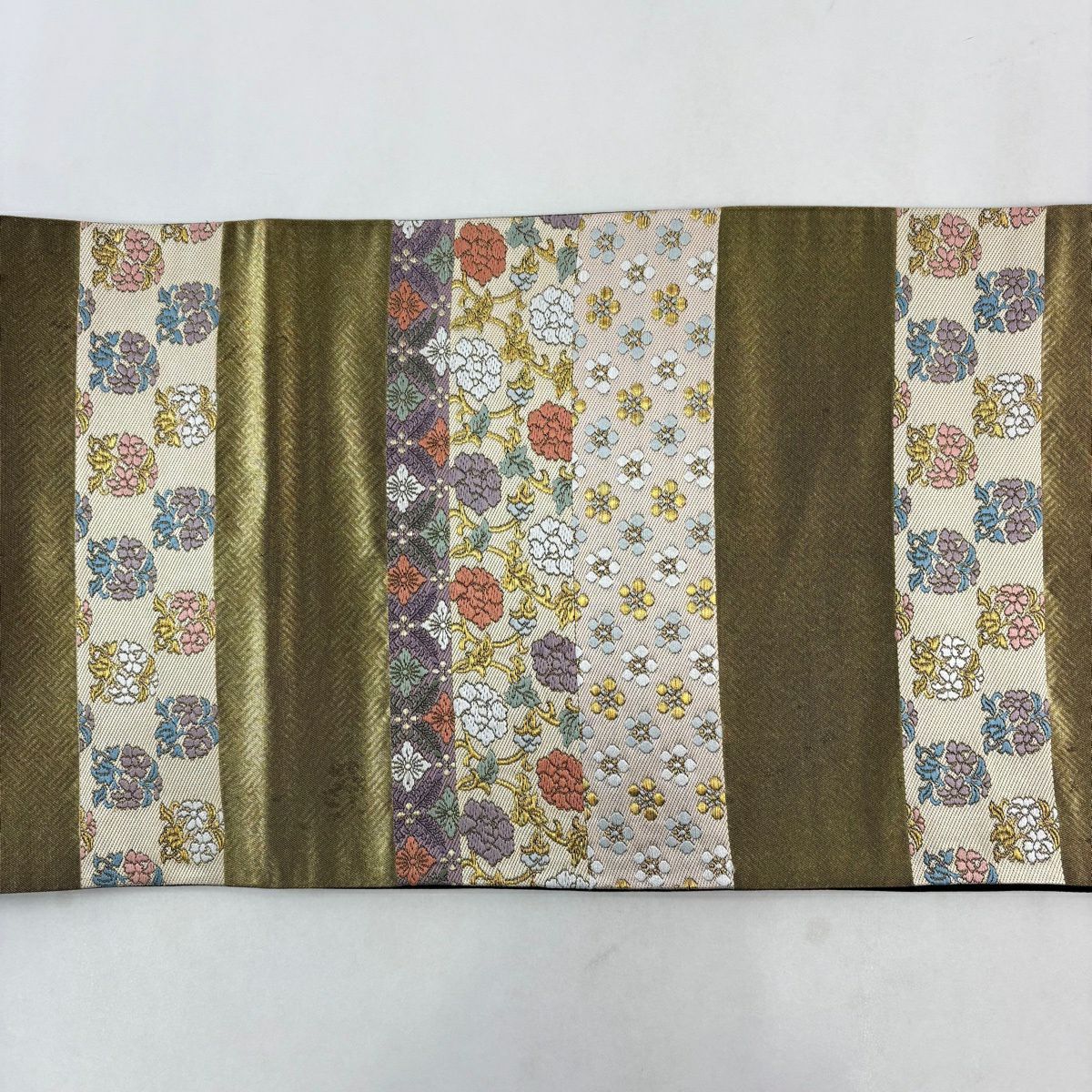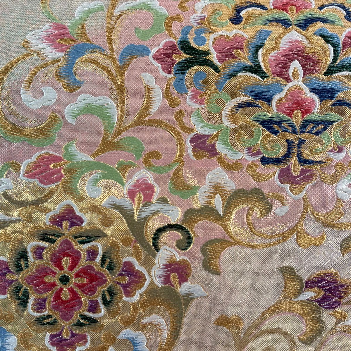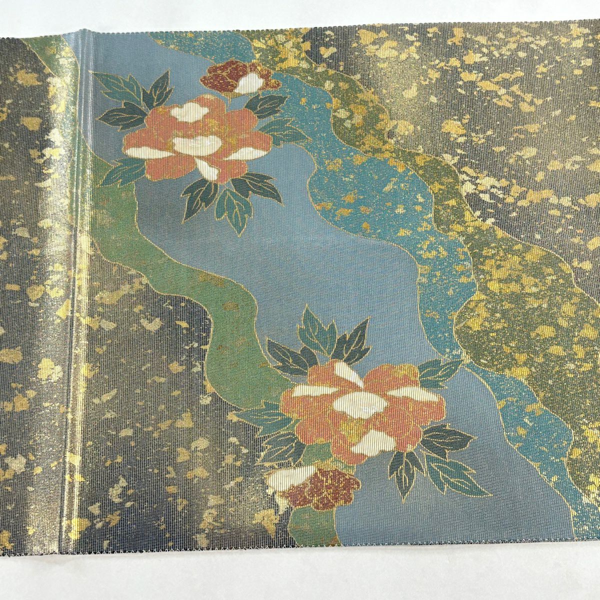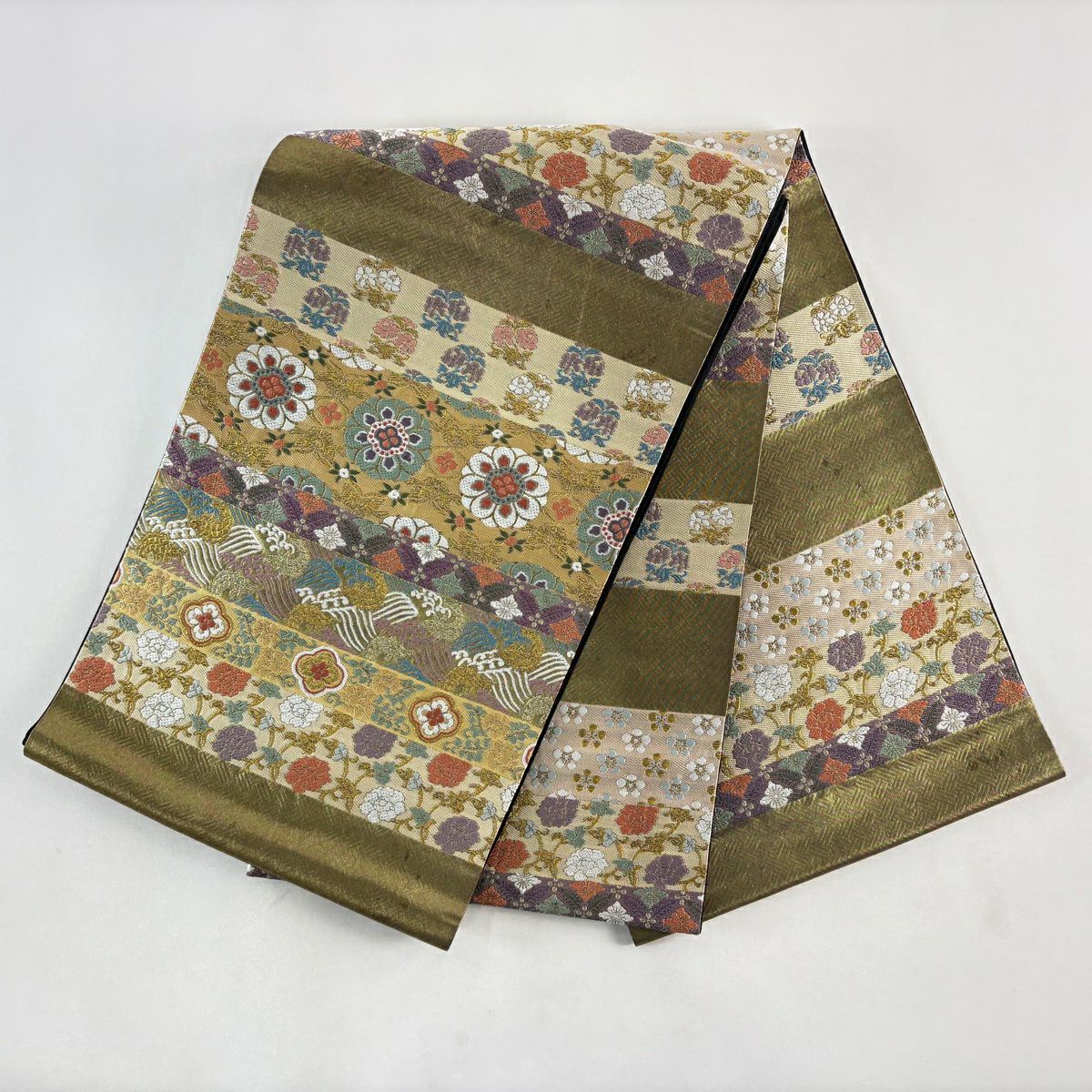 【美品】 袋帯 秀品 牡丹菊唐花文 箔 金糸 灰緑 六通 正絹