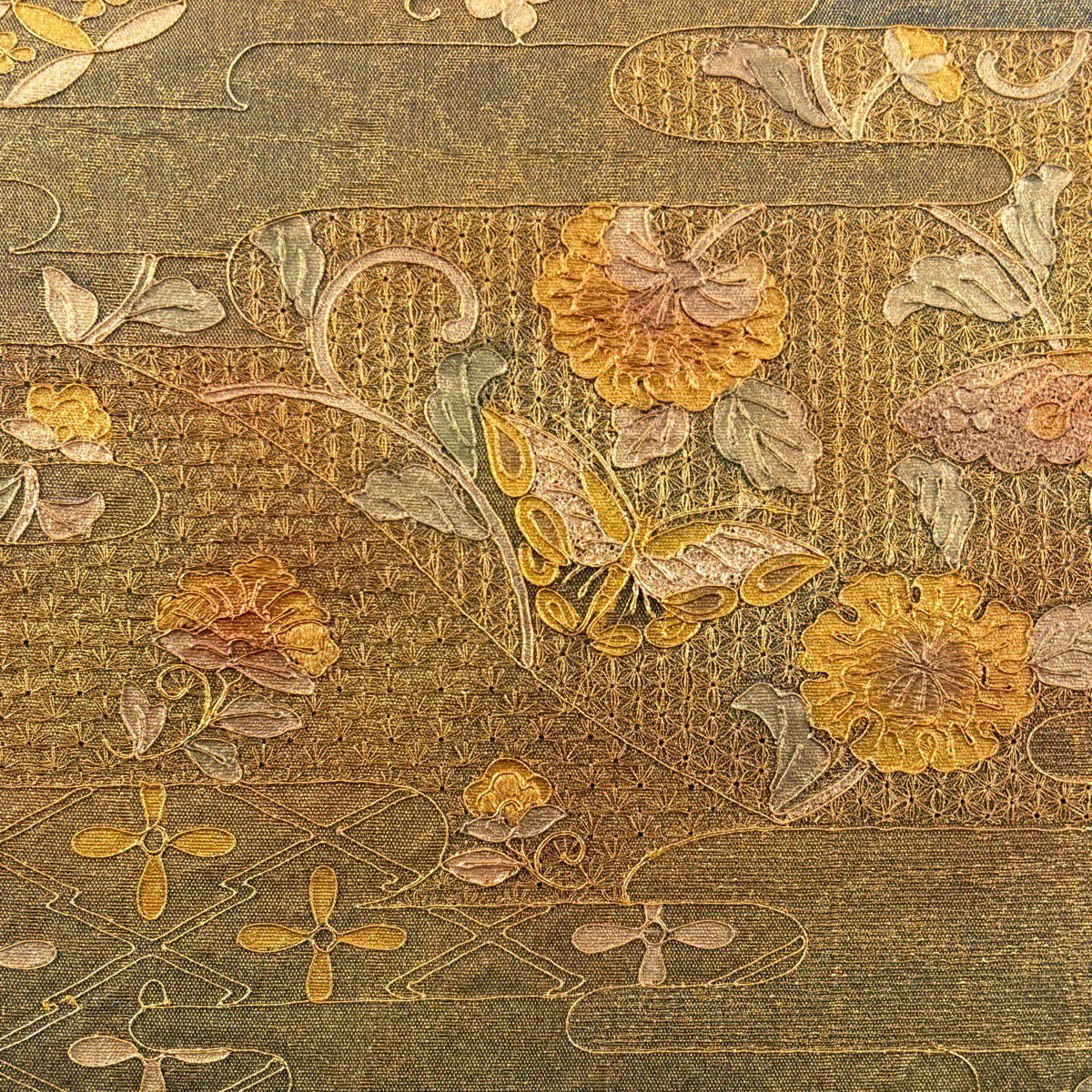 【美品】 袋帯 秀品 華文 花鳥 金銀糸 刺繍 金色 六通 正絹