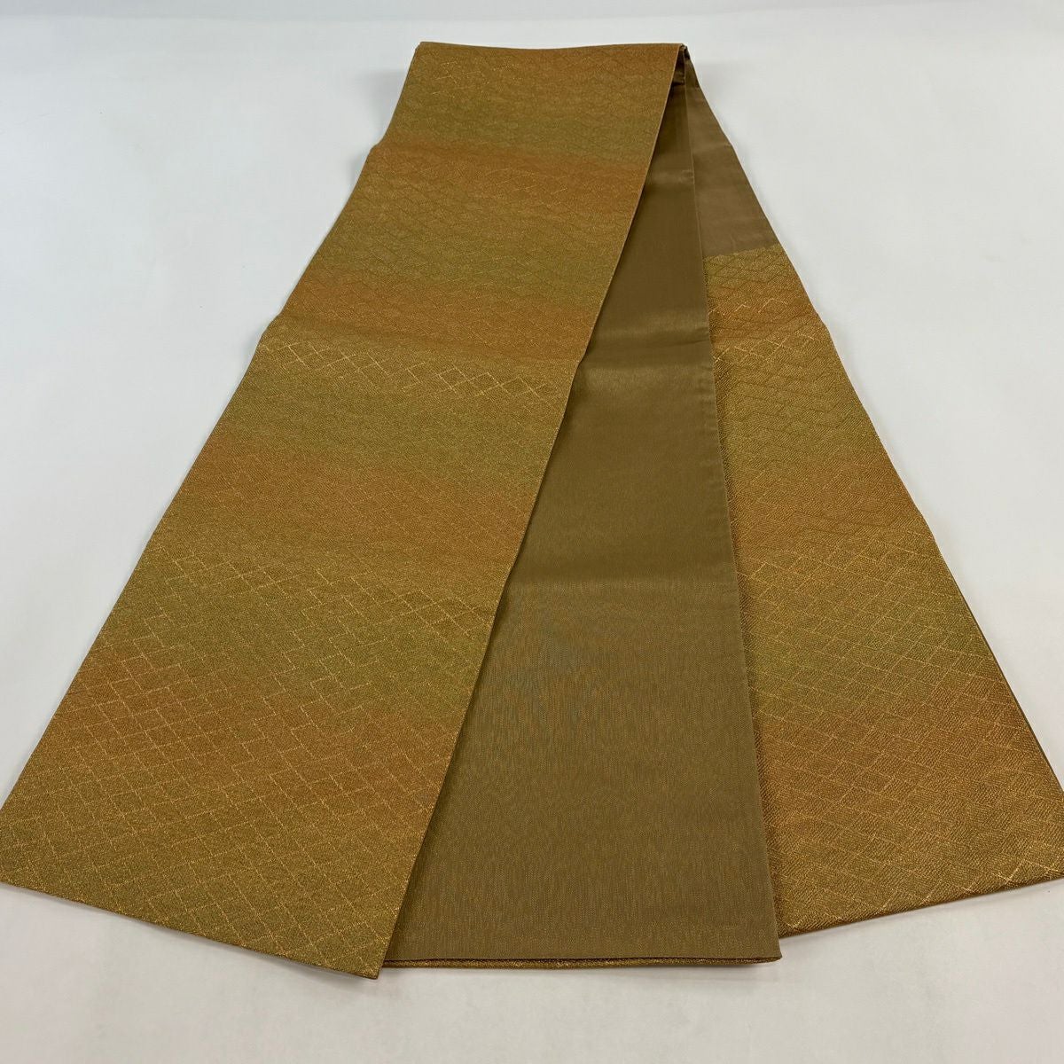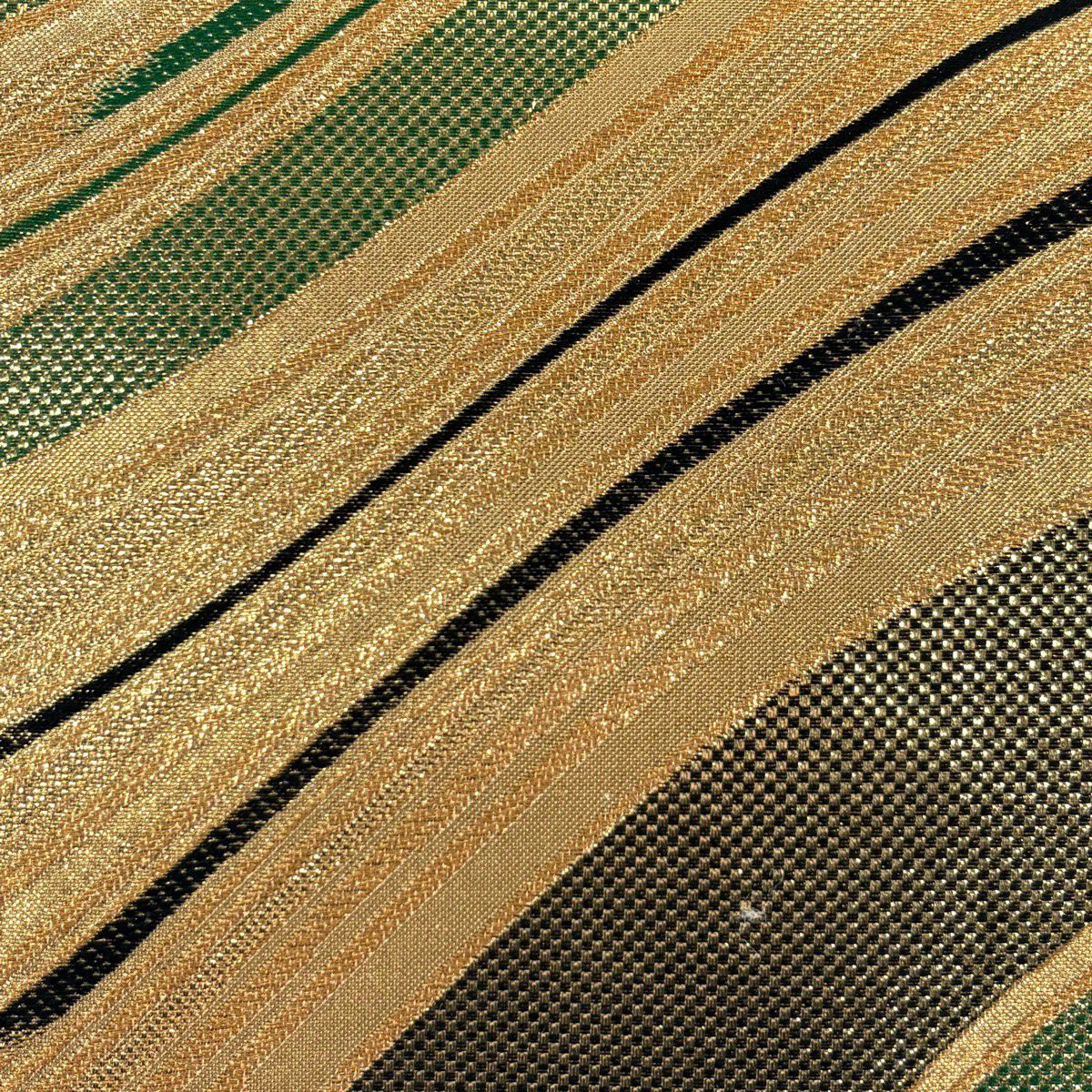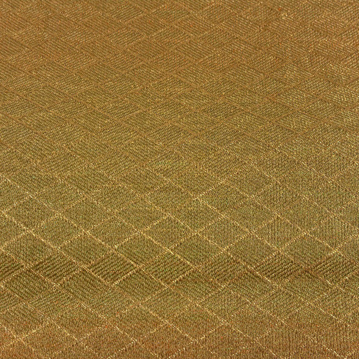 【美品】 袋帯 秀品 斜め格子 金糸 箔 山吹茶色 六通 正絹