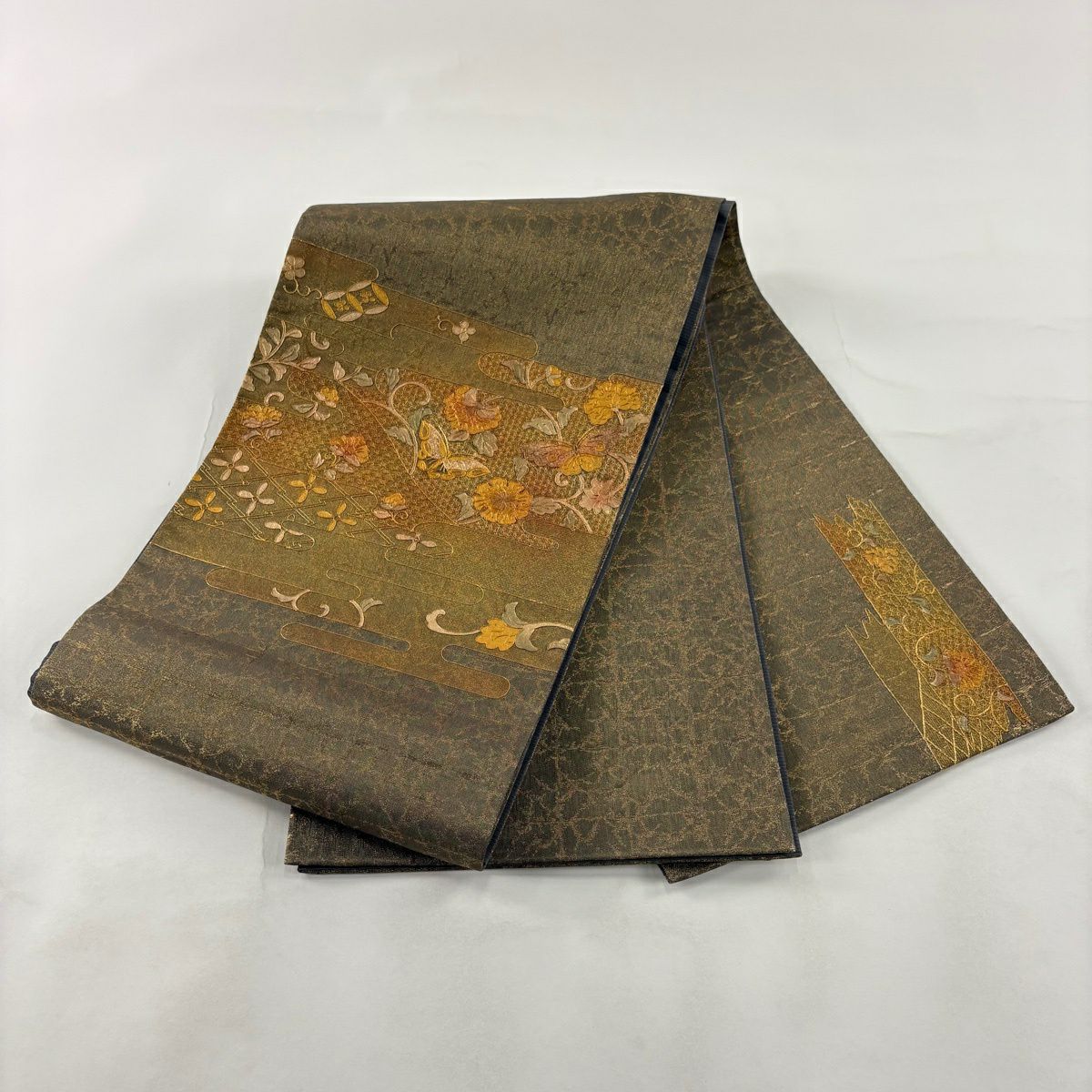 【美品】 袋帯 秀品 草花 蝶 金彩 金糸 灰色 お太鼓柄 正絹