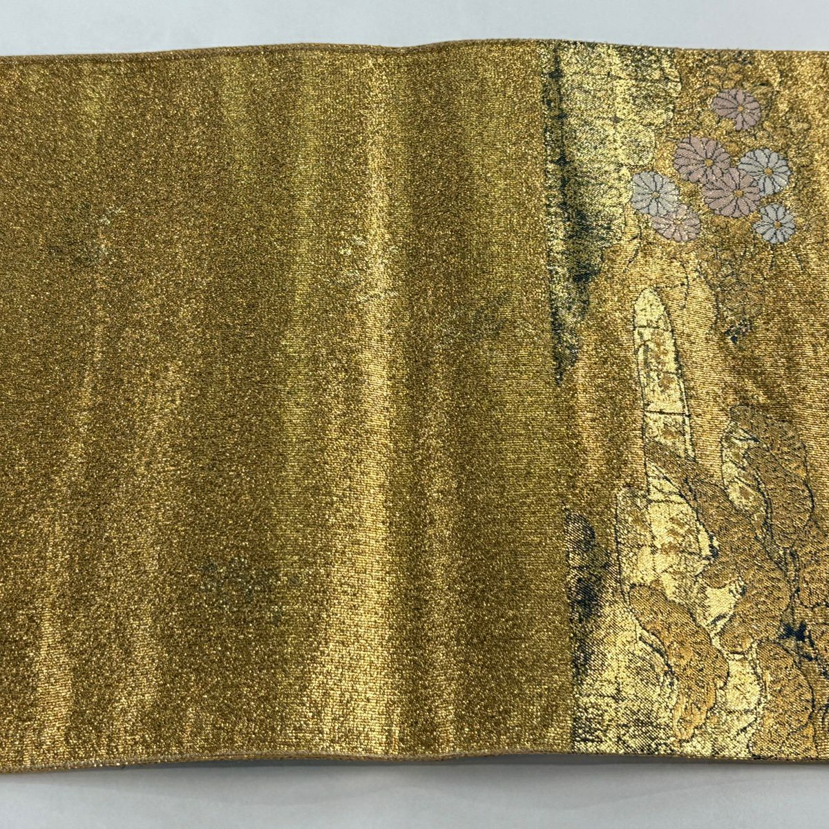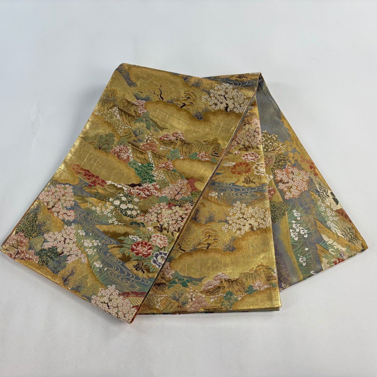 【美品】 袋帯 秀品 風景 草花 金糸 箔 金色 お太鼓柄 正絹