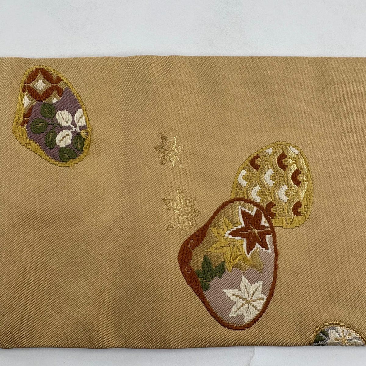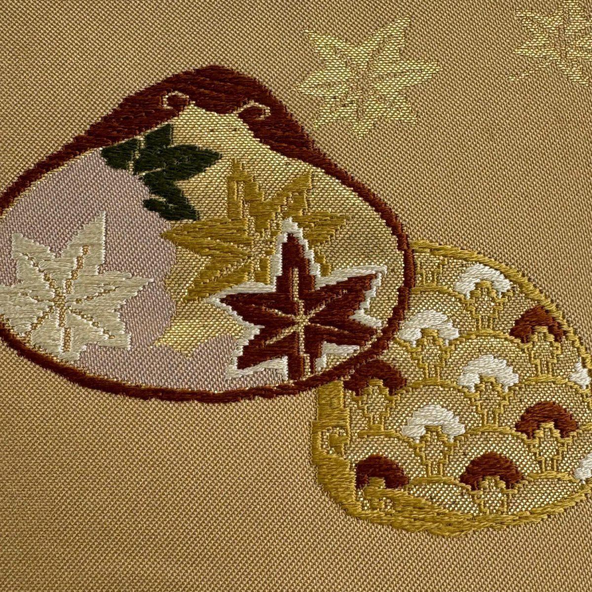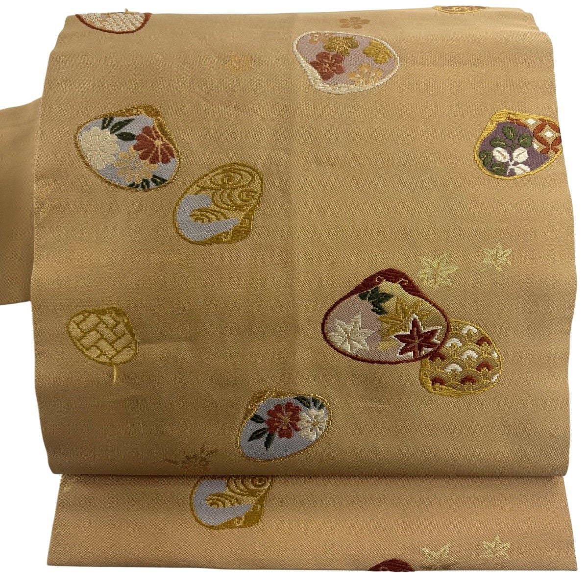 名古屋帯 秀品 貝合わせ 草花 金糸 刺繍 ベージュ 正絹