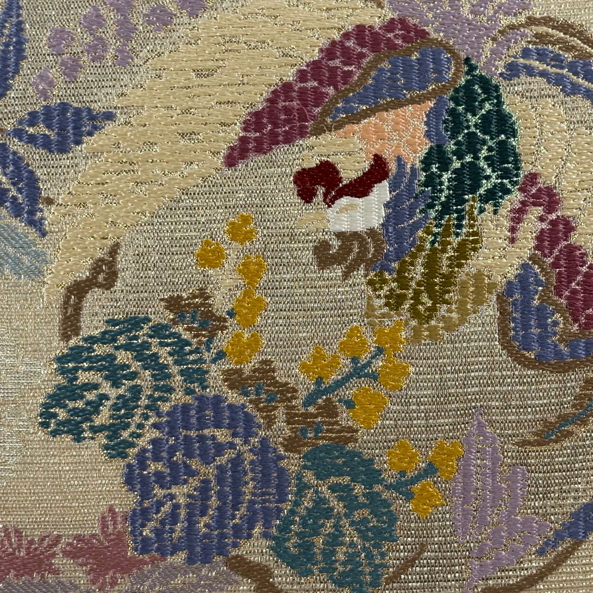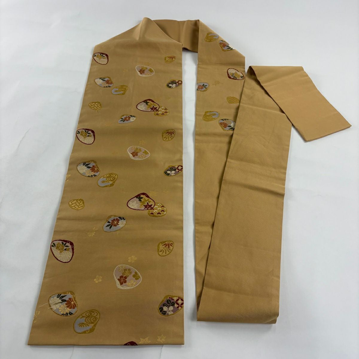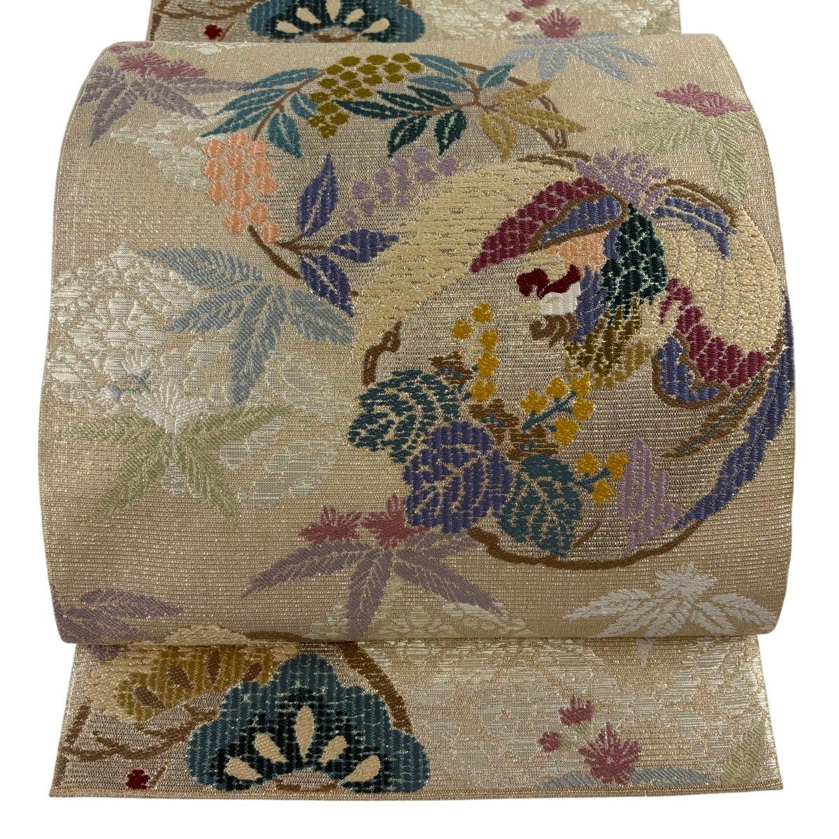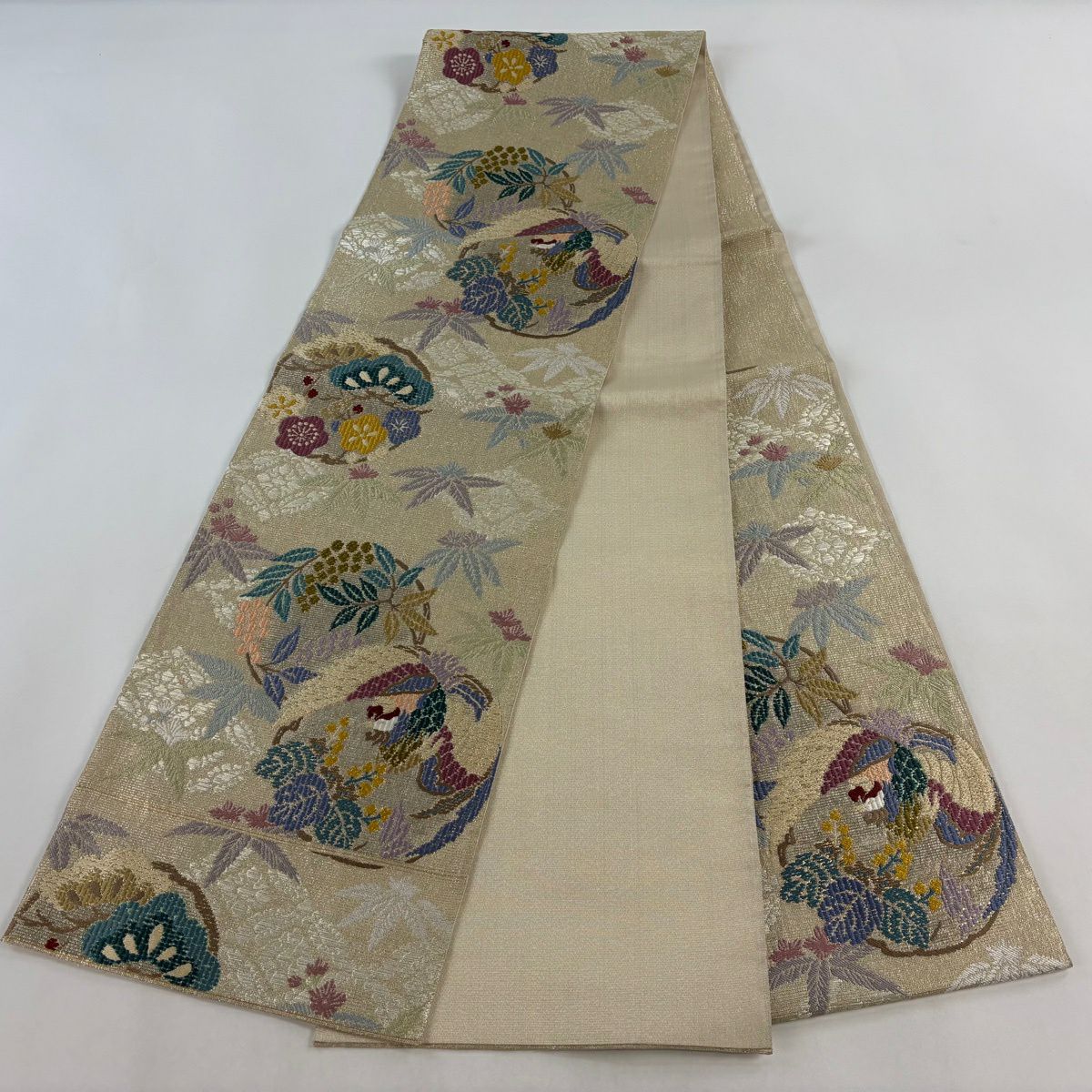 名古屋帯 秀品 貝合わせ 草花 金糸 刺繍 ベージュ 正絹