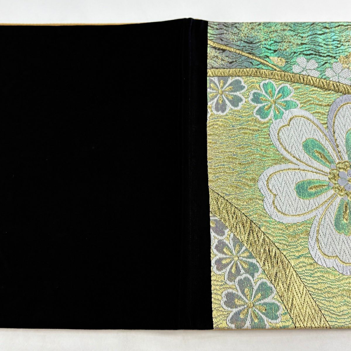 【美品】 袋帯 秀品 振袖向き 桜 金糸 箔 薄緑 六通 正絹