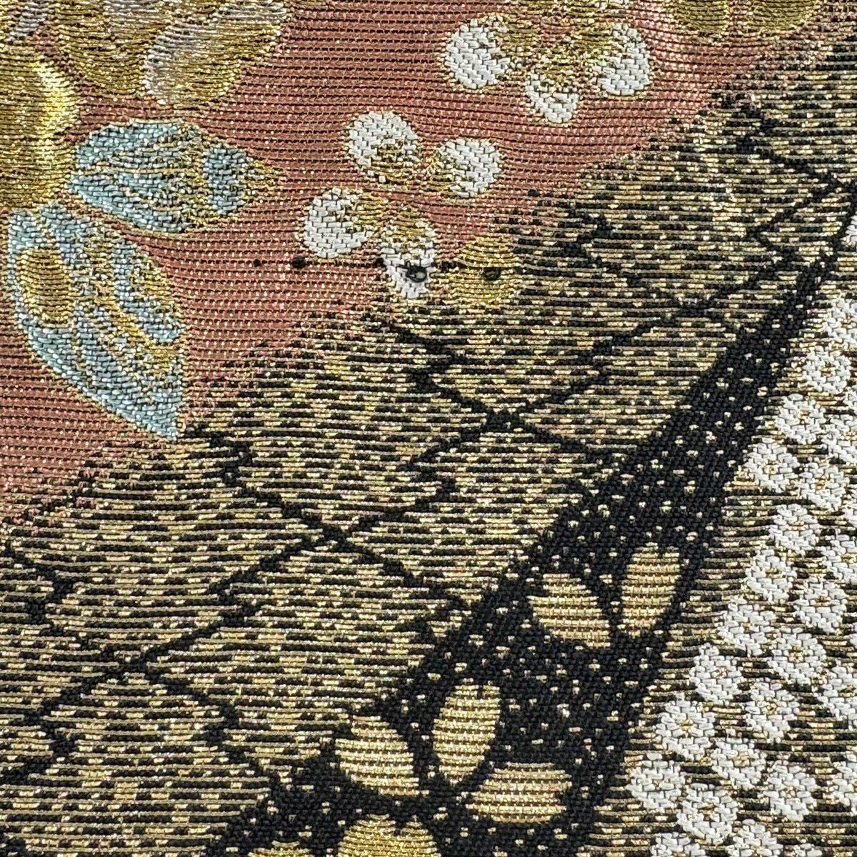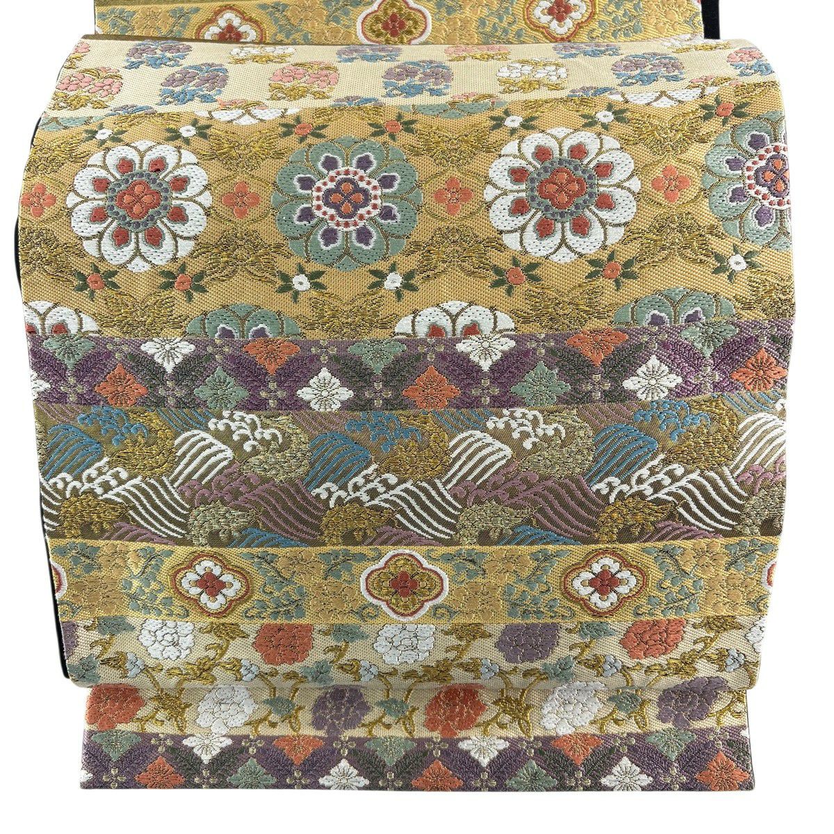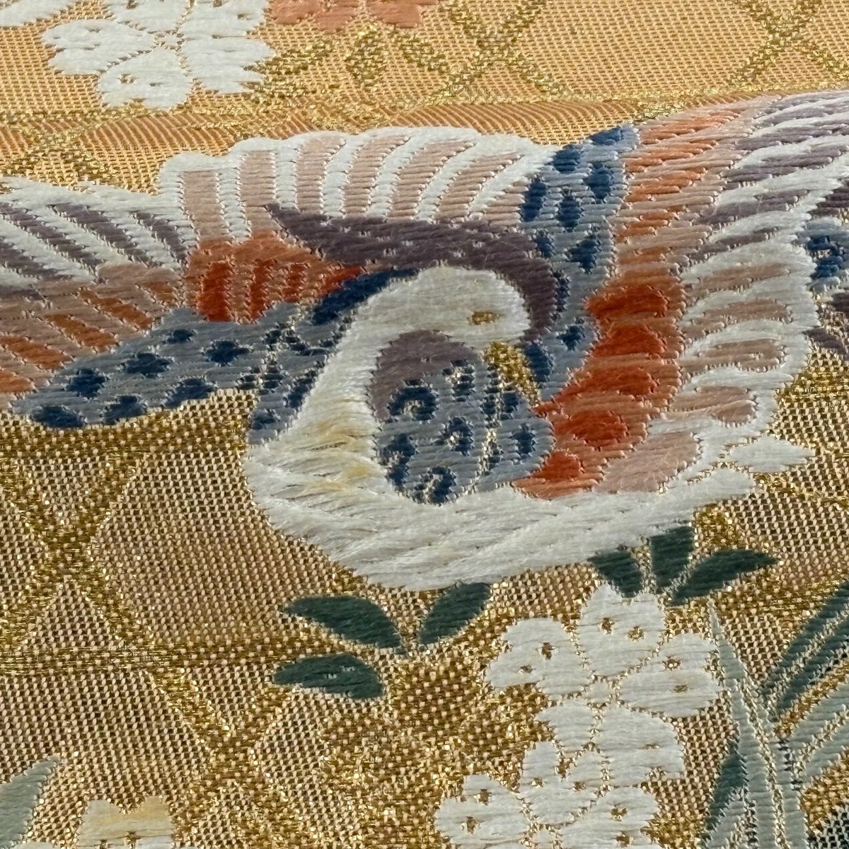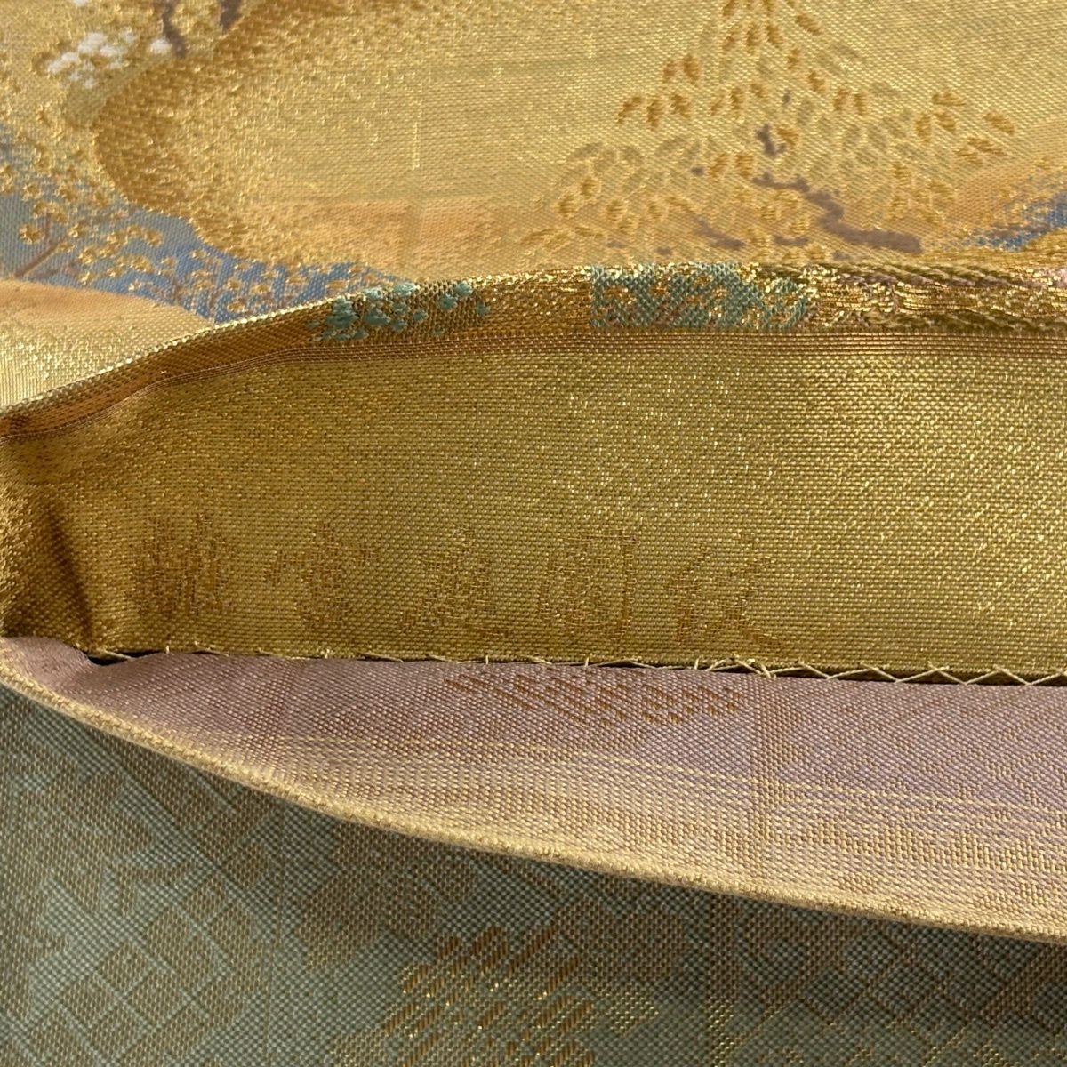 袋帯 秀品 関西仕立て 花鳥 観世水 金糸 箔 金色 六通 正絹