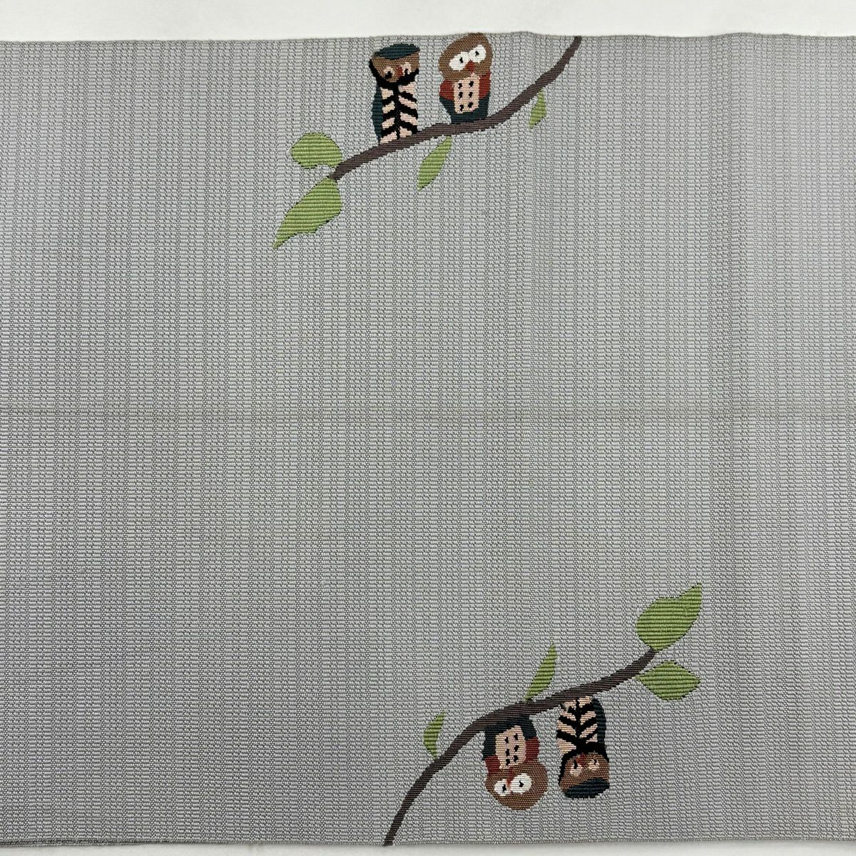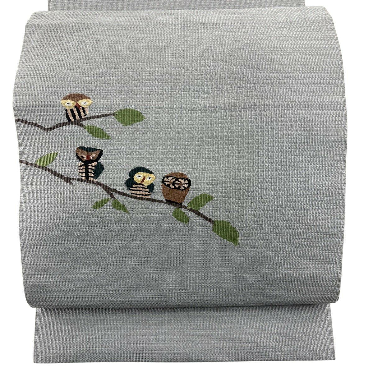名古屋帯 秀品 八寸名古屋帯 松葉仕立て ふくろう 枝葉 灰色 正絹