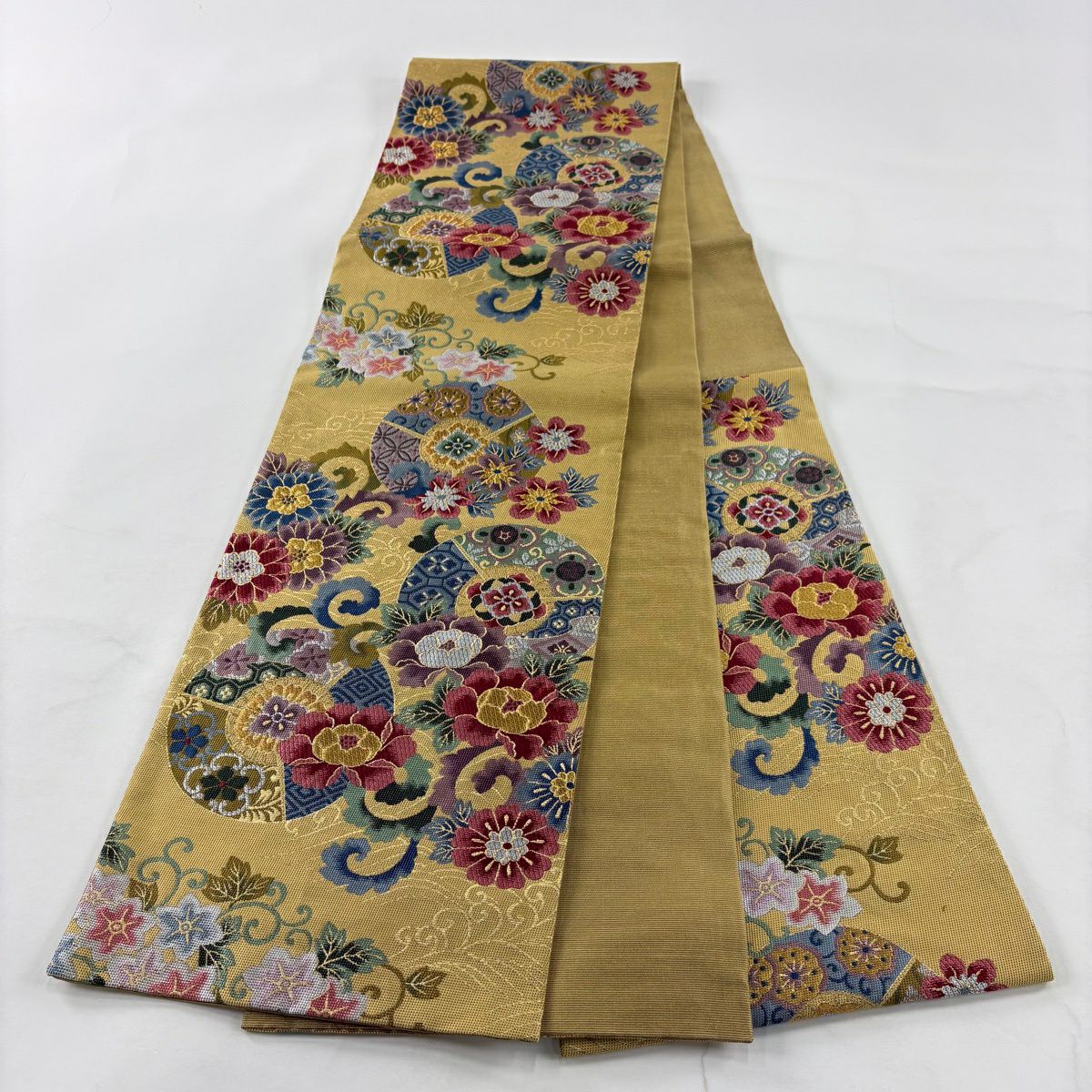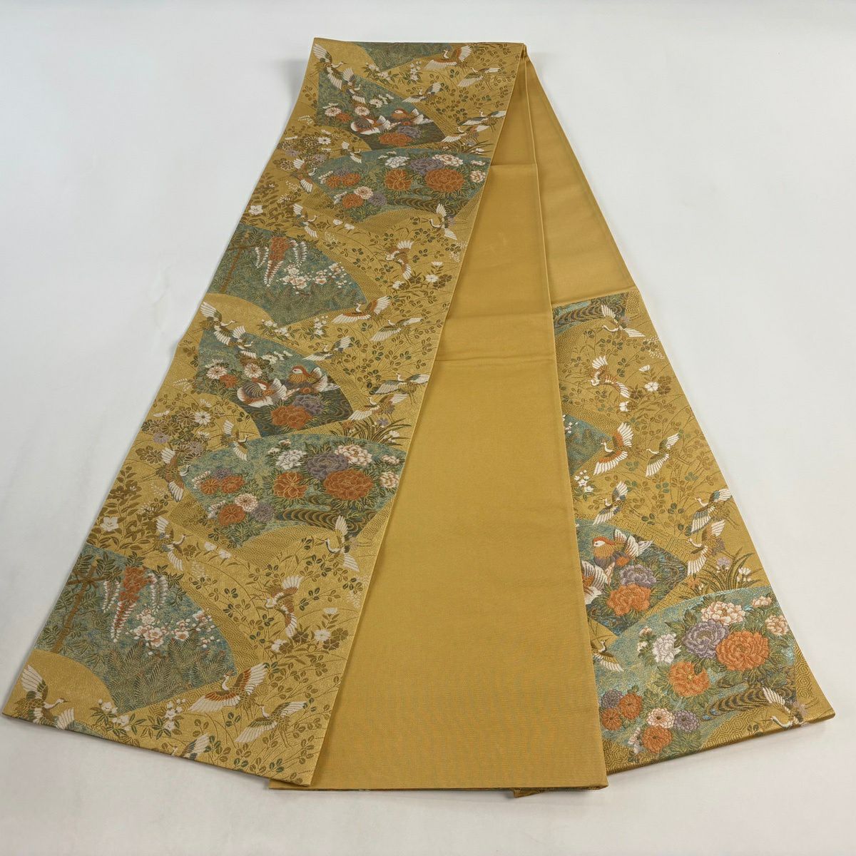 【美品】 袋帯 秀品 扇面 鴛鴦 金糸 箔 黄土色 六通 正絹