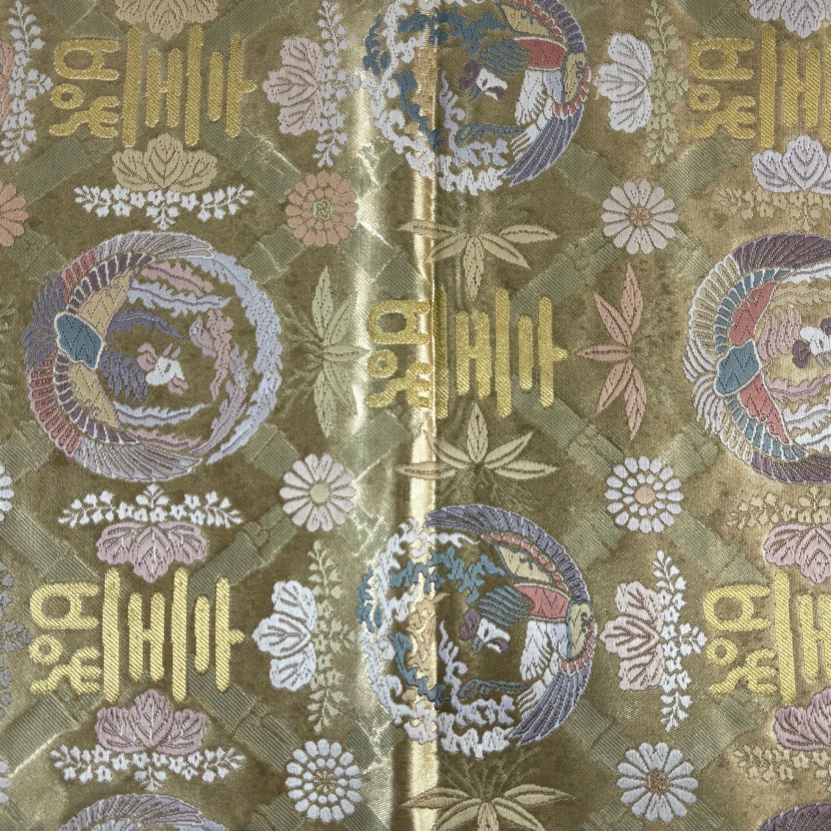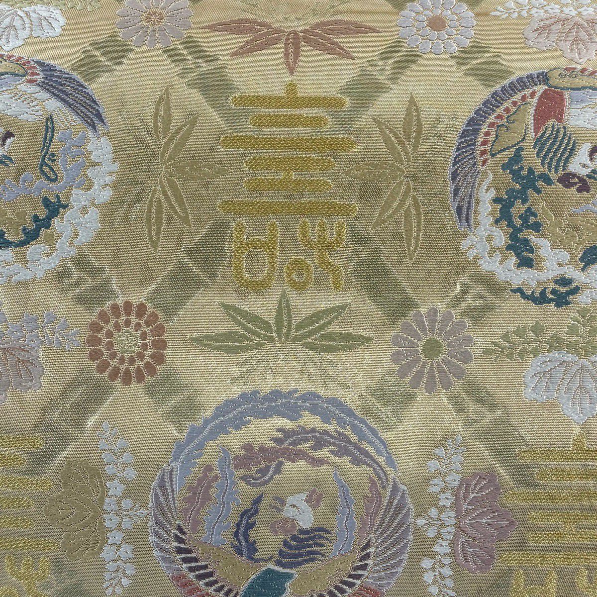 【美品】 袋帯 秀品 鳳凰 文字文 金糸 刺繍 金色 六通 正絹