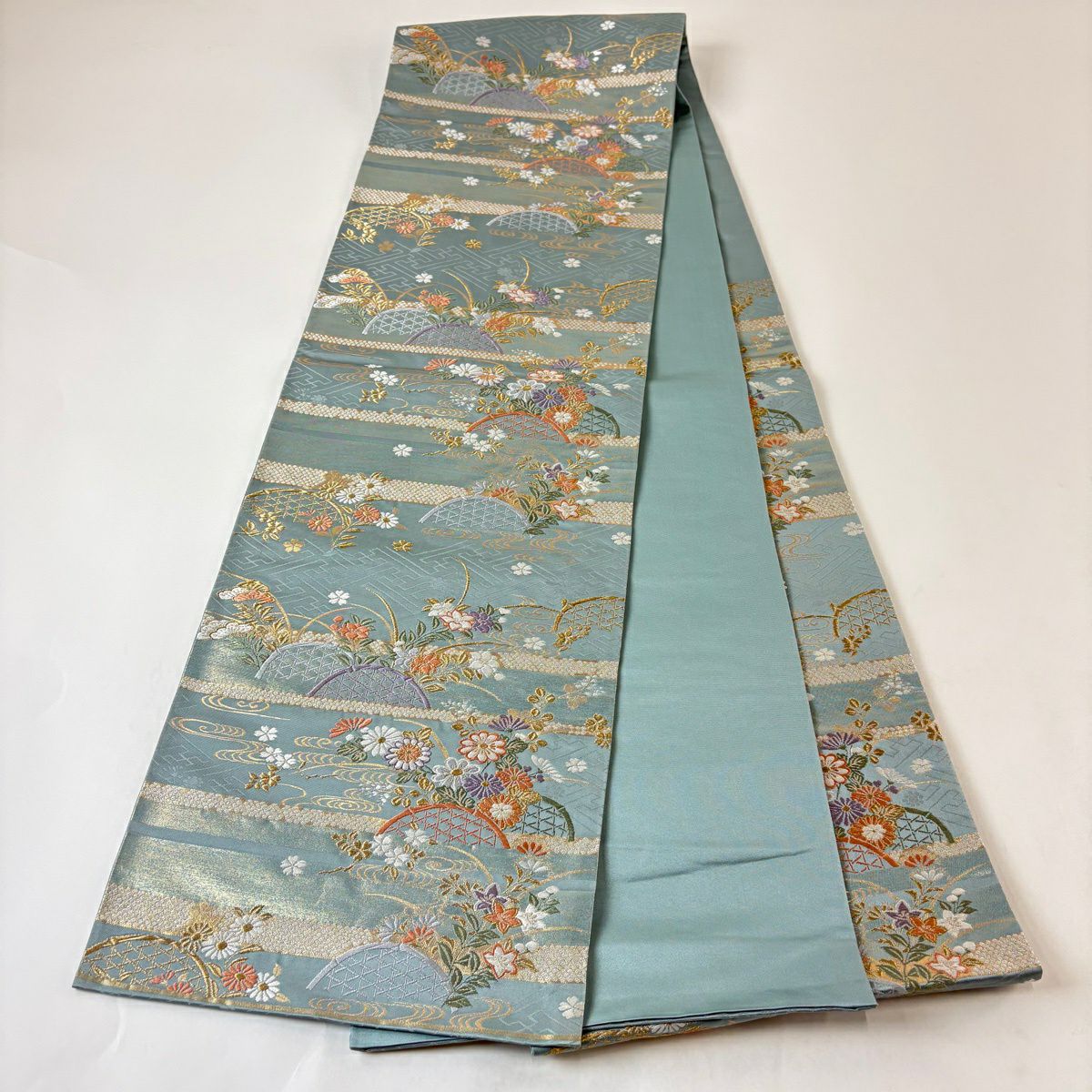 【美品】 袋帯 秀品 源氏車 草花 箔 金糸 薄緑 六通 正絹