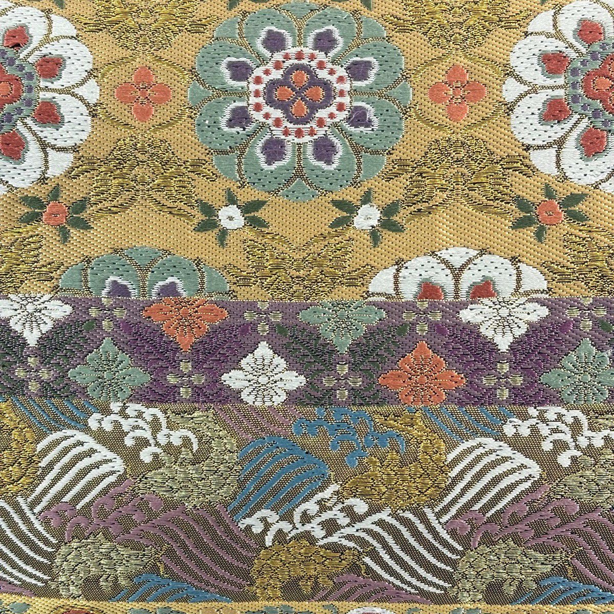 【美品】 袋帯 秀品 草花 波 金銀糸 箔 黄土色 六通 正絹
