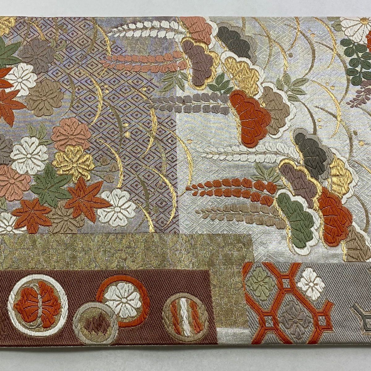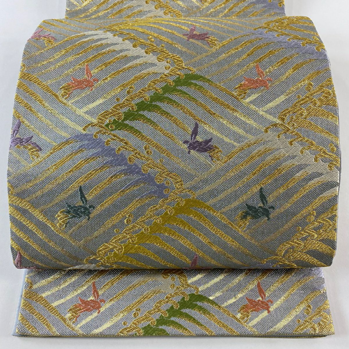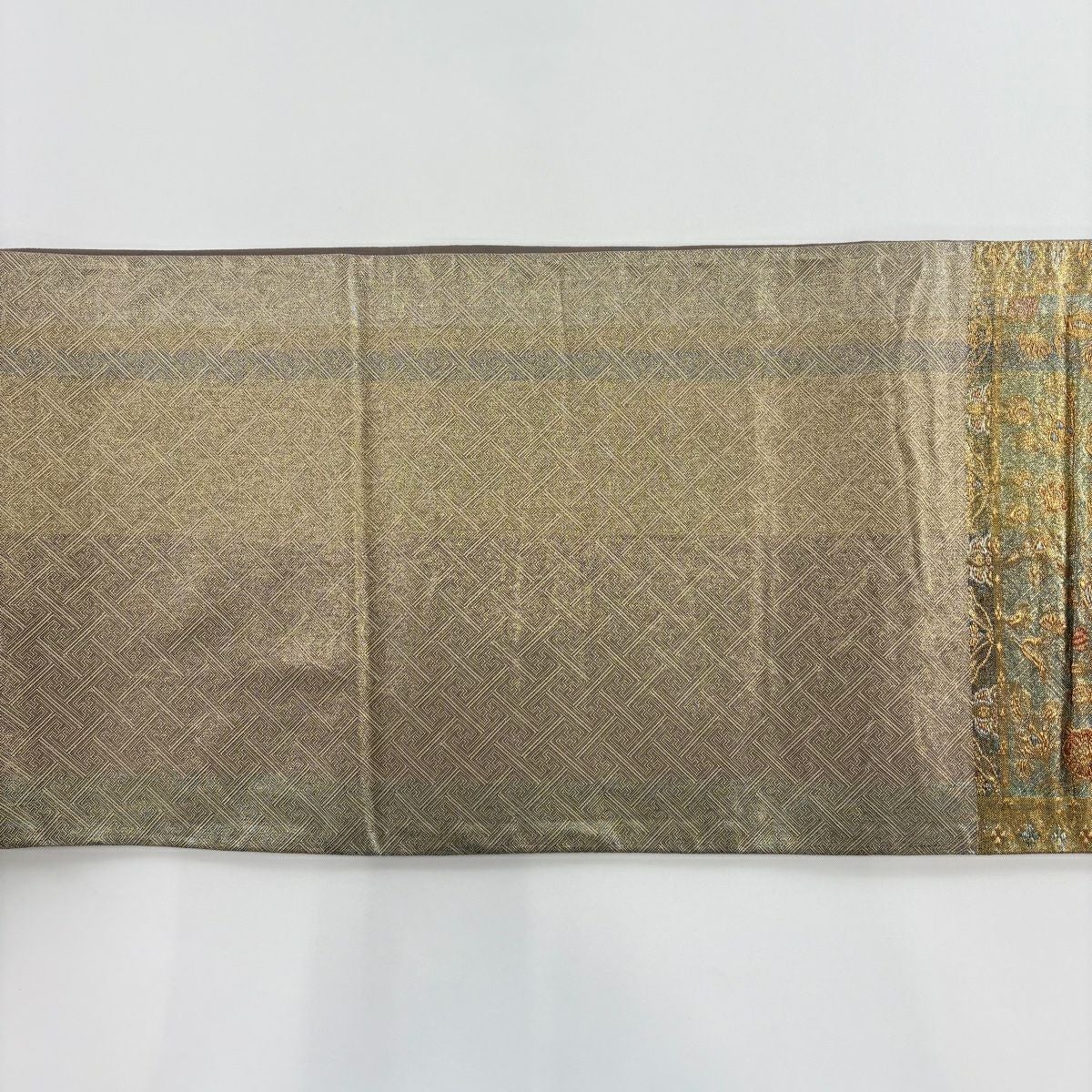 【在庫一掃】 袋帯 秀品 幾何学 金銀糸 灰色 お太鼓柄 正絹