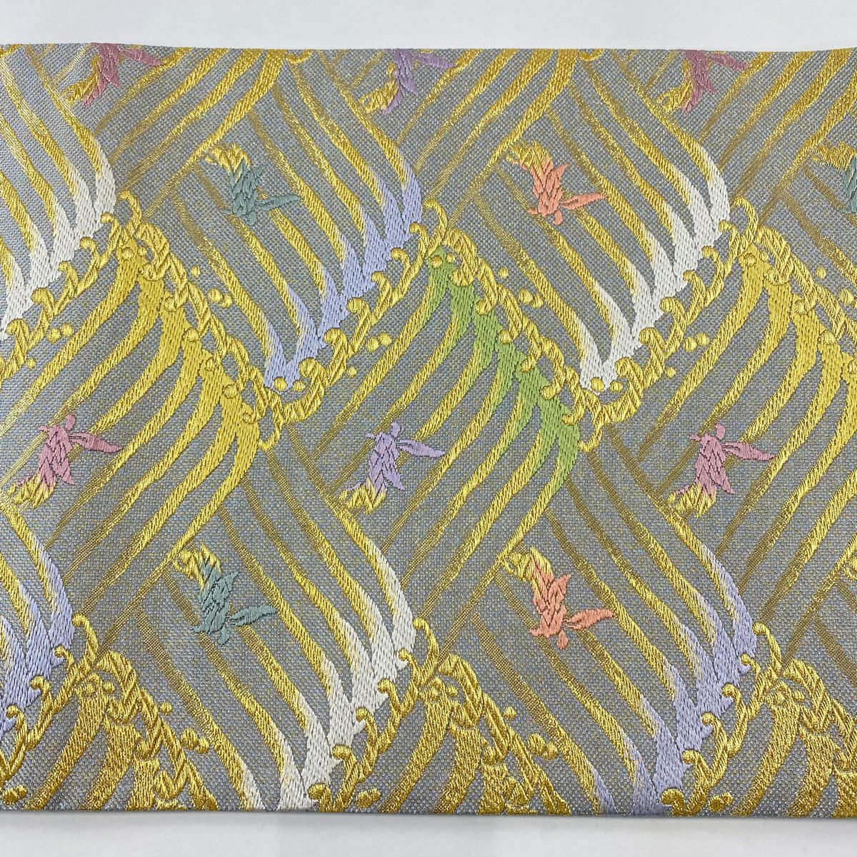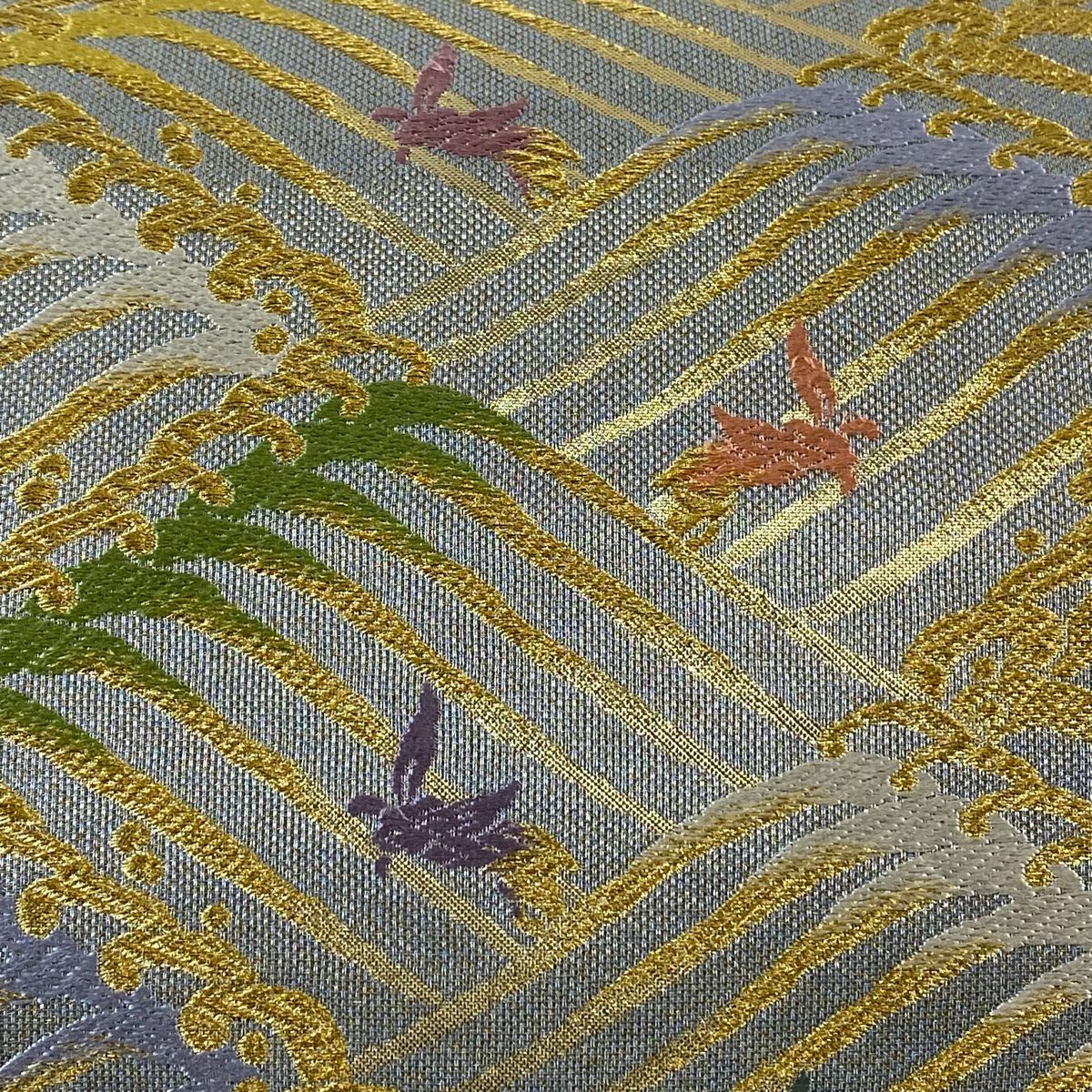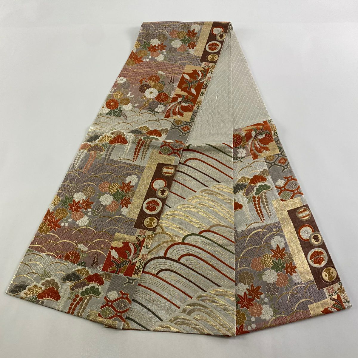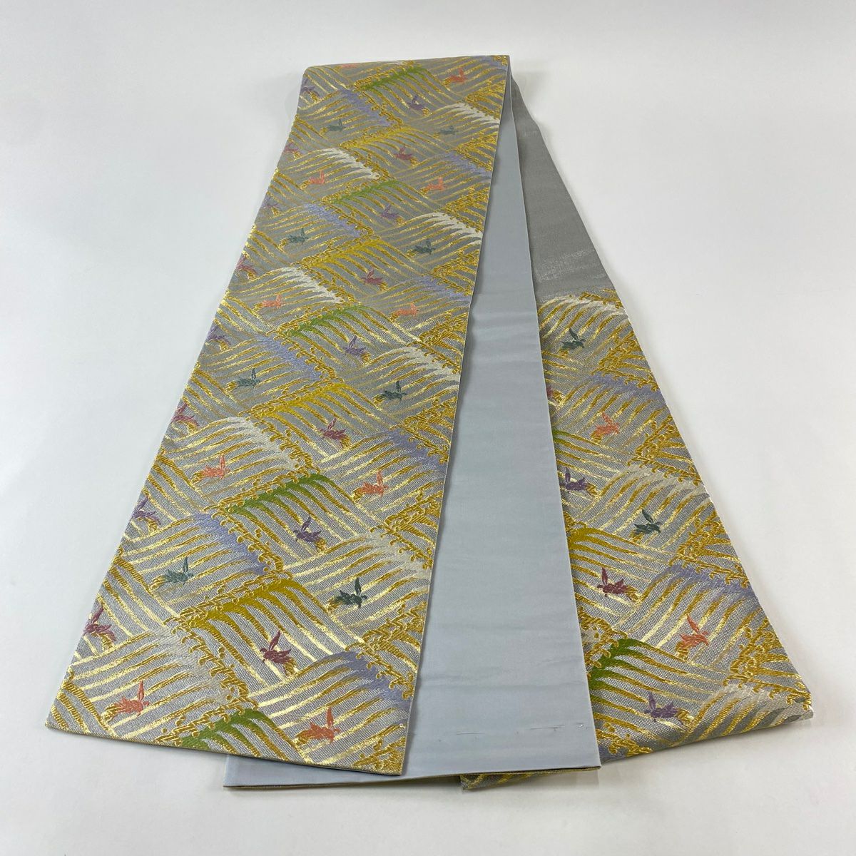 【在庫一掃】 袋帯 秀品 鳥 波 金銀糸 箔 銀色 六通 正絹