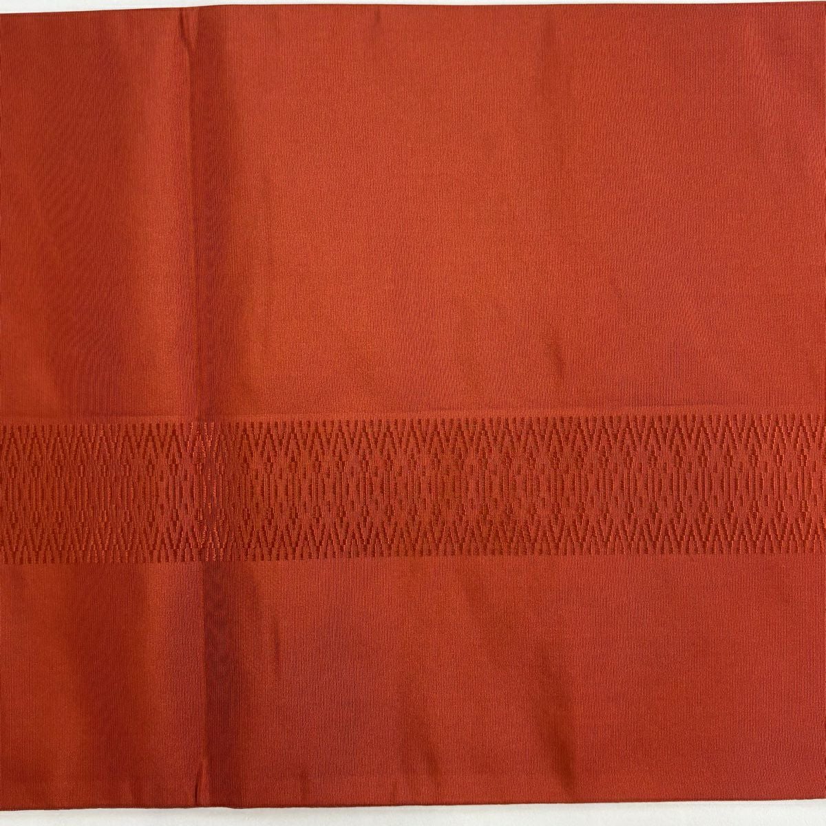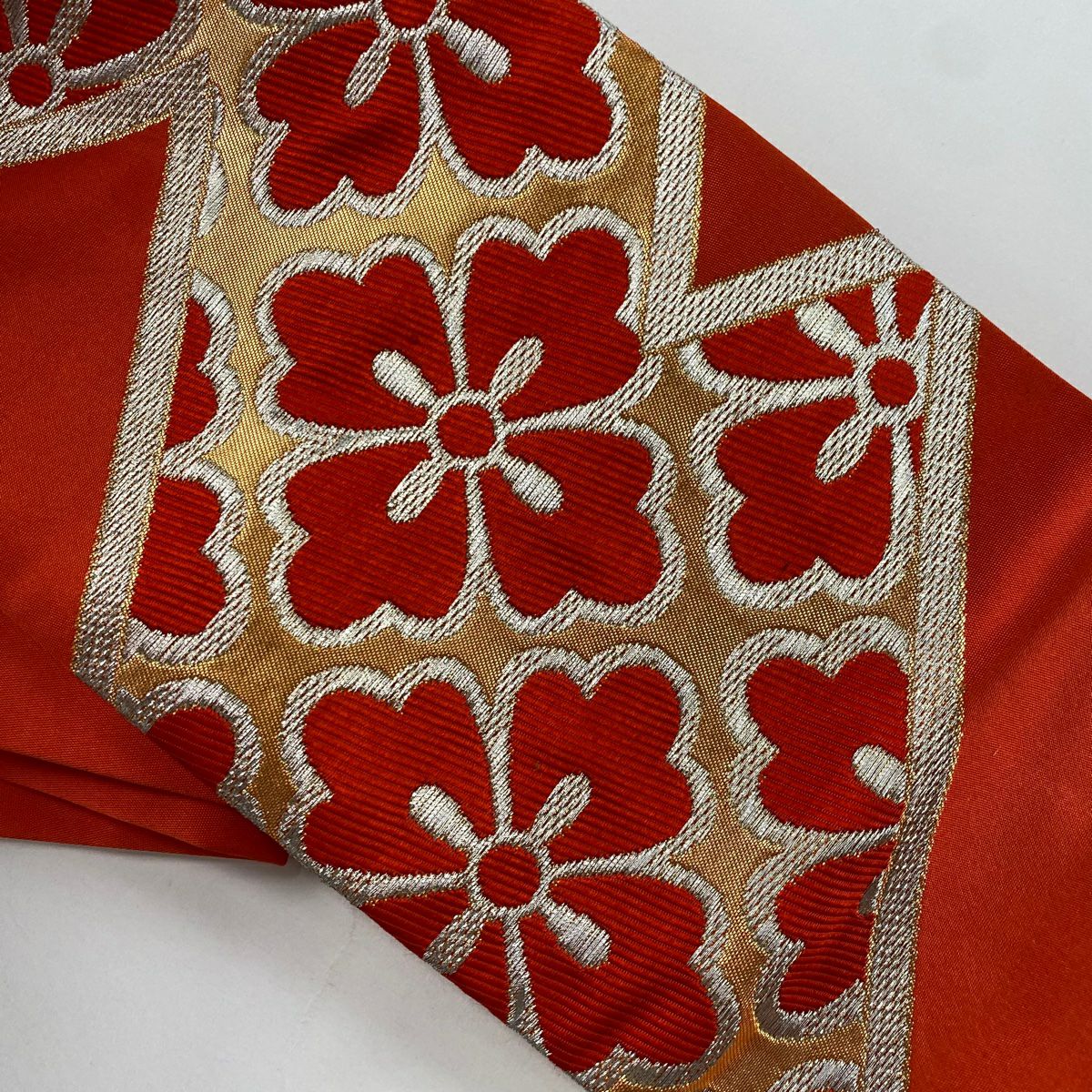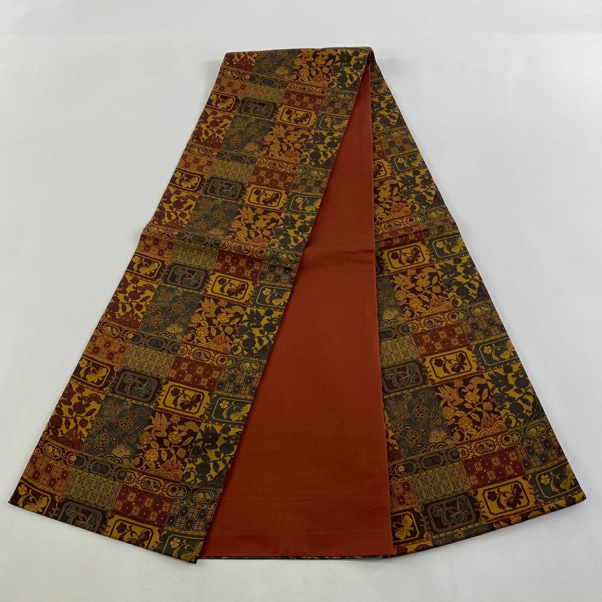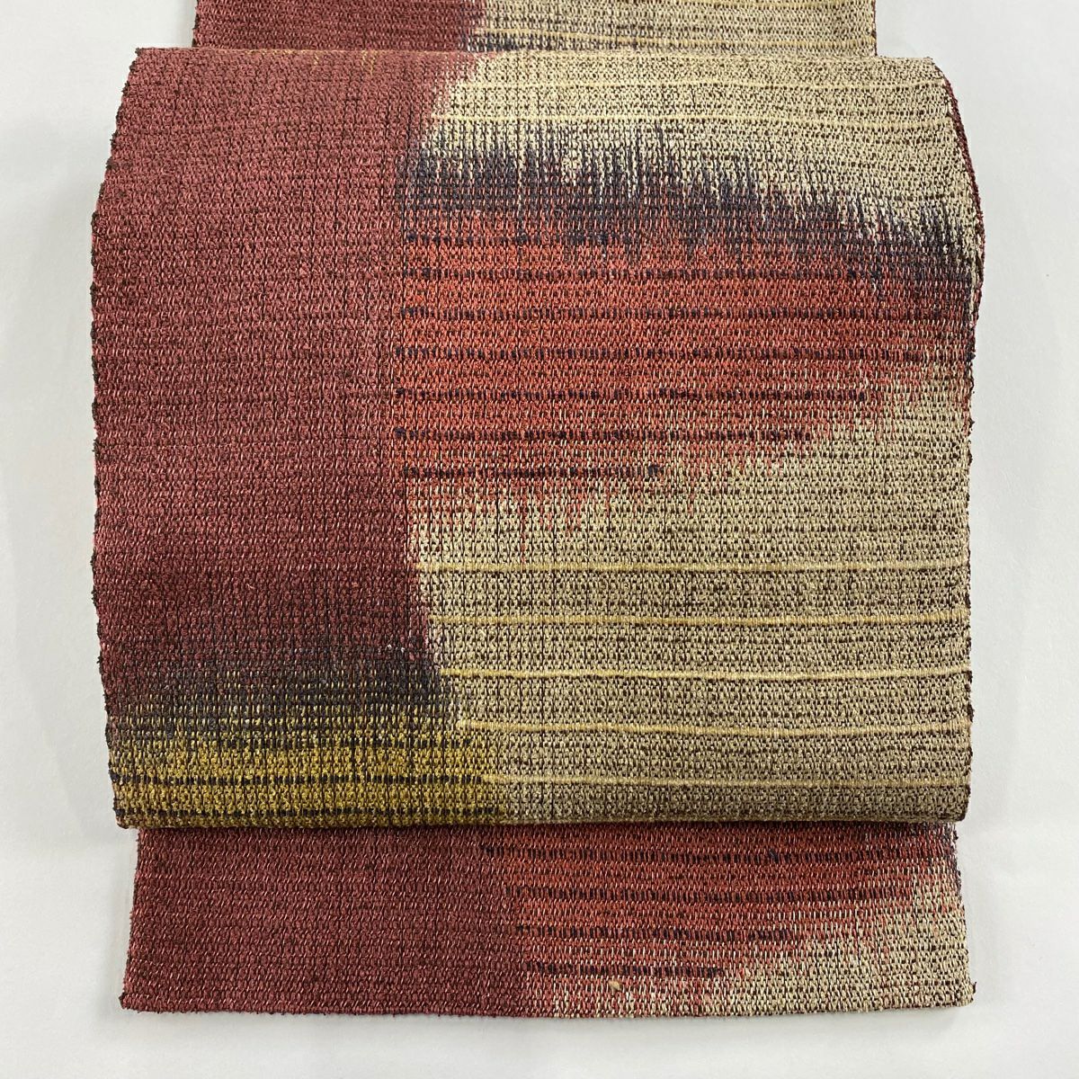 【在庫一掃】 名古屋帯 秀品 八寸名古屋帯 幾何学 金糸 赤茶 正絹