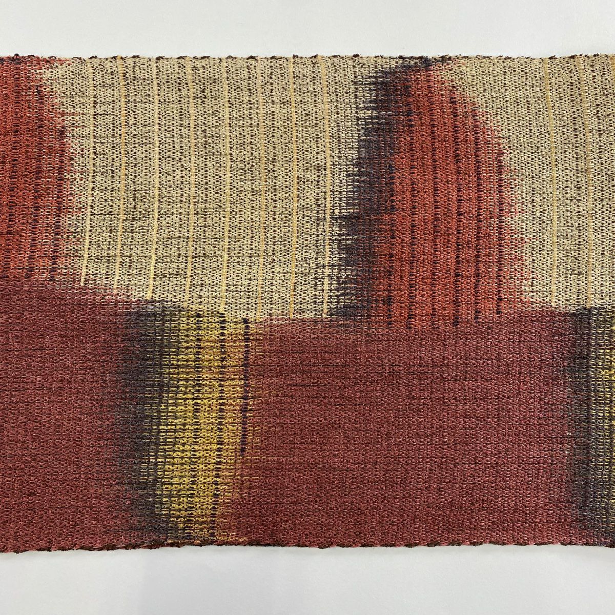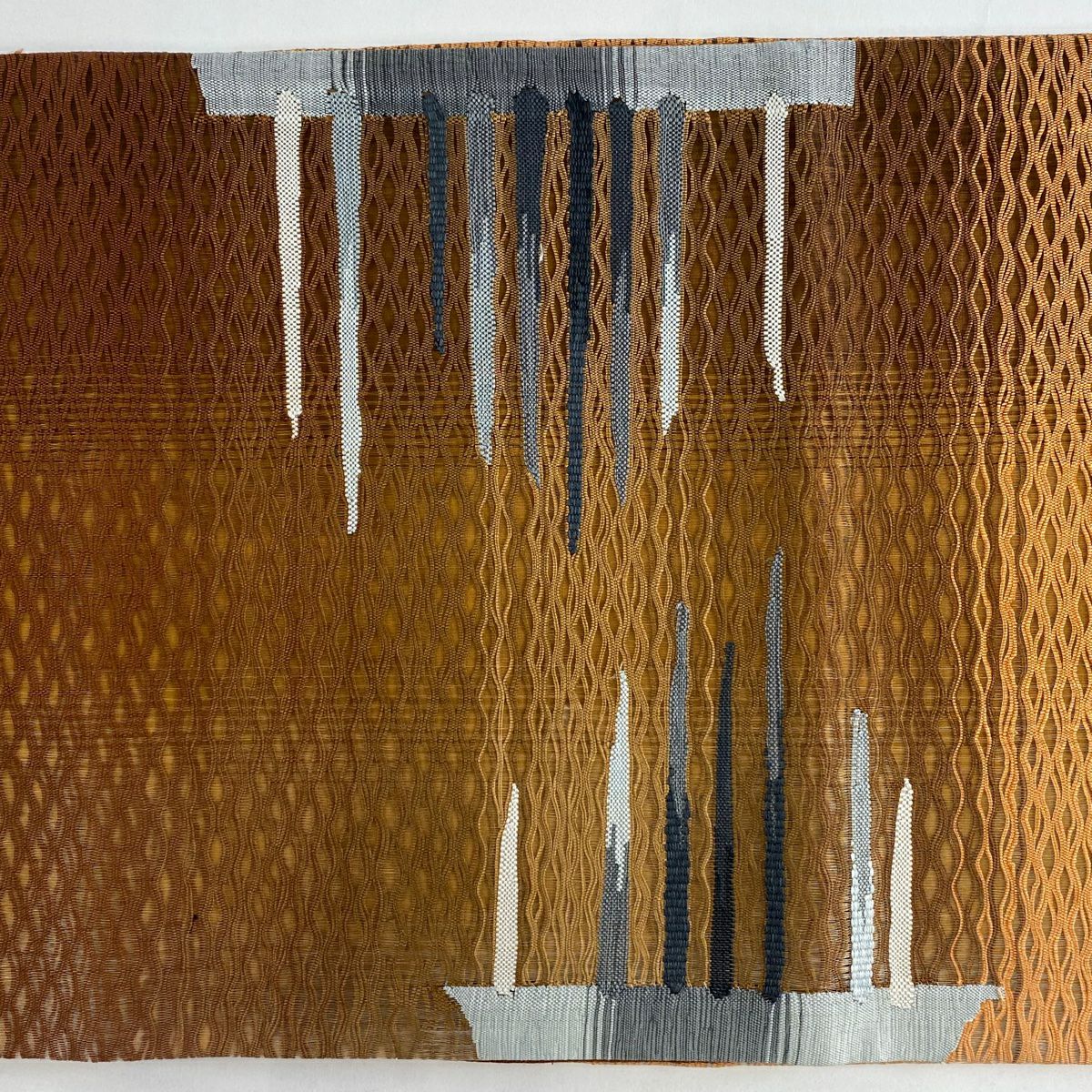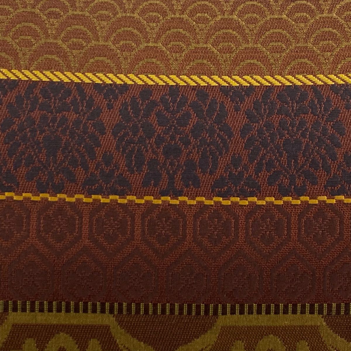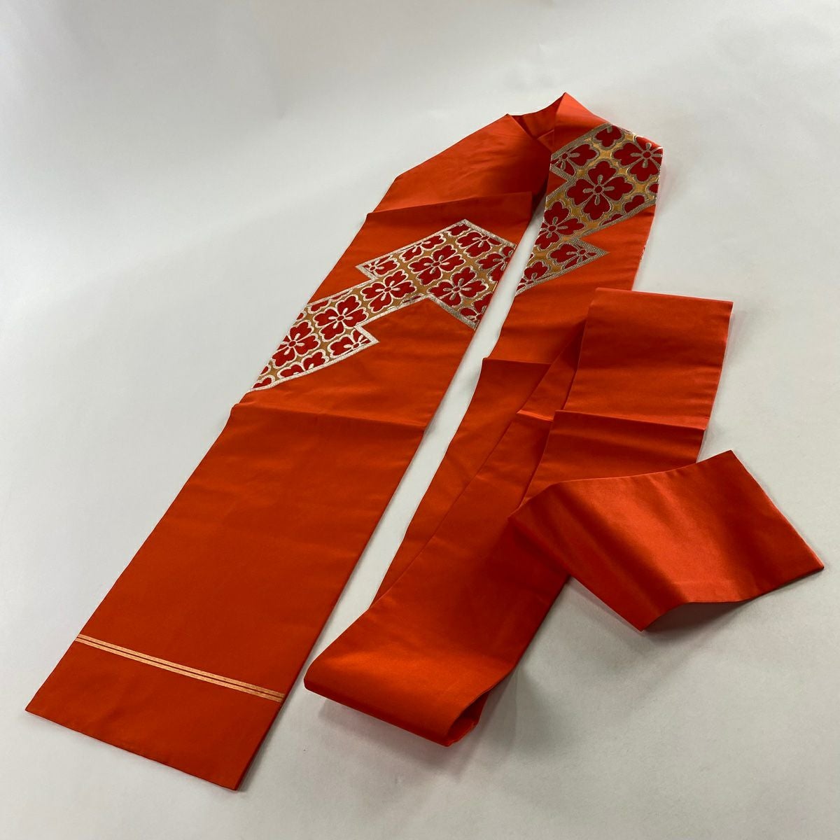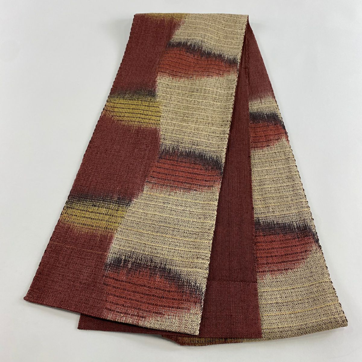 【在庫一掃】 名古屋帯 秀品 八寸名古屋帯 幾何学 金糸 赤茶 正絹