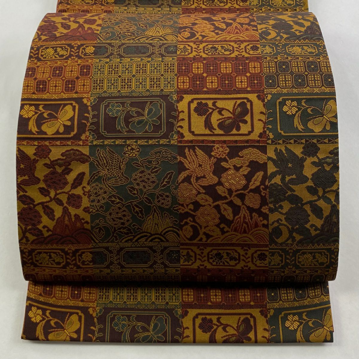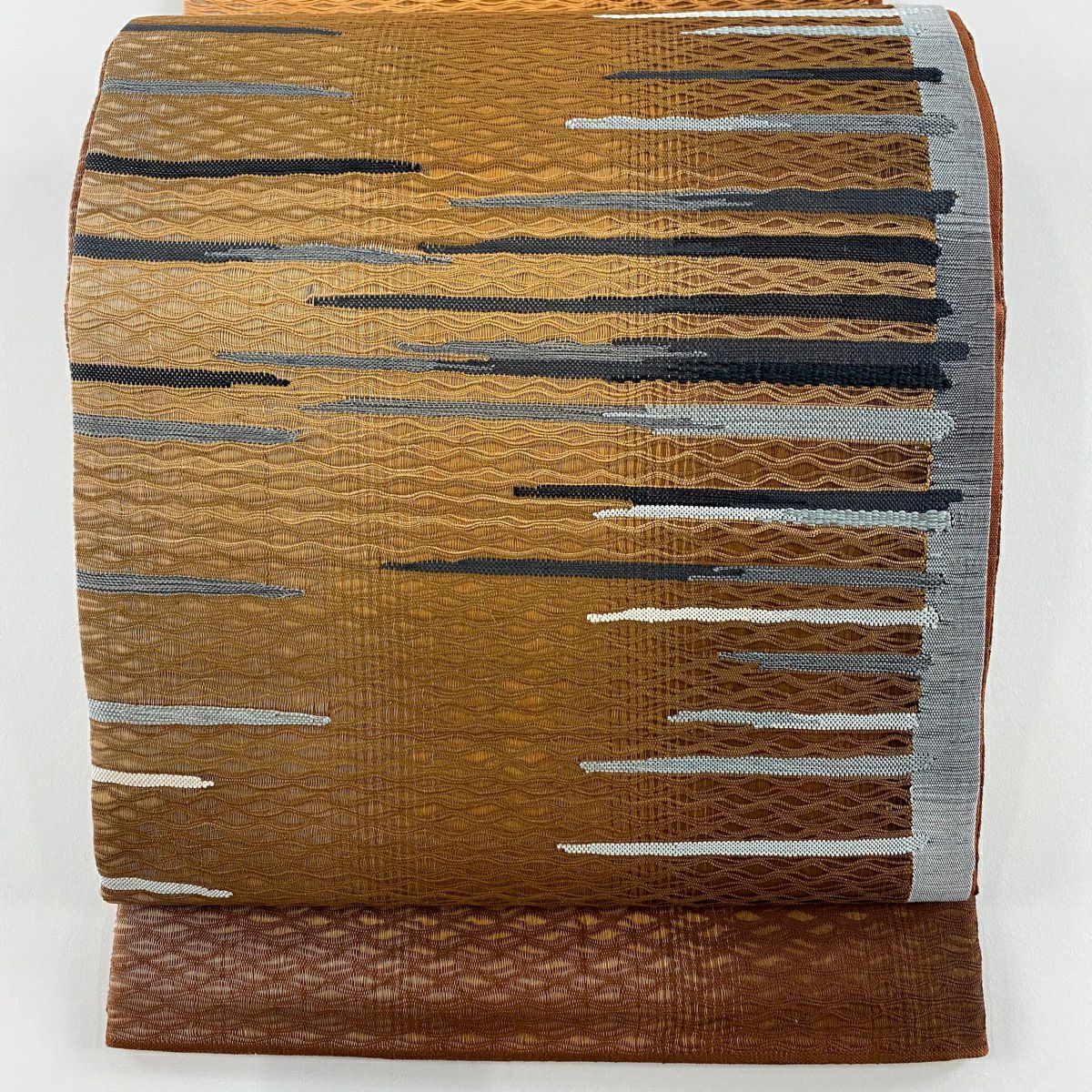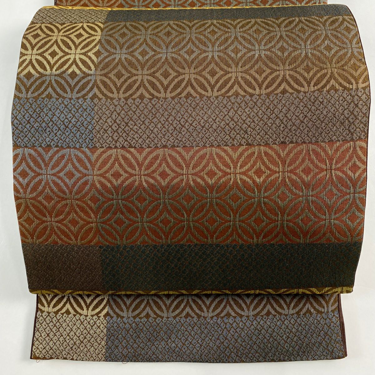 【在庫一掃】 【美品】 袋帯 秀品 幾何学 茶色 お太鼓柄 正絹
