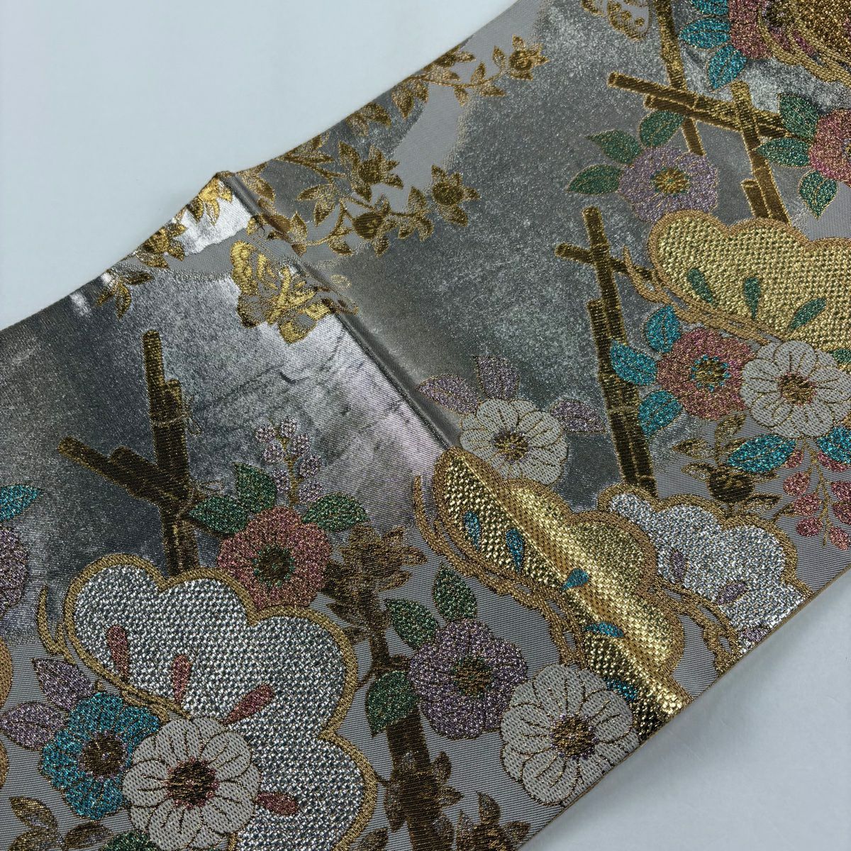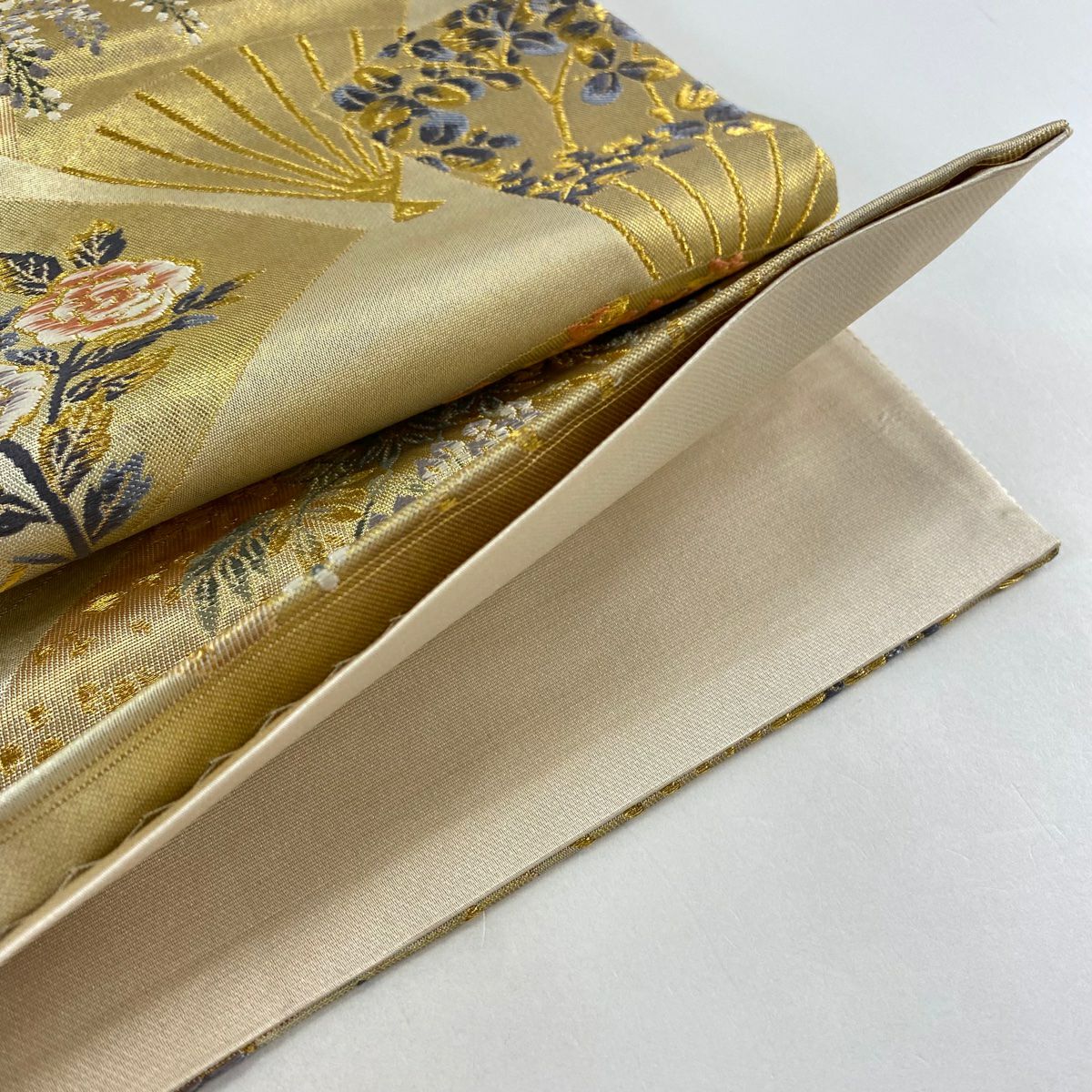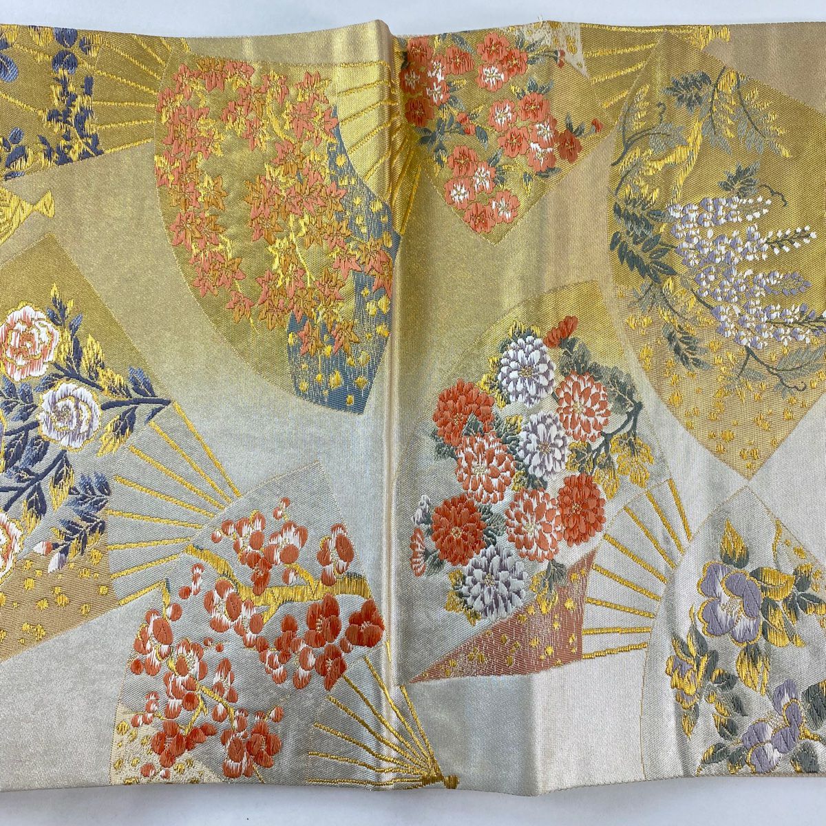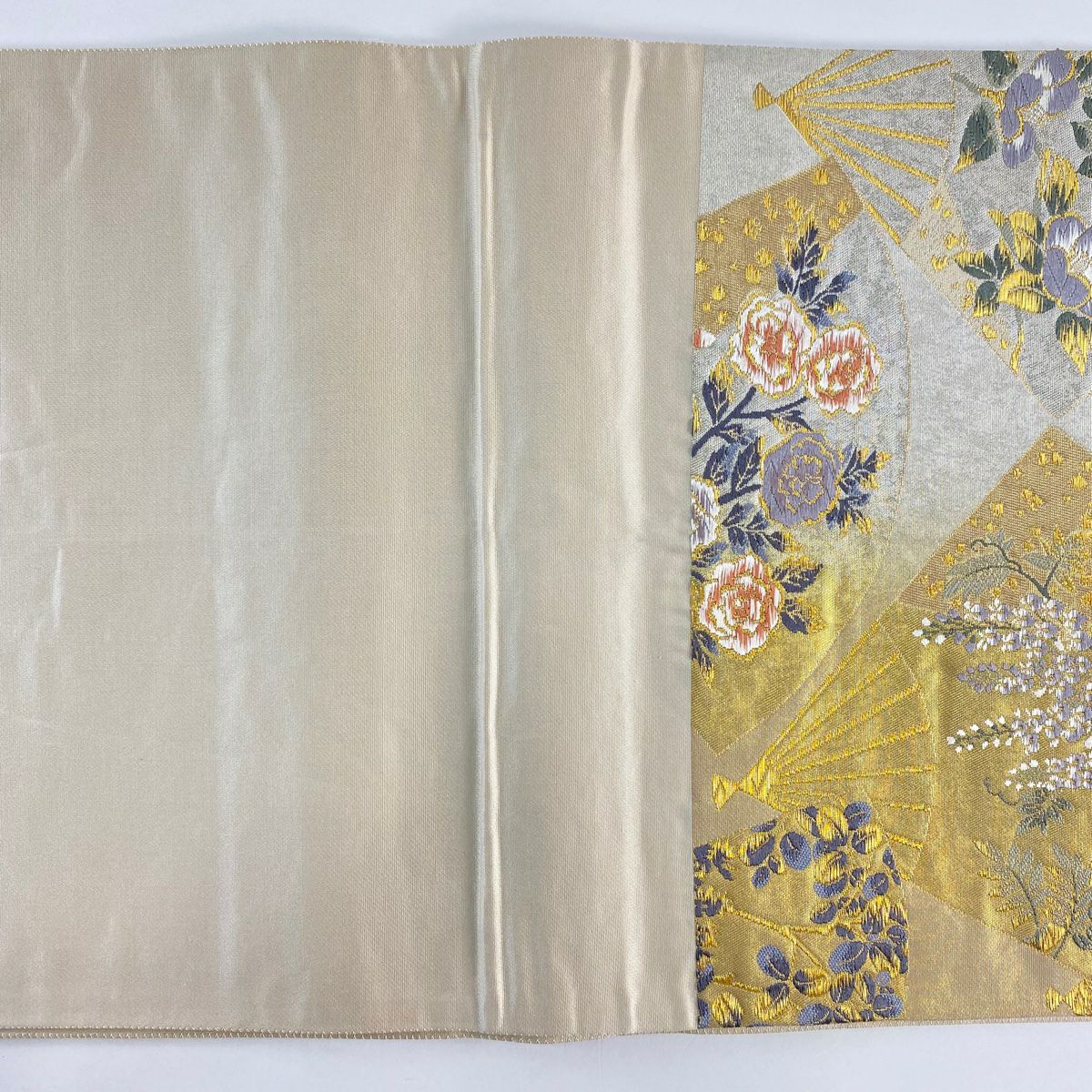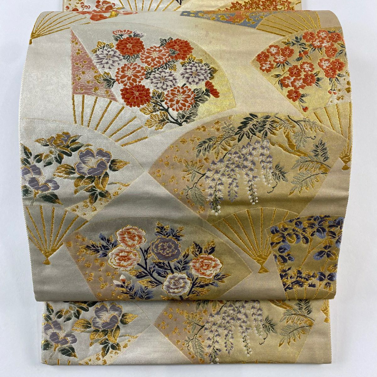 【在庫一掃】 袋帯 秀品 扇 草花 金糸 箔 灰白 六通 正絹