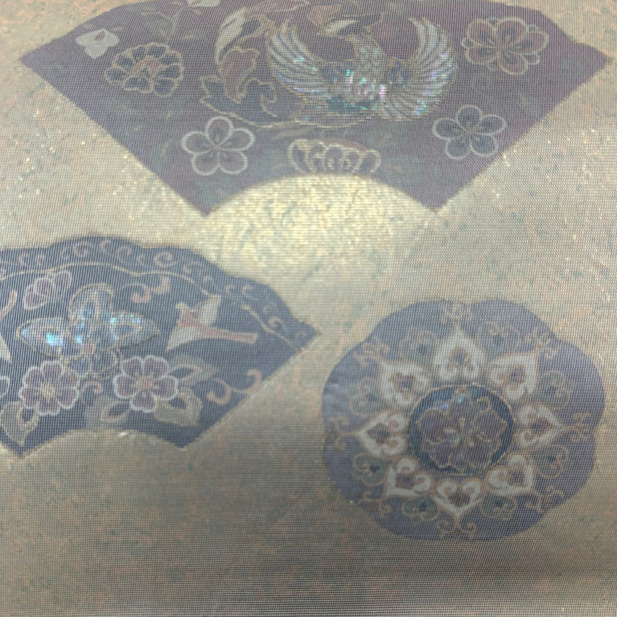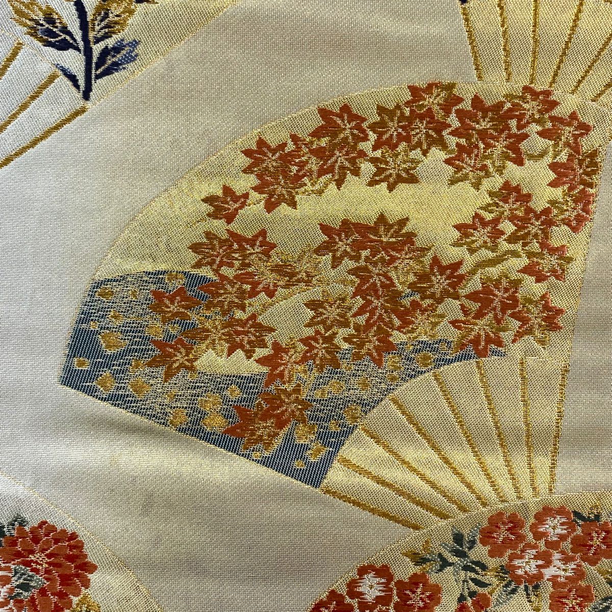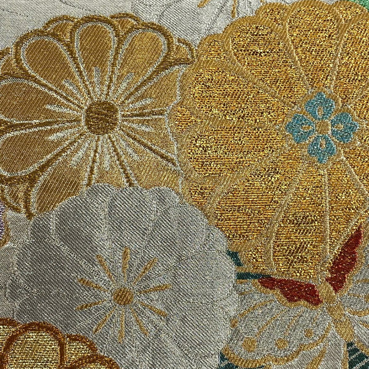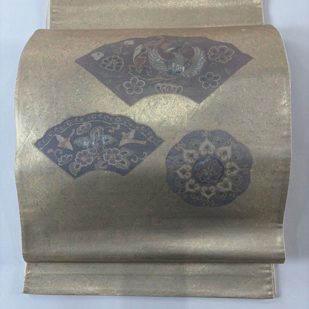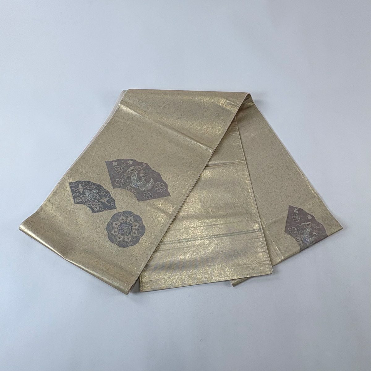 【在庫一掃】 袋帯 秀品 扇 草花 金糸 箔 灰白 六通 正絹