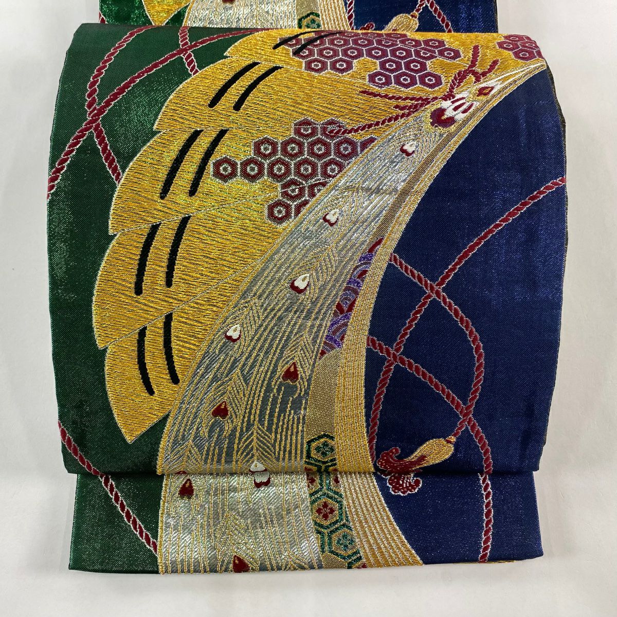 【在庫一掃】 袋帯 秀品 組紐 亀甲 箔 金糸 青 六通 正絹