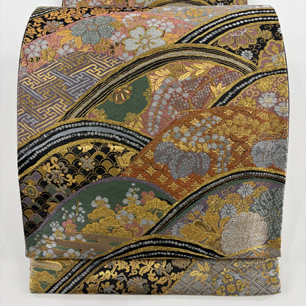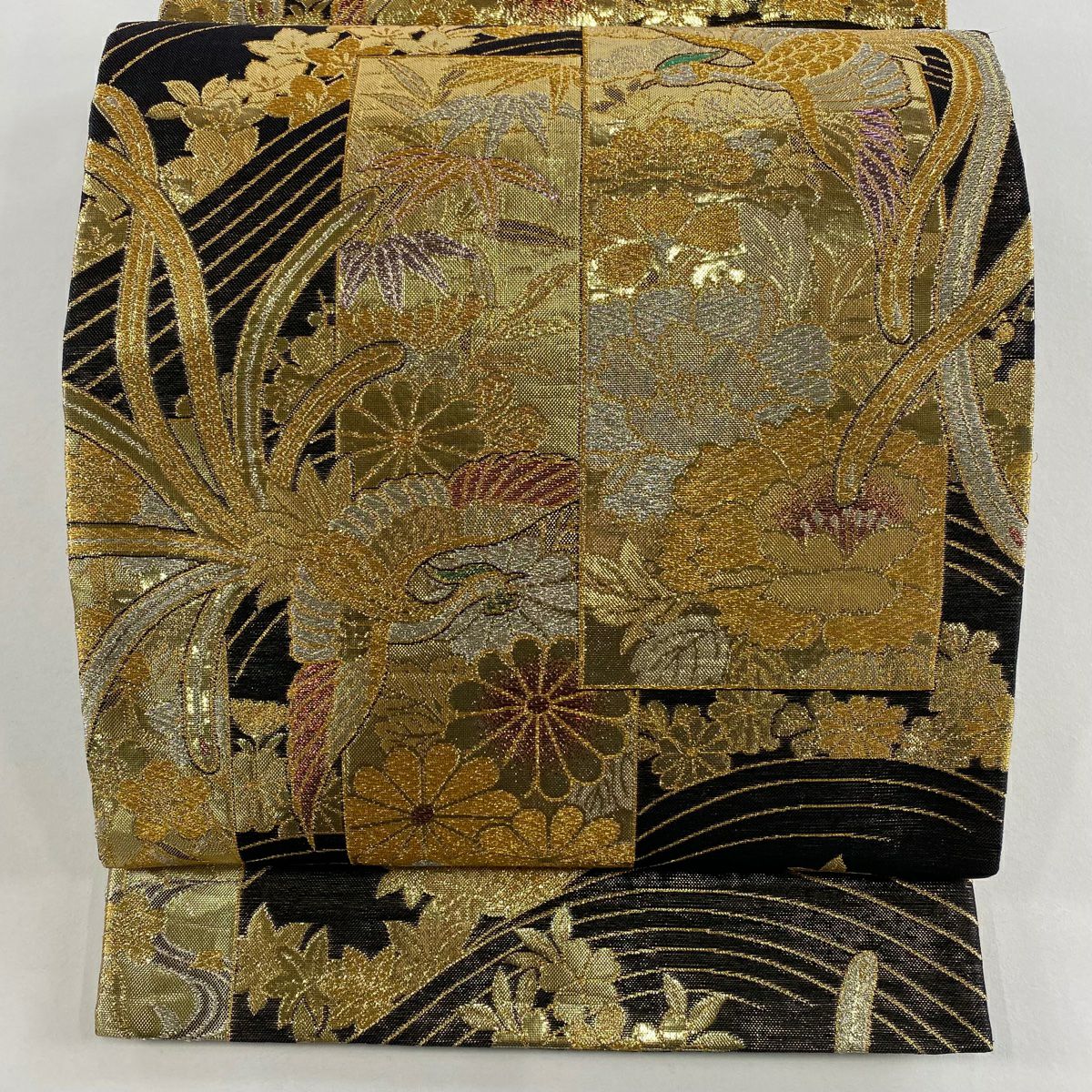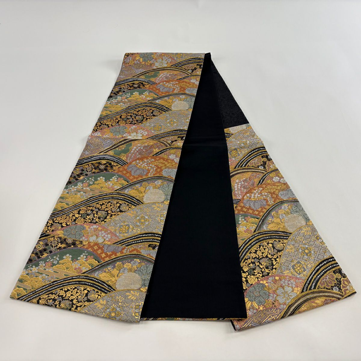 【在庫一掃】 袋帯 秀品 華文 波頭 金糸 箔 黒 六通 正絹