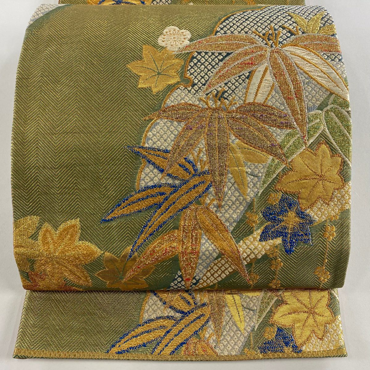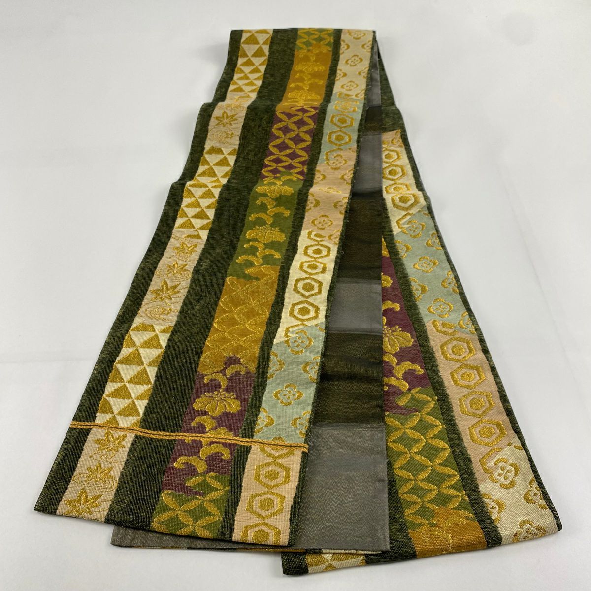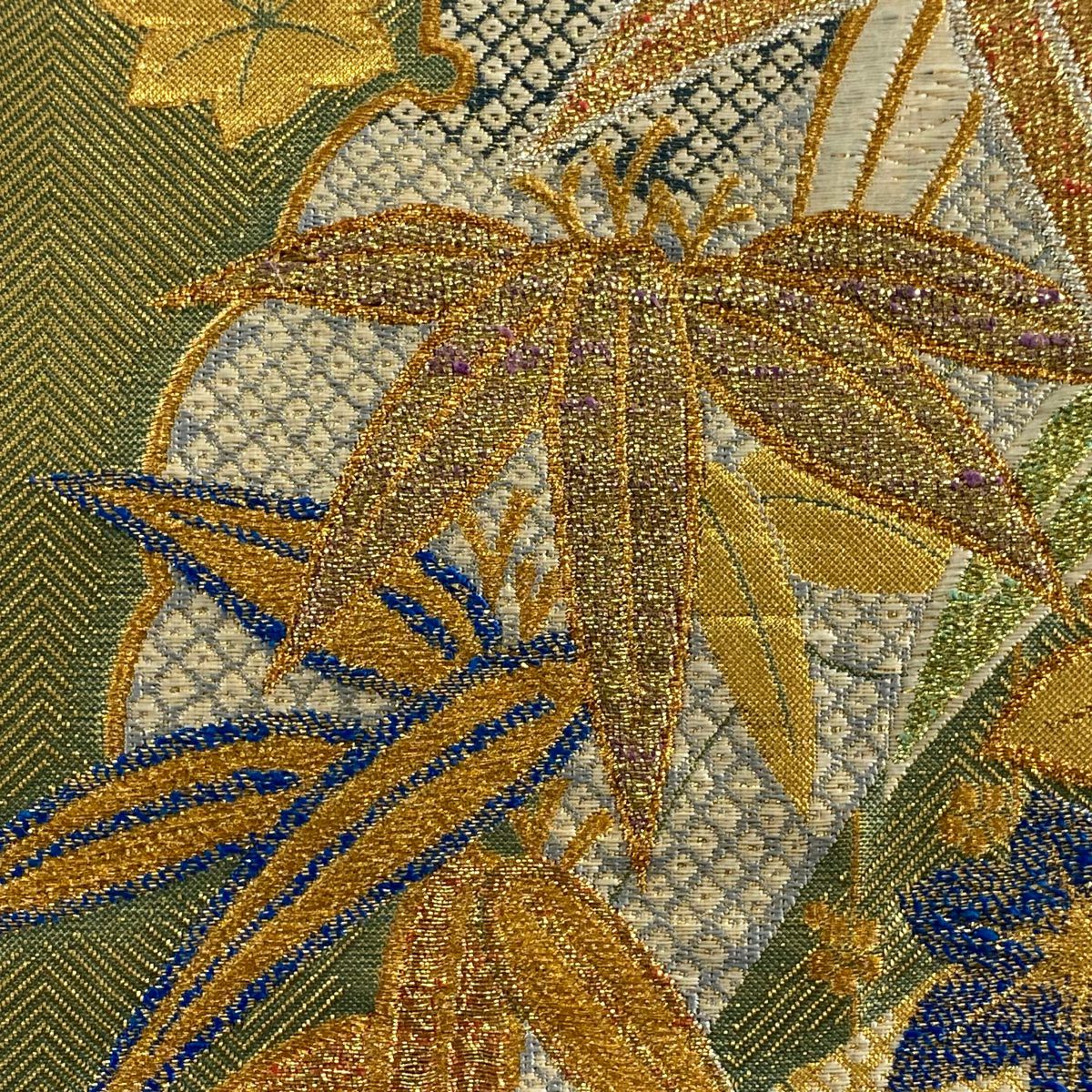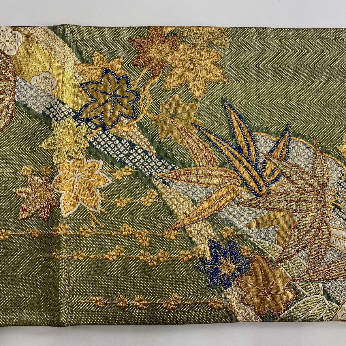 【在庫一掃】 袋帯 秀品 草花 斜縞 箔 金糸 緑 六通 正絹