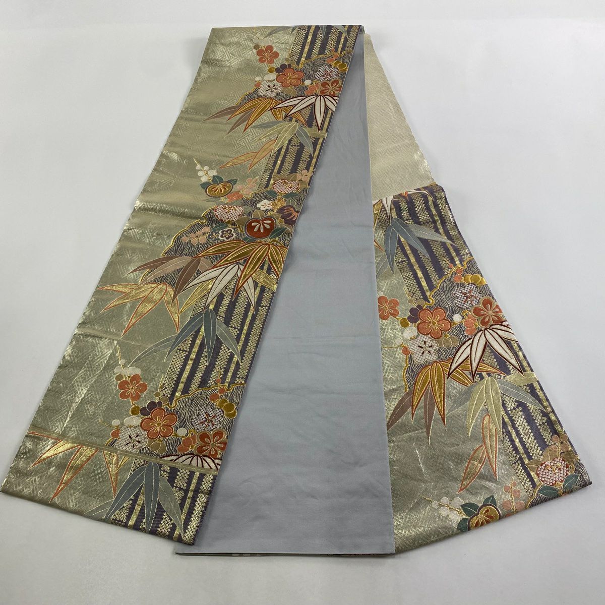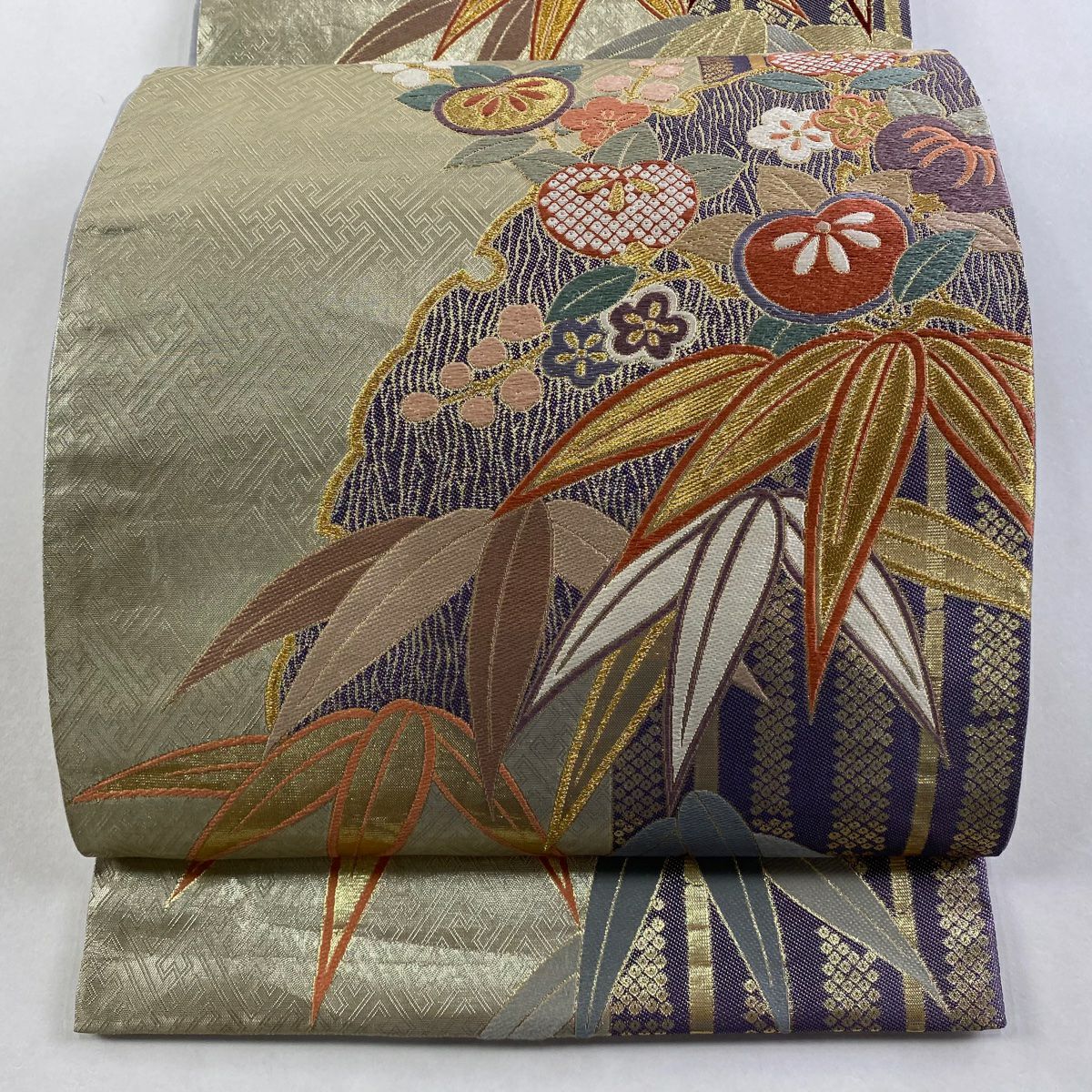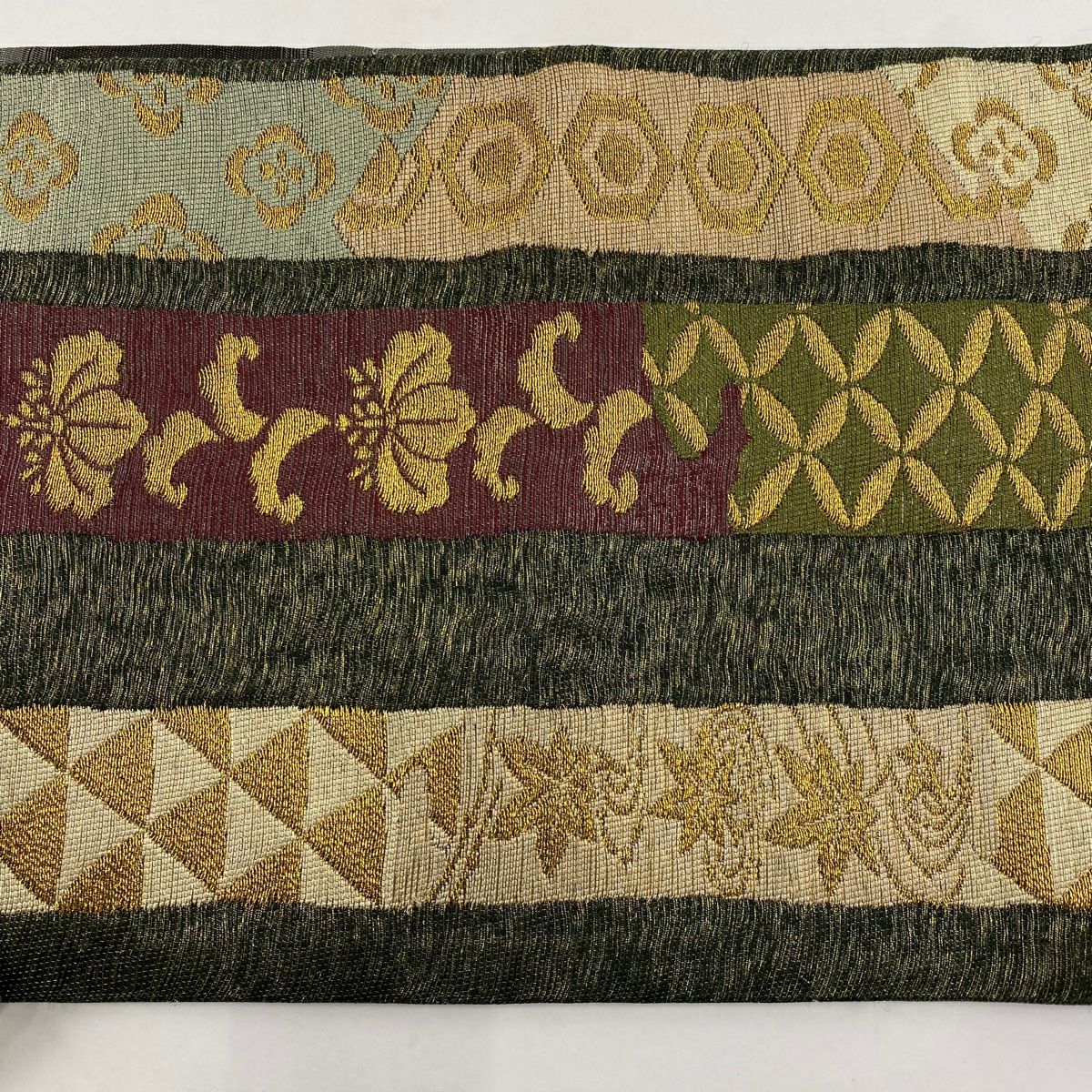 【在庫一掃】 袋帯 秀品 草花 斜縞 箔 金糸 緑 六通 正絹