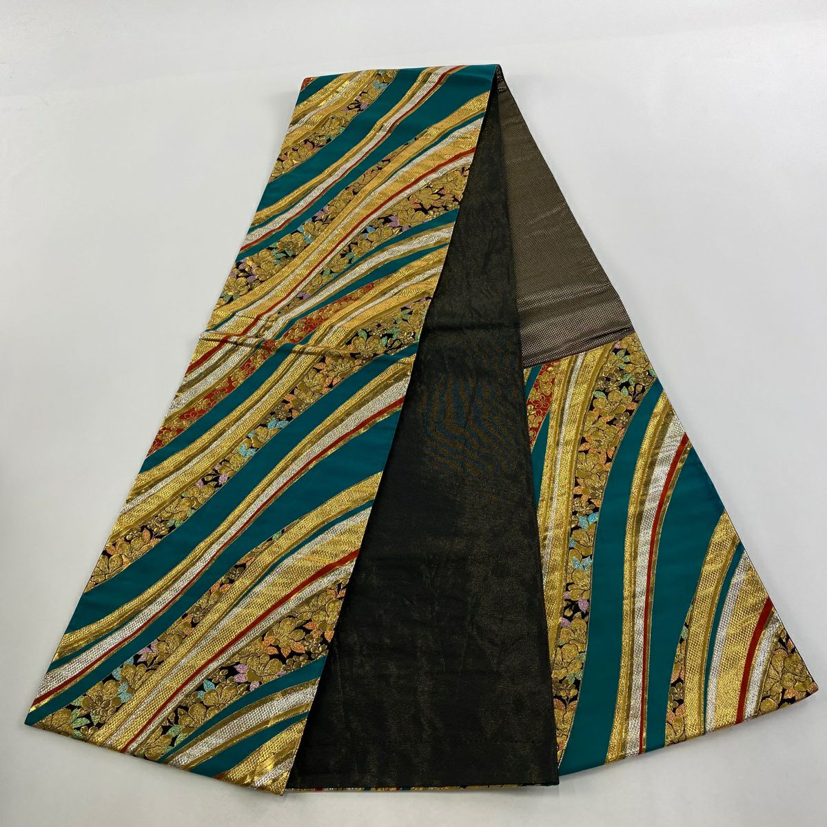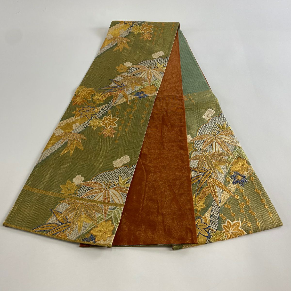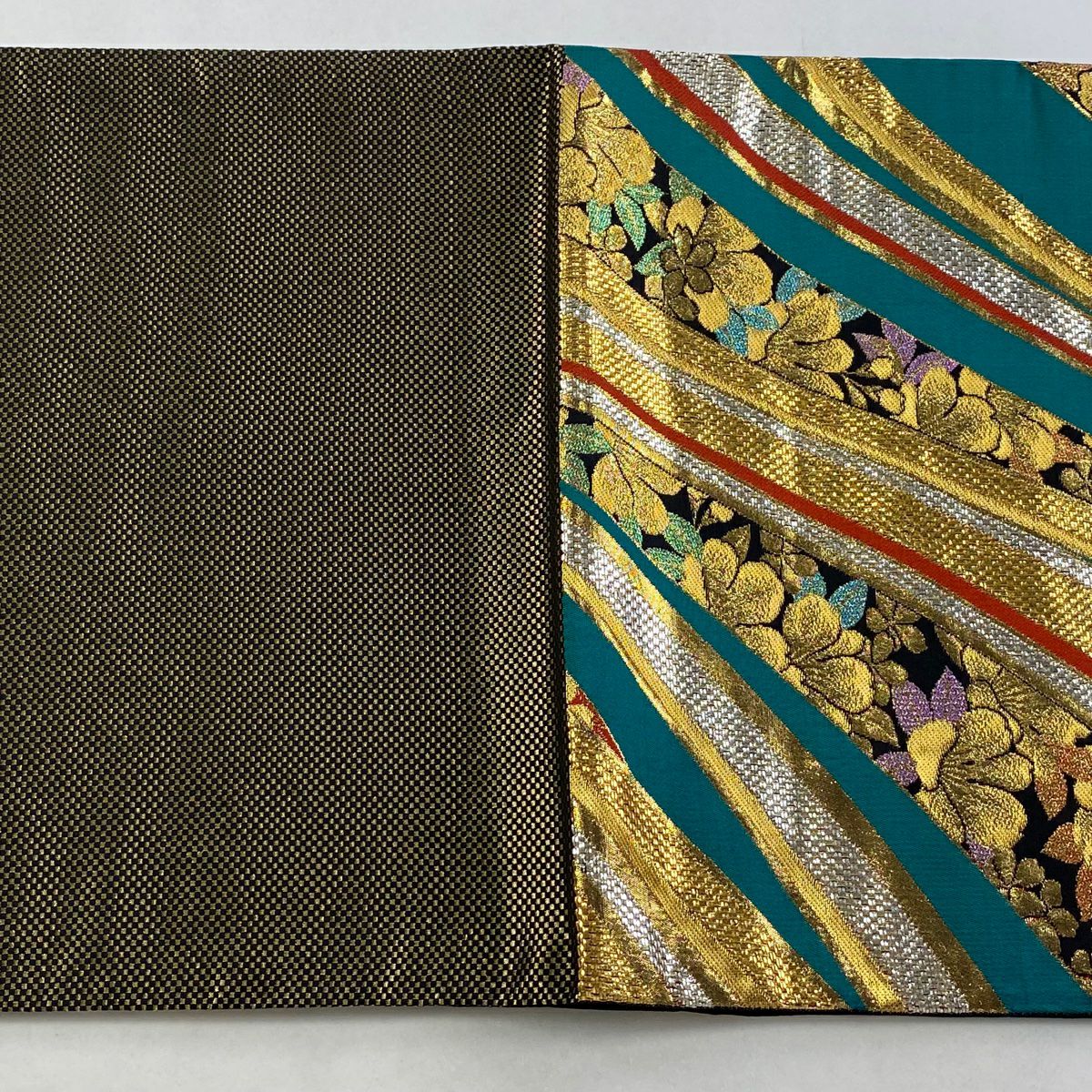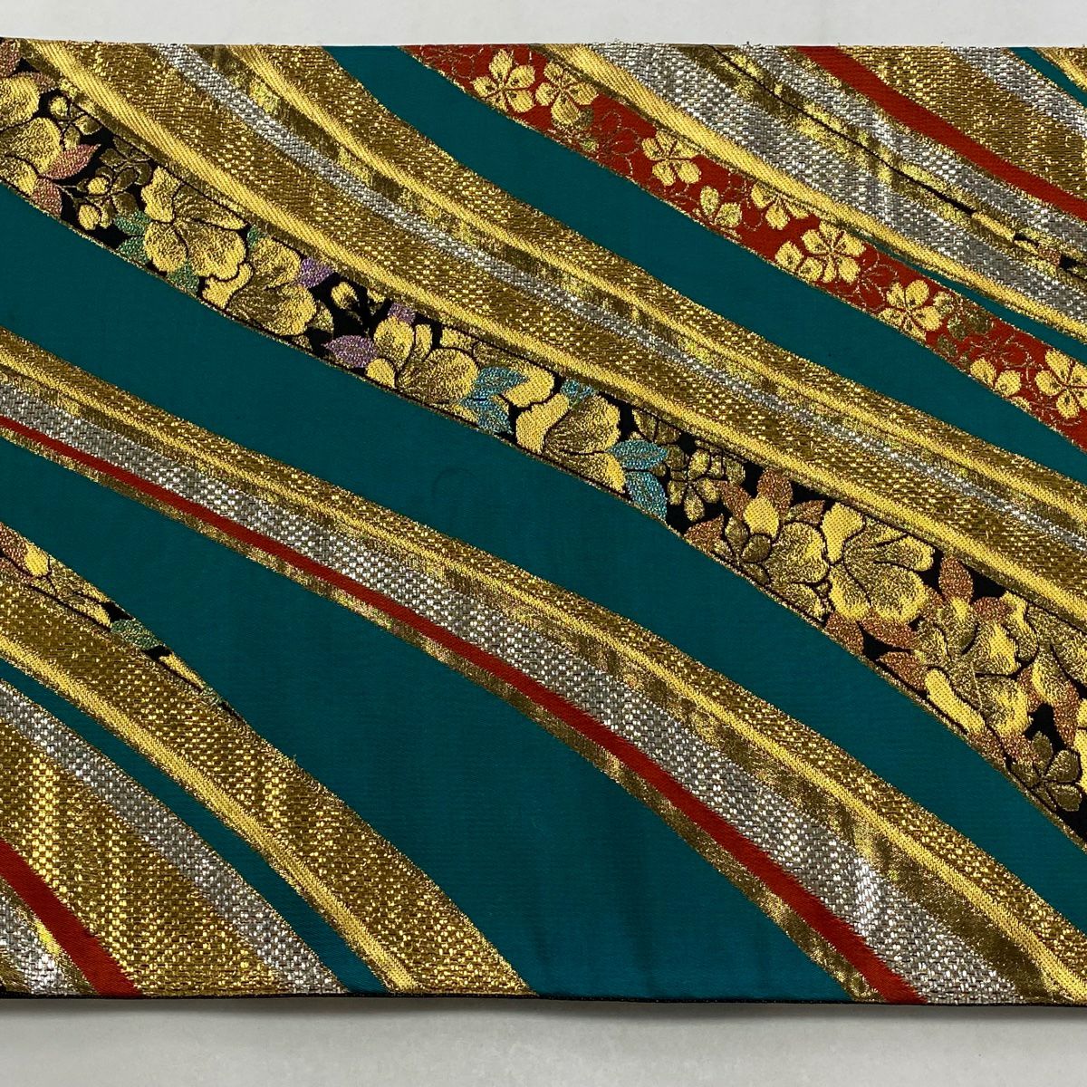 【在庫一掃】 袋帯 秀品 草花 斜縞 箔 金糸 緑 六通 正絹