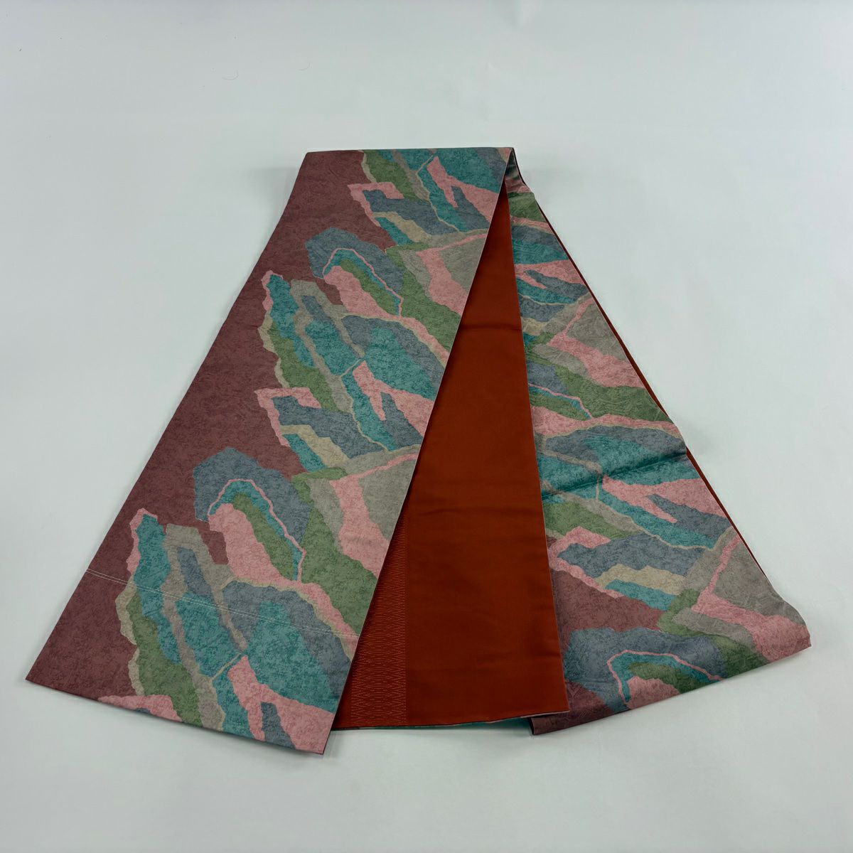 【在庫一掃】 【美品】 袋名古屋帯 秀品 幾何学模様 赤紫 正絹