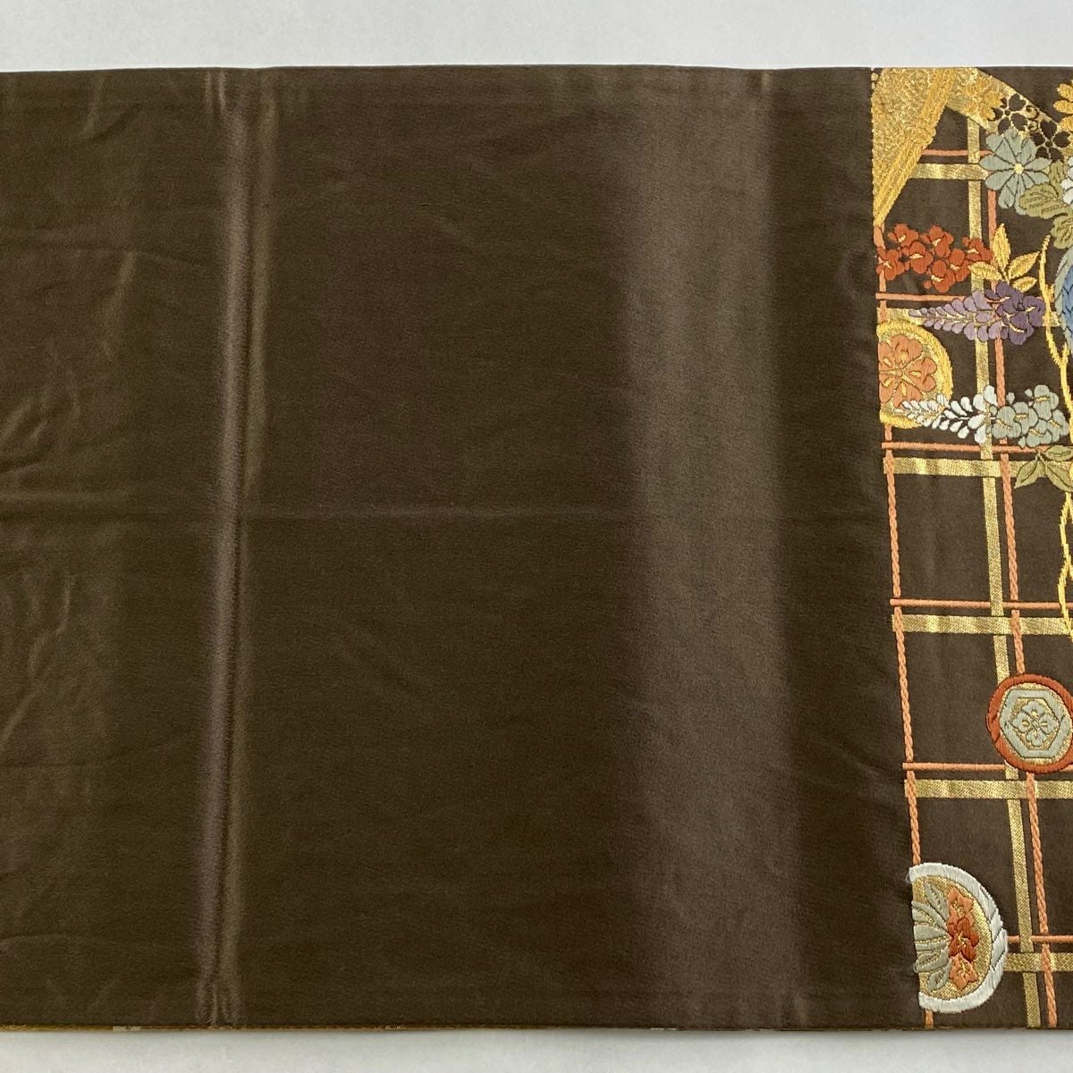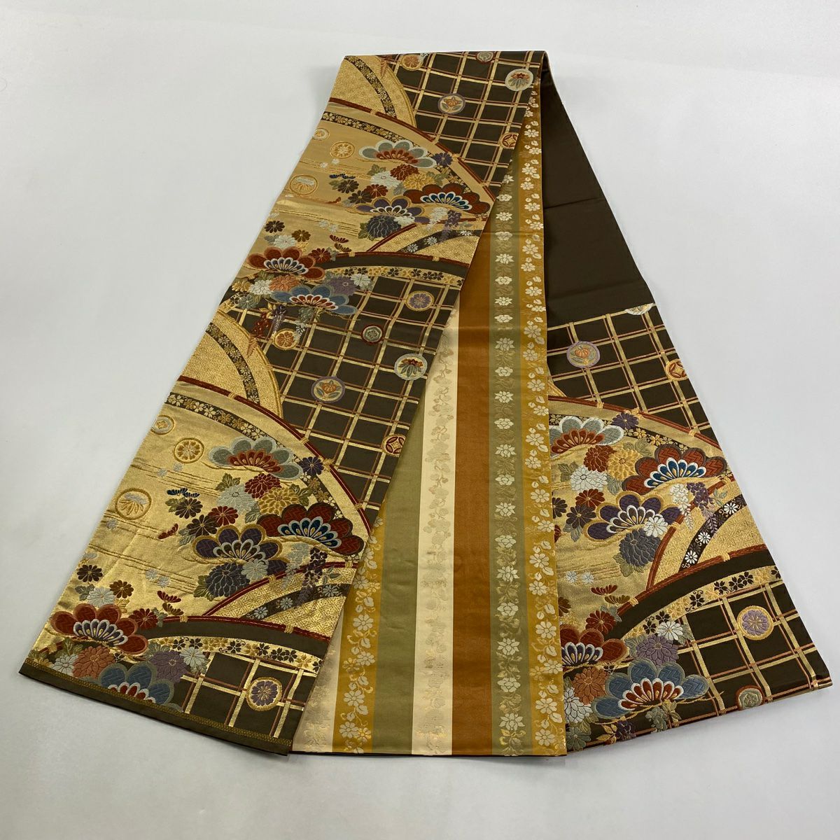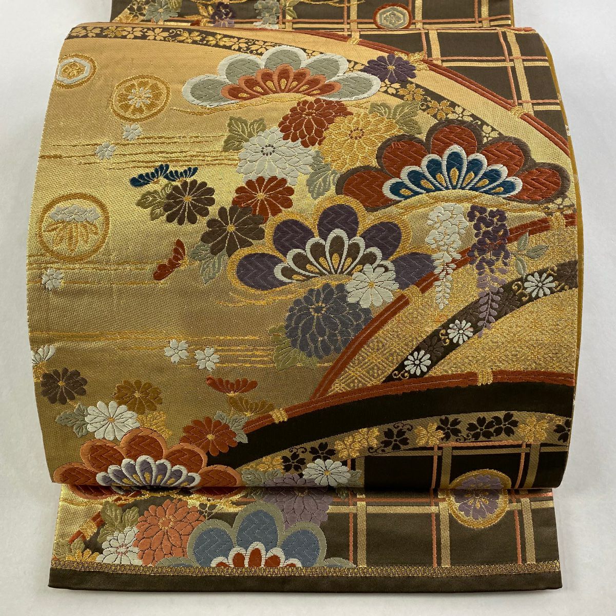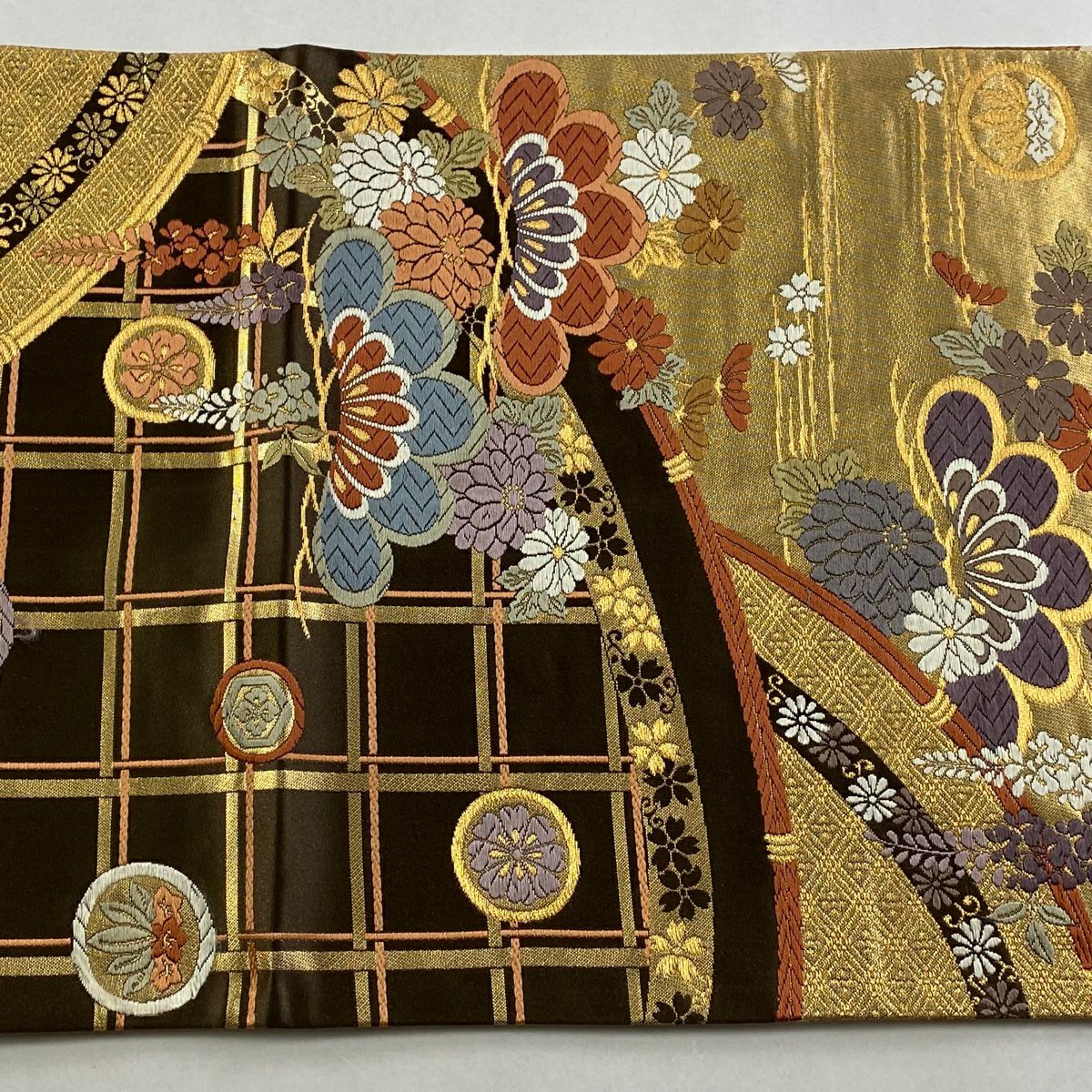 【在庫一掃】 袋帯 秀品 菊 松 金糸 箔 焦茶色 六通 正絹