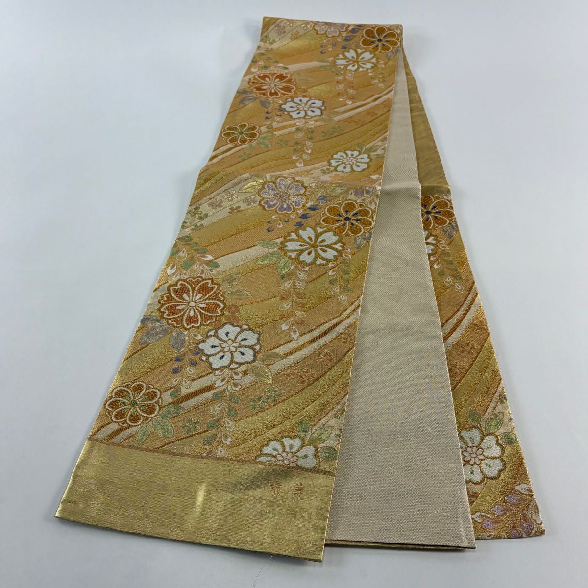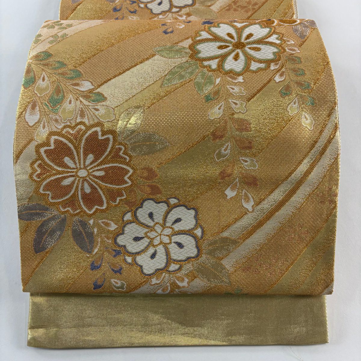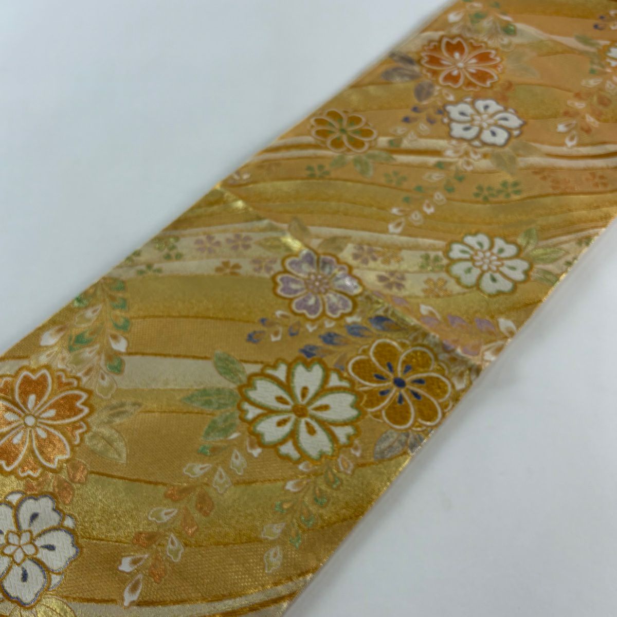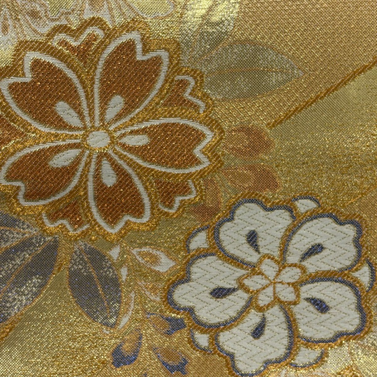【在庫一掃】 袋帯 秀品 桜 流水 金銀糸 箔 金色 六通 正絹