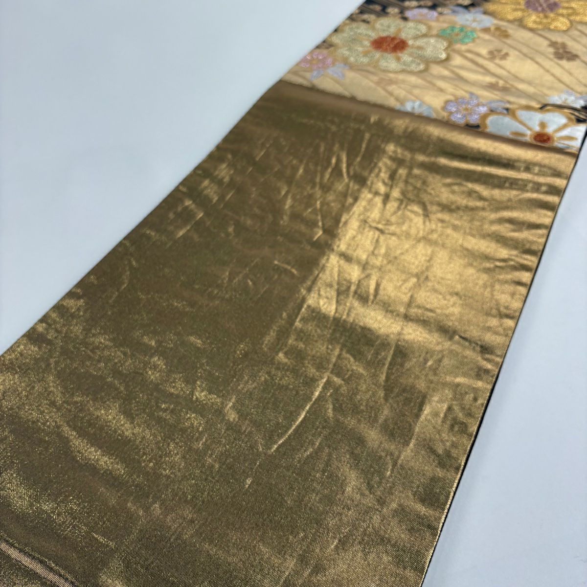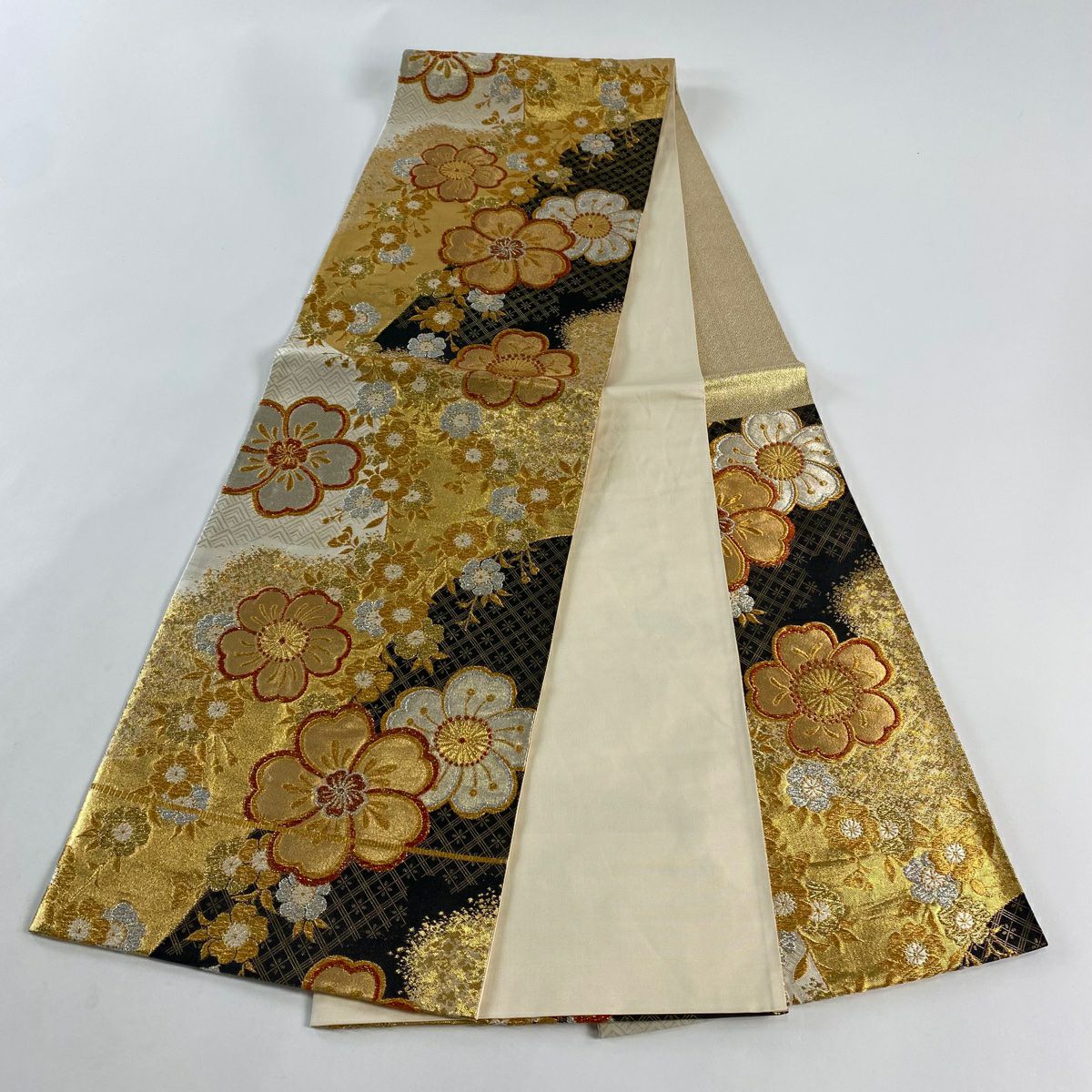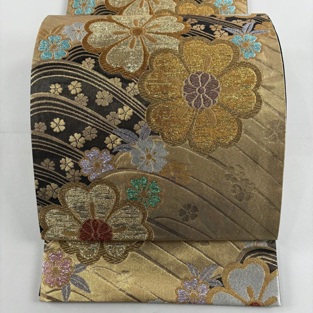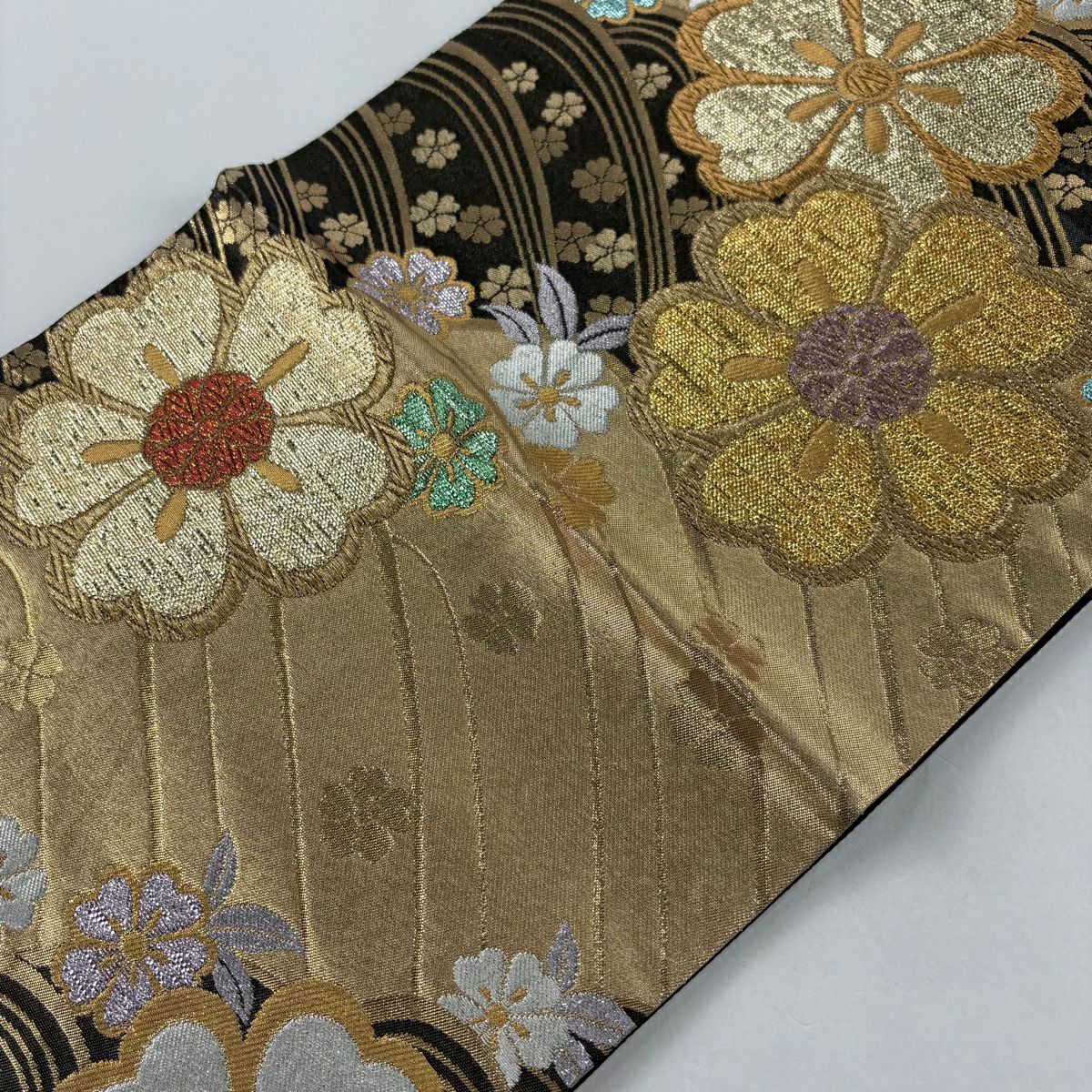 【在庫一掃】 袋帯 秀品 桜 流水 金銀糸 箔 金色 六通 正絹